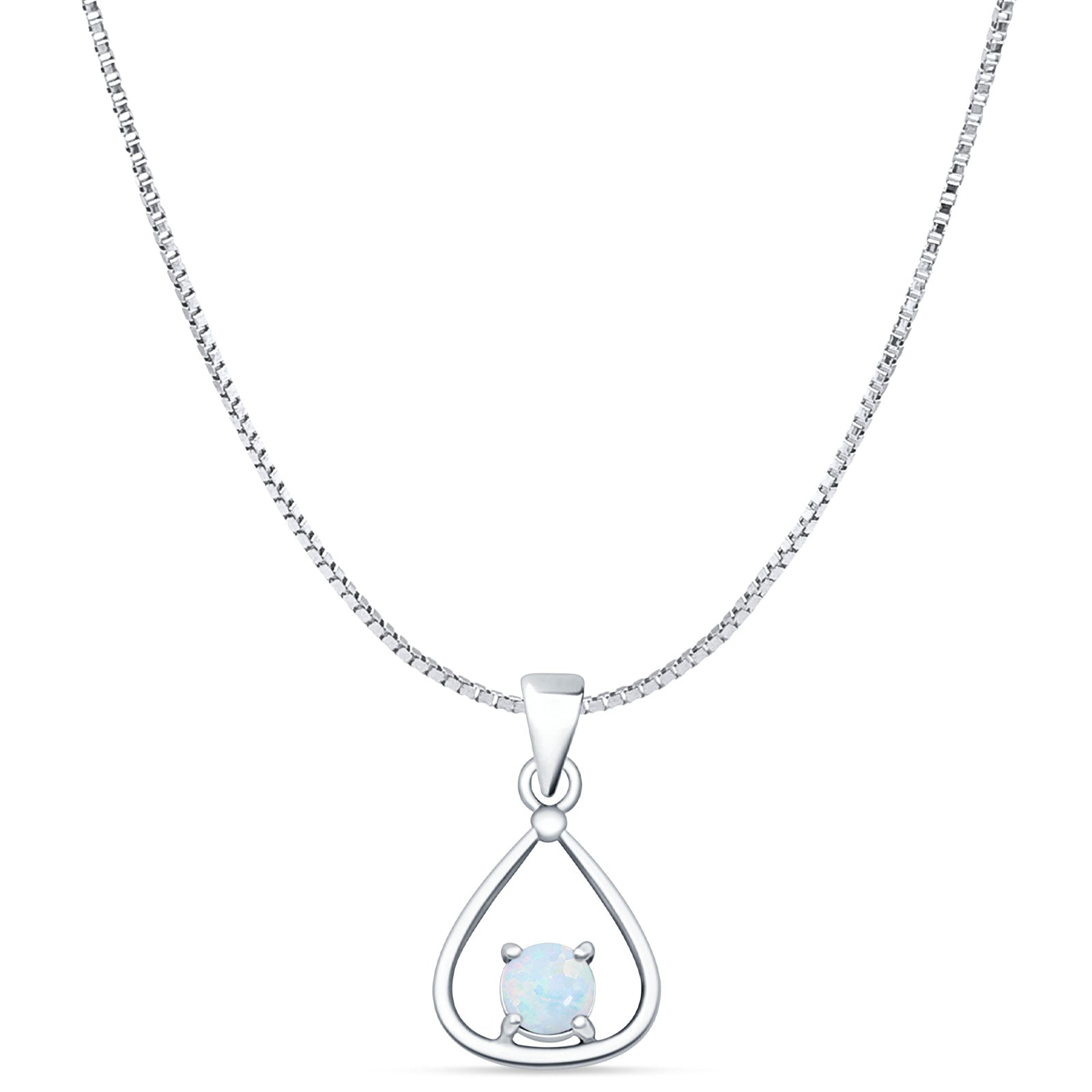 Round Lab Created White Opal Oxidized Teardrop Pendant Box Chain Necklace 925 Sterling Silver