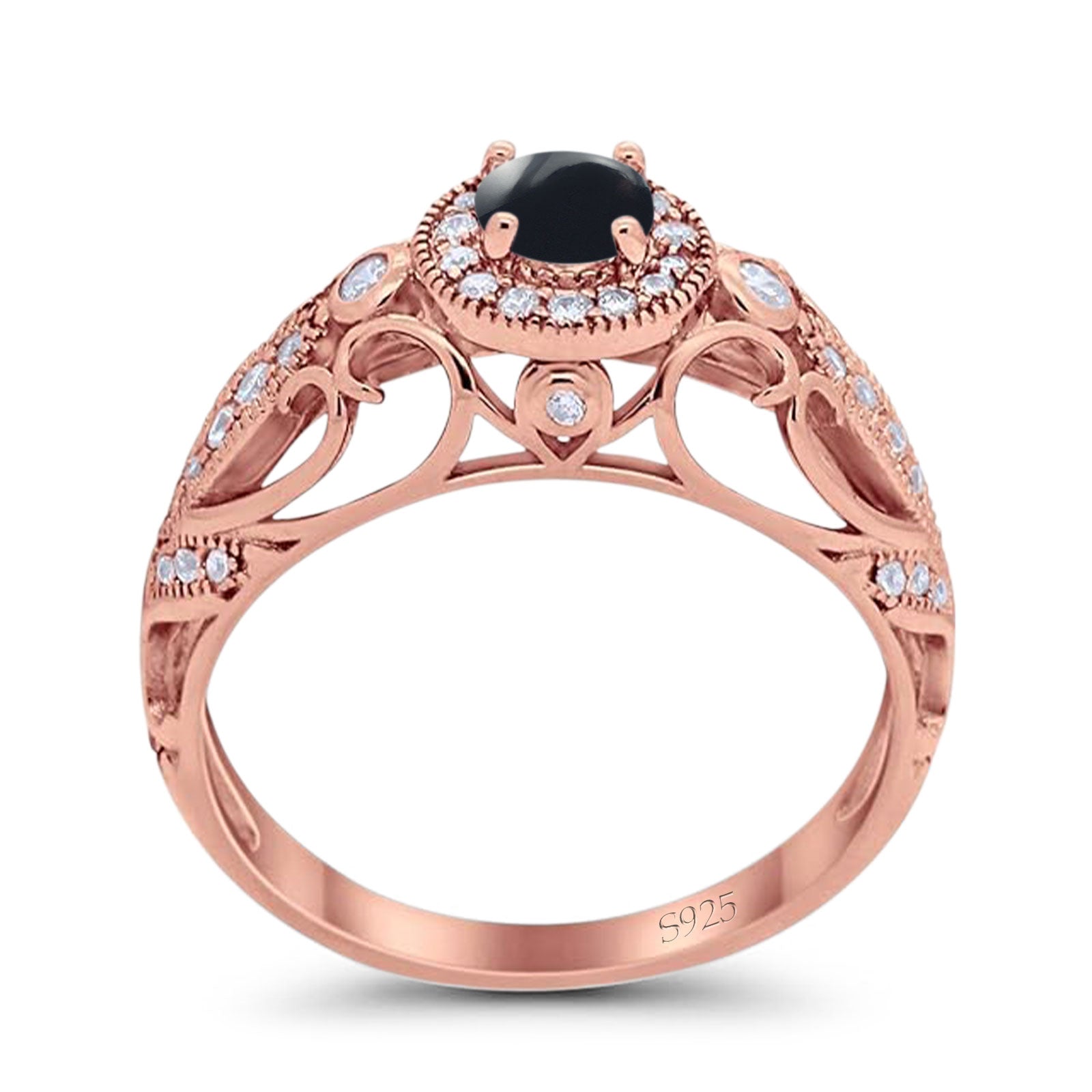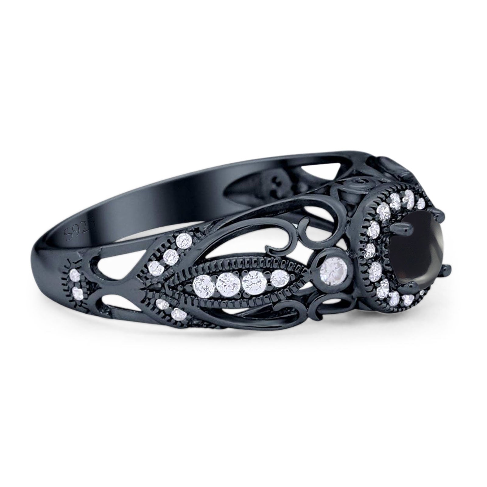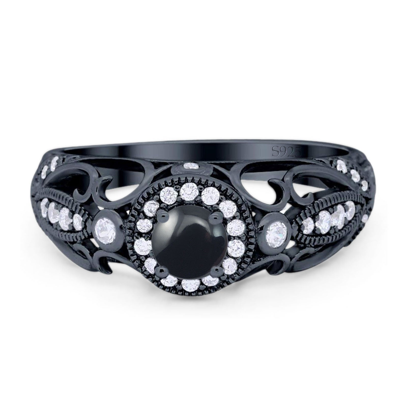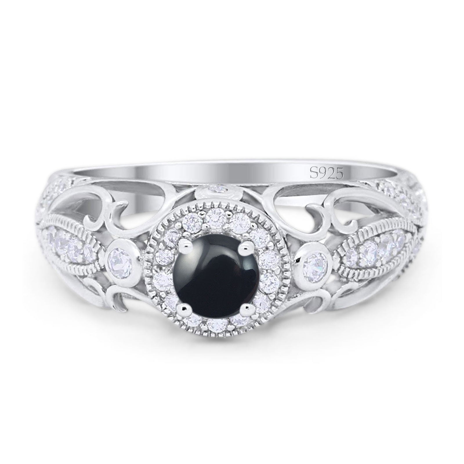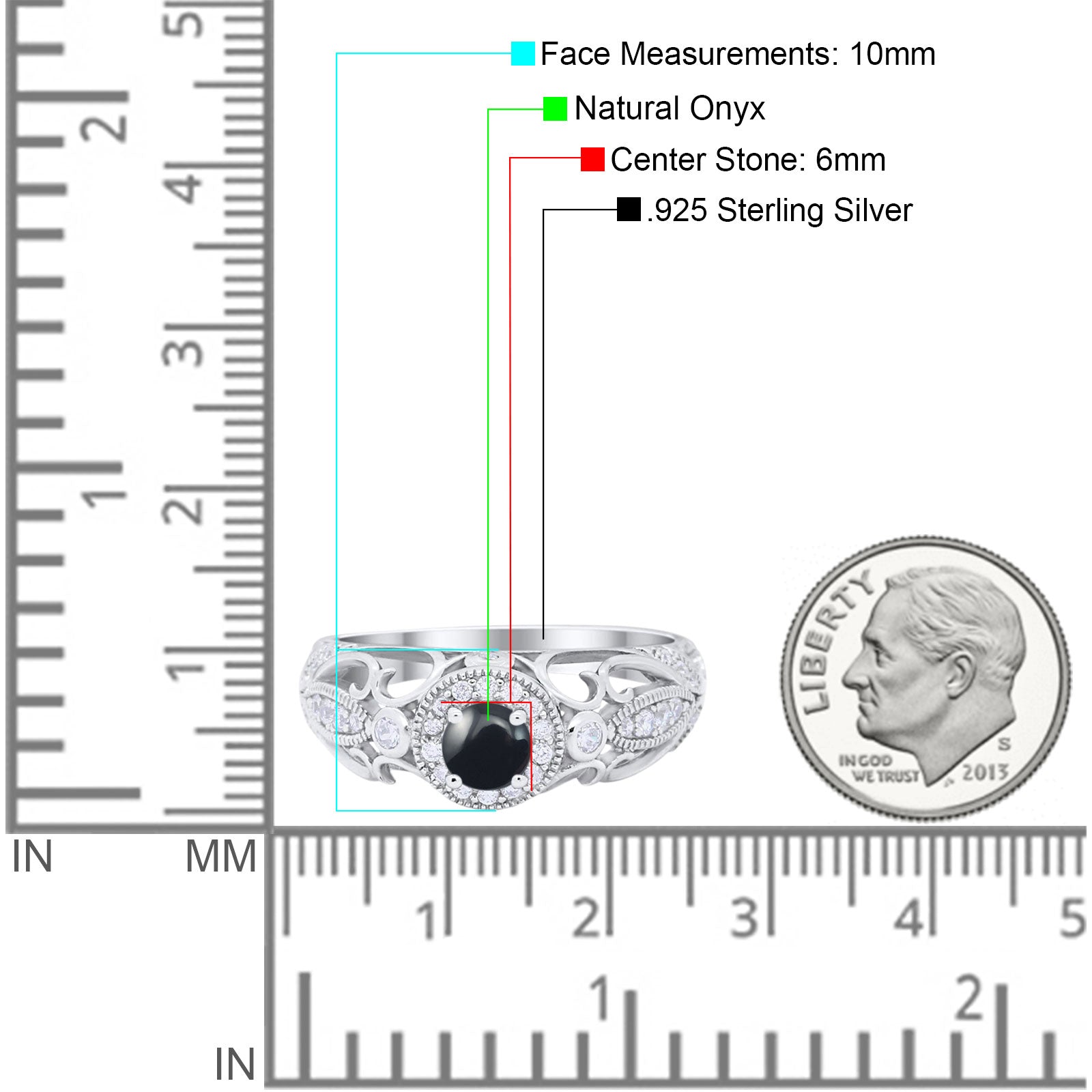 Round Natural Black Onyx Filigree Halo Ring 925 Sterling Silver