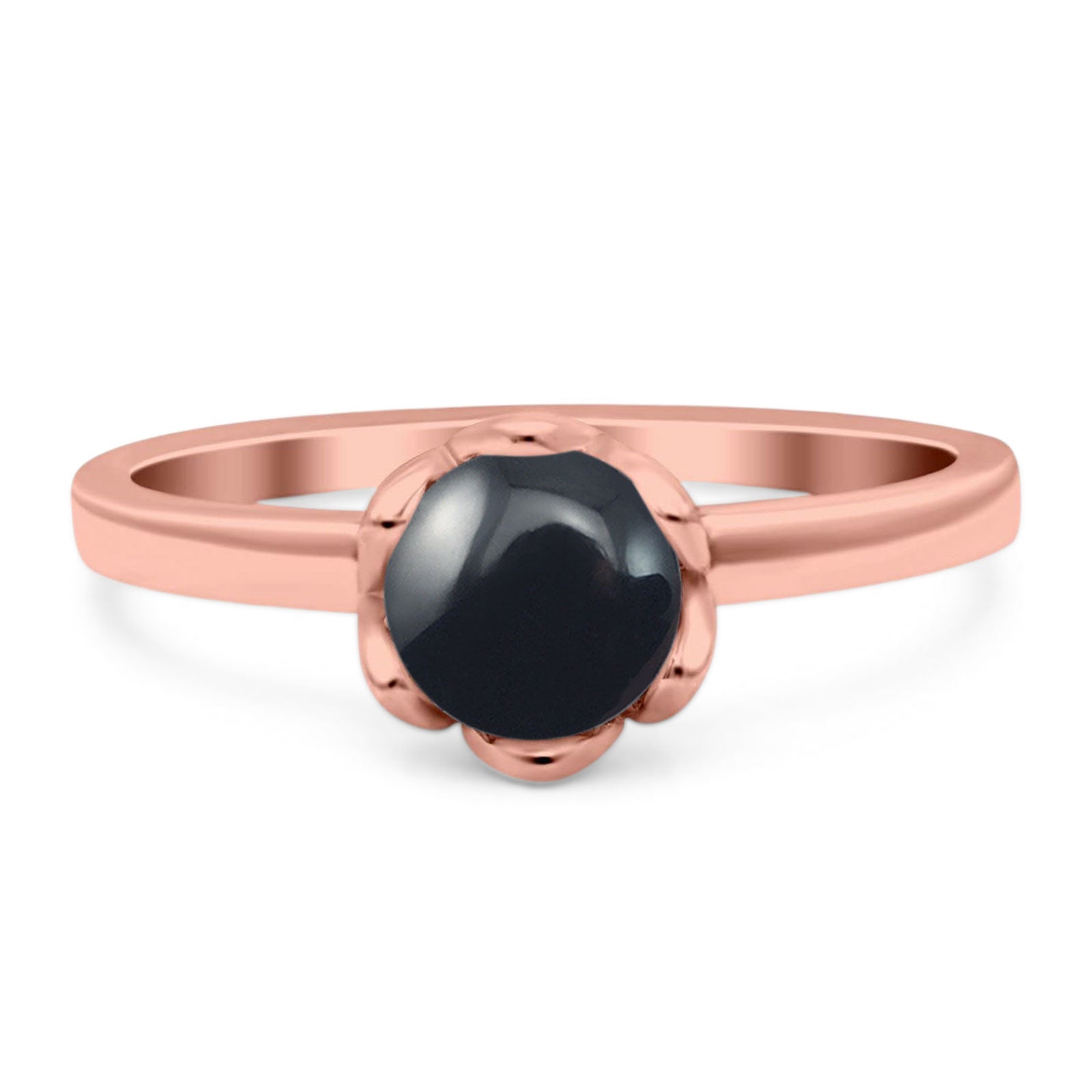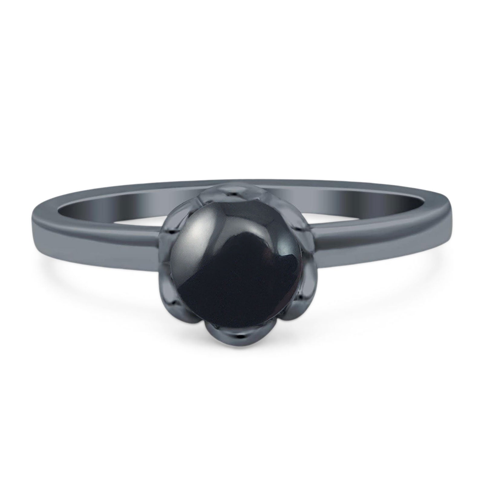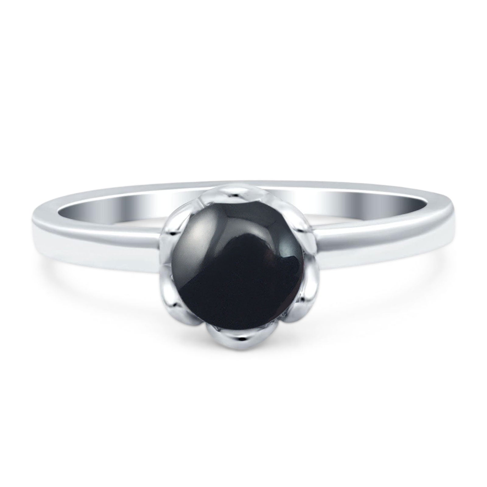 Round Natural Black Onyx Solitaire Flower Ring 925 Sterling Silver