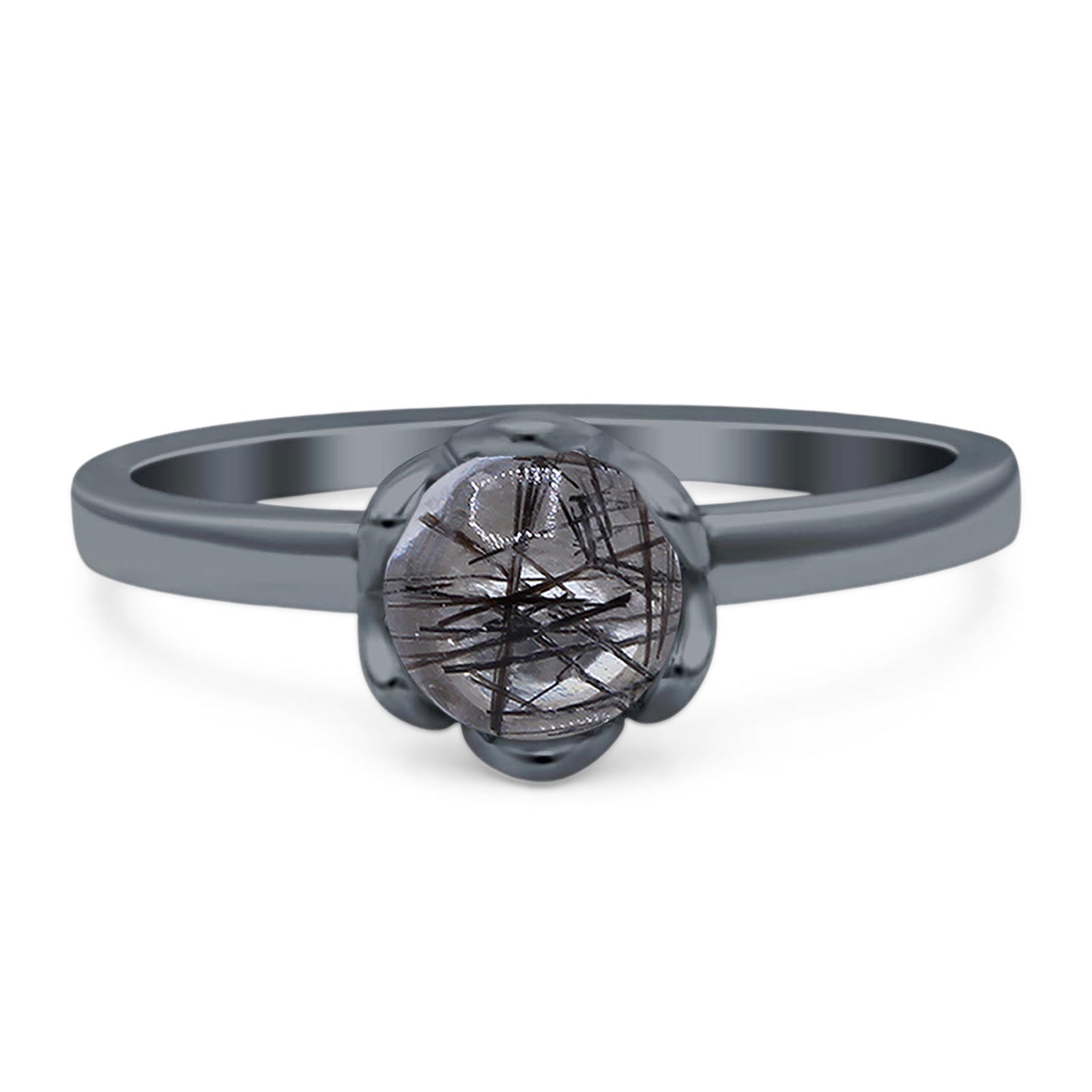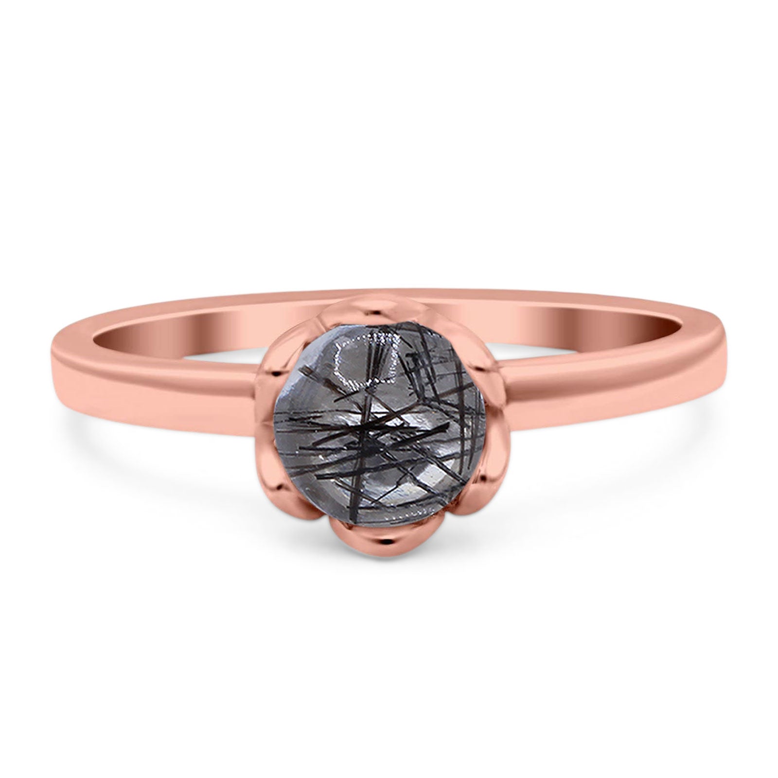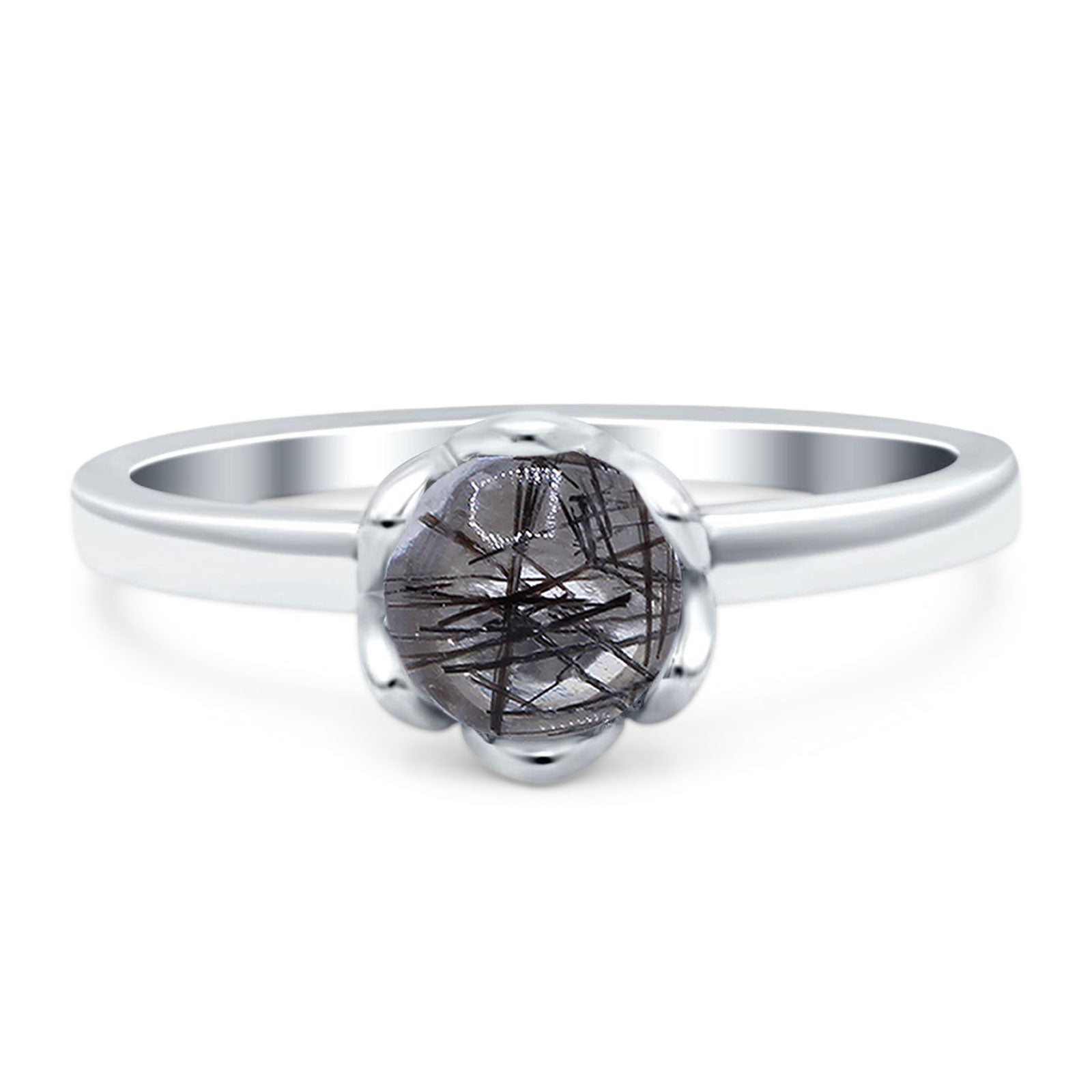 Round Natural Rutilated Quartz Solitaire Flower Ring 925 Sterling Silver