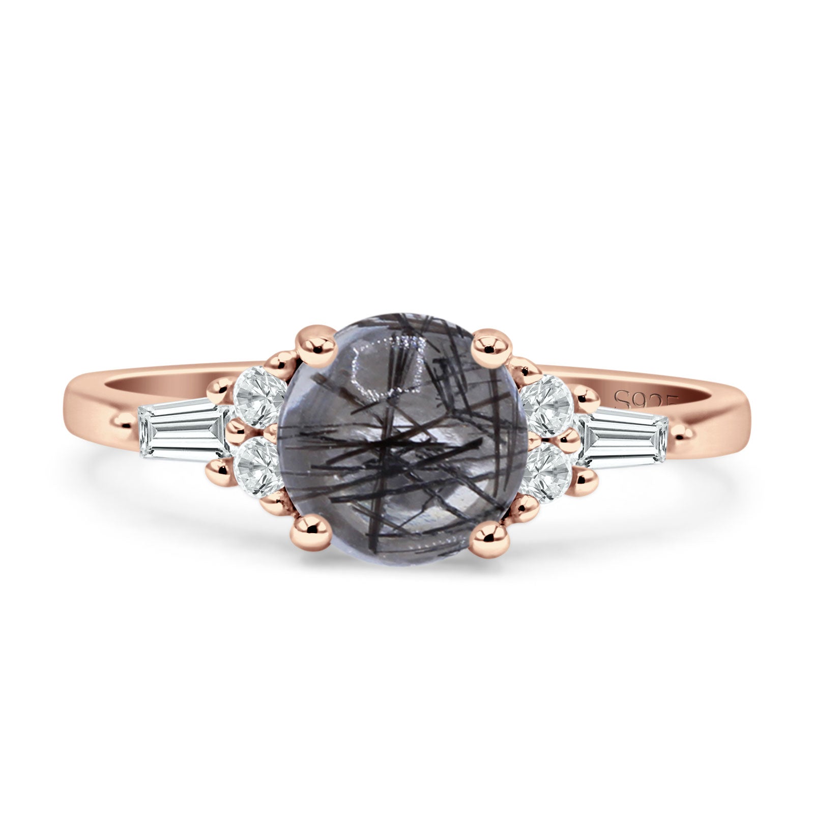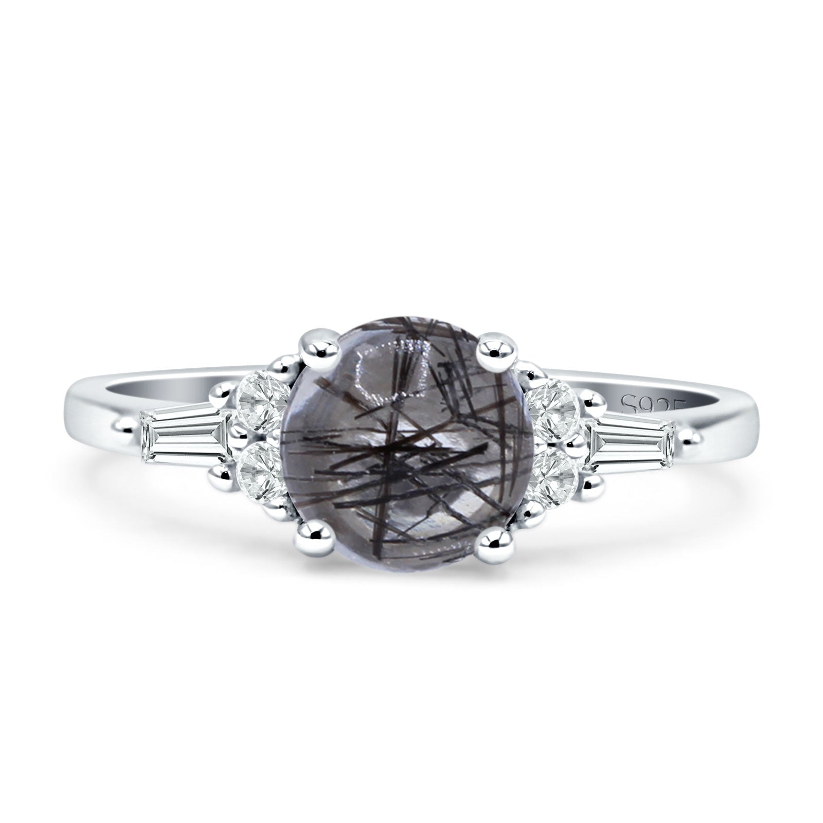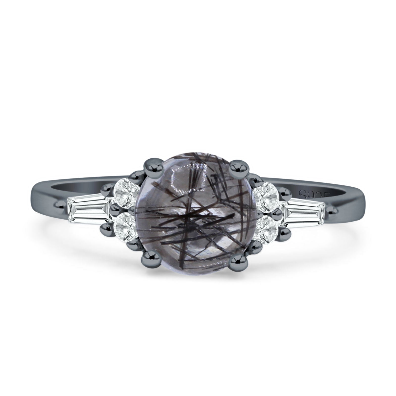 Product Description:Elevate your style with this captivating round natural Rutilated Quartz ring. Crafted in vintage-inspired design, the sterling silver band showcases a stunning Rutilated Quartz centerpiece, complemented by delicate baguette accents. Timeless elegance meets modern sophistication in this exquisite piece.