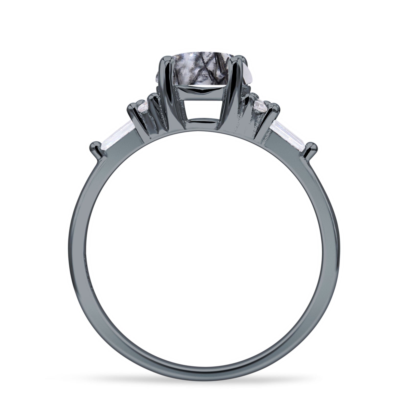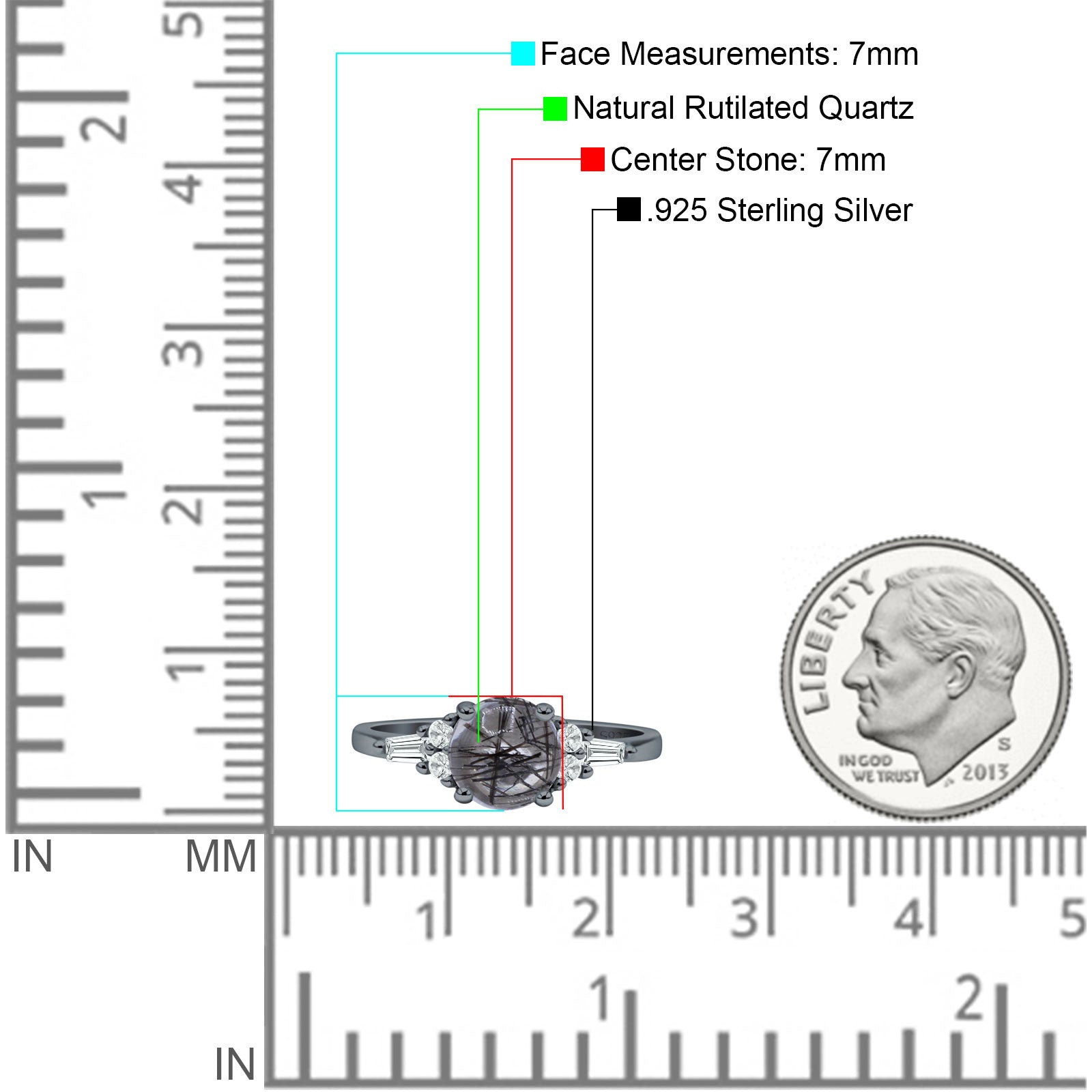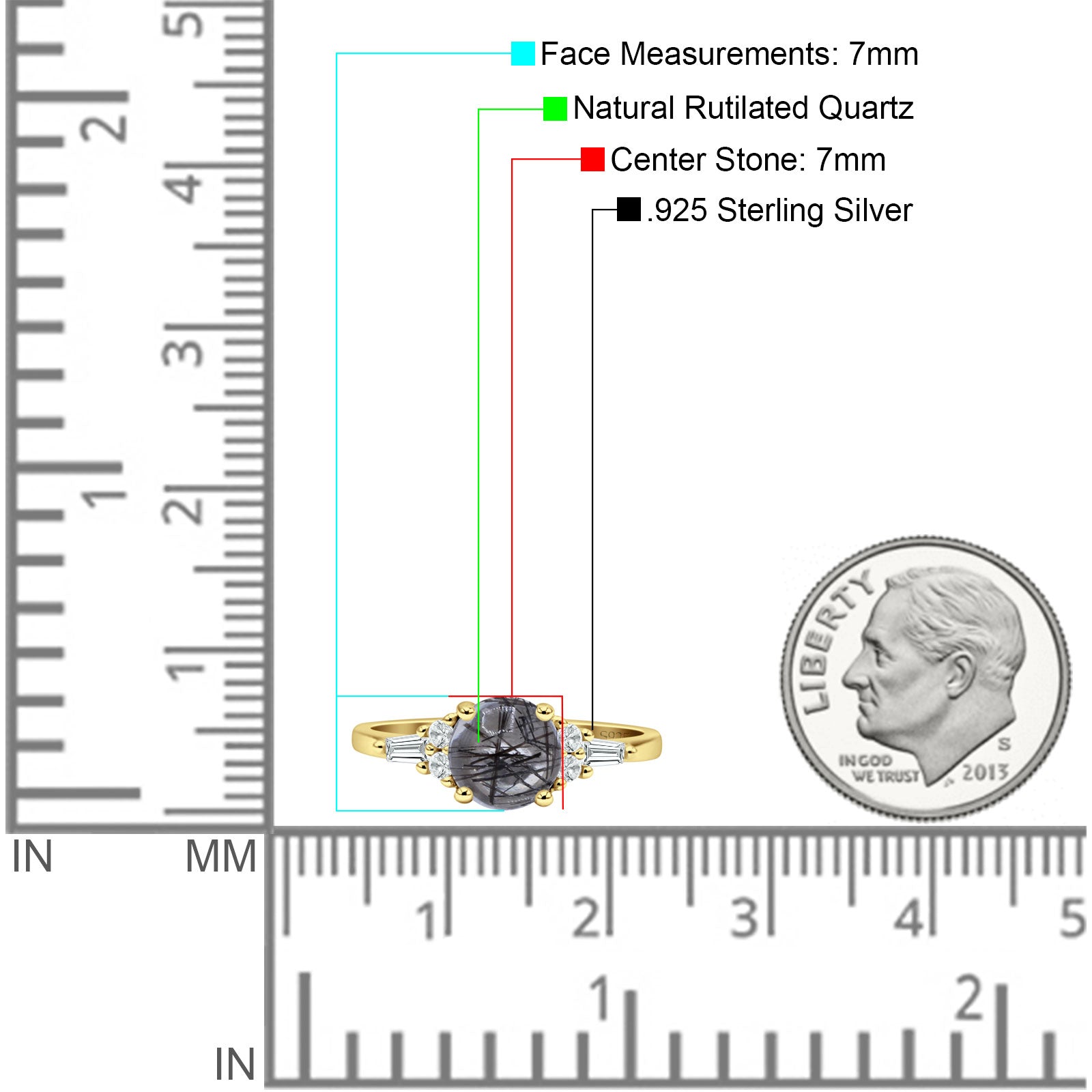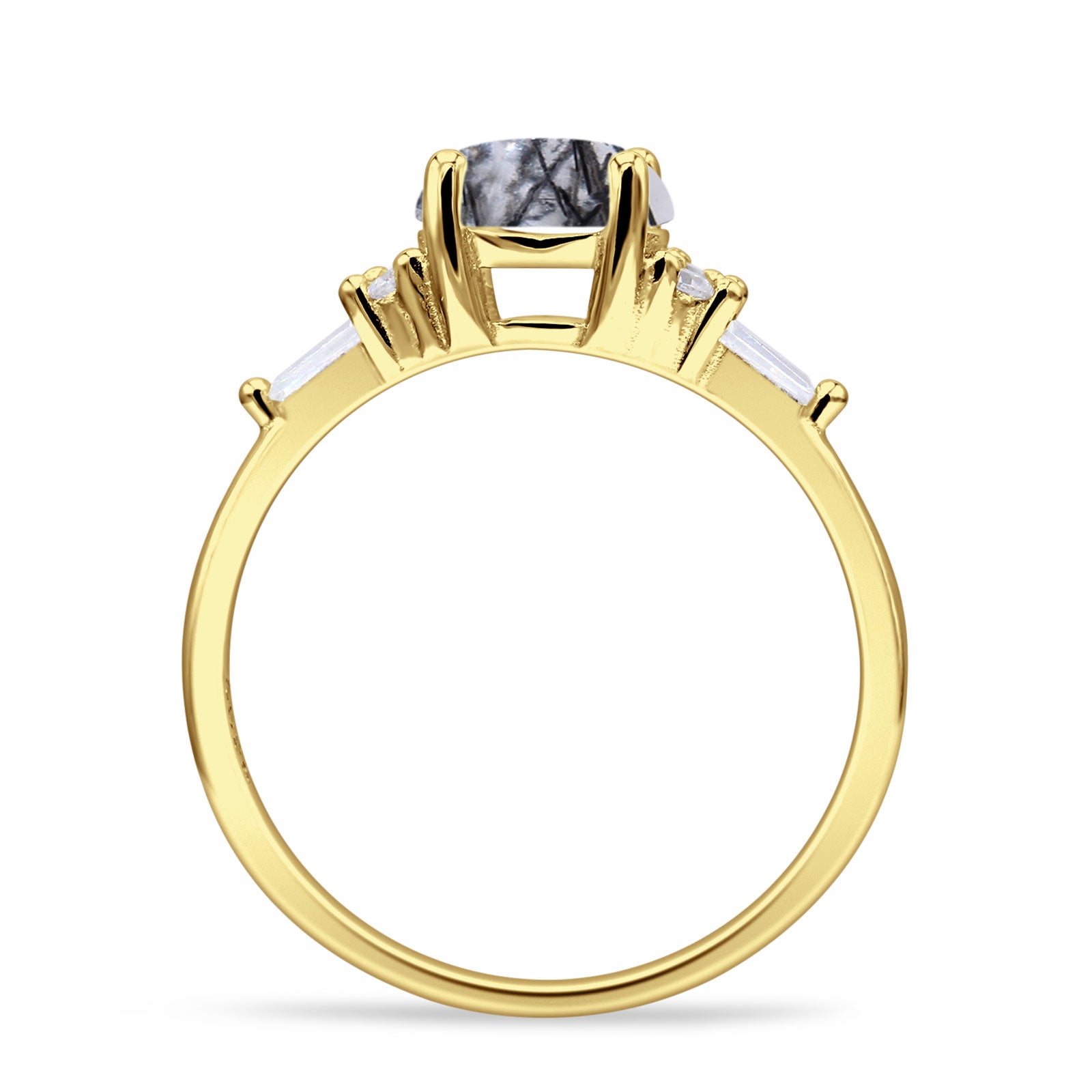 Product Description:Elevate your style with this captivating round natural Rutilated Quartz ring. Crafted in vintage-inspired design, the sterling silver band showcases a stunning Rutilated Quartz centerpiece, complemented by delicate baguette accents. Timeless elegance meets modern sophistication in this exquisite piece.