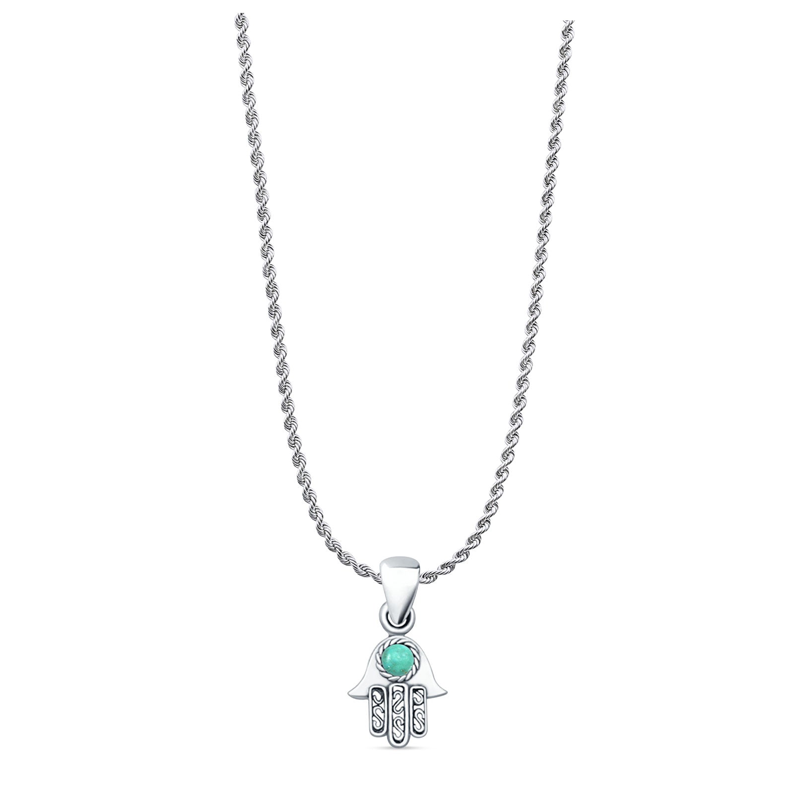 Round Turquoise Hand Of Hamsa Pendant Rope Chain Necklace 925 Sterling Silver