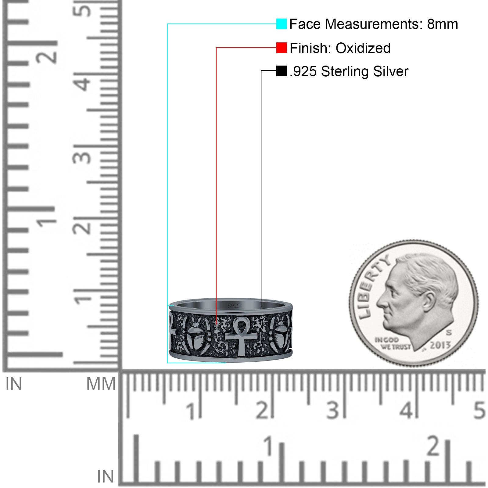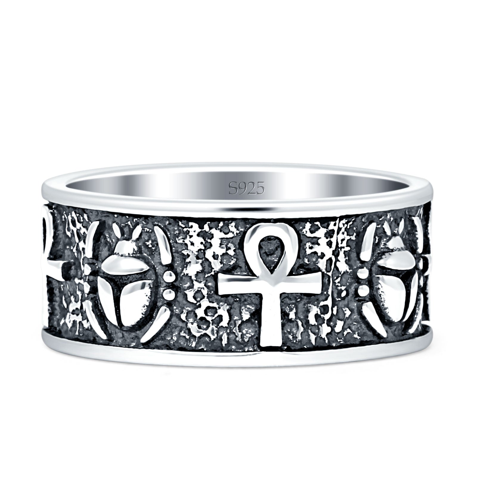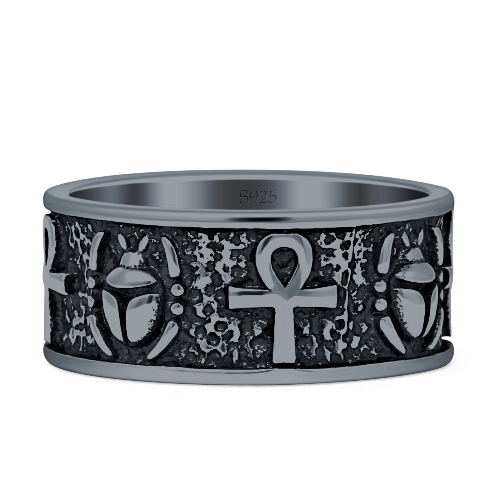 Scarab Ankh Ring 8mm Oxidized Band 925 Sterling Silver