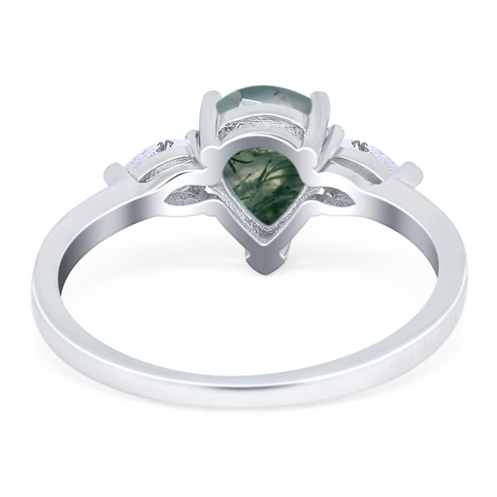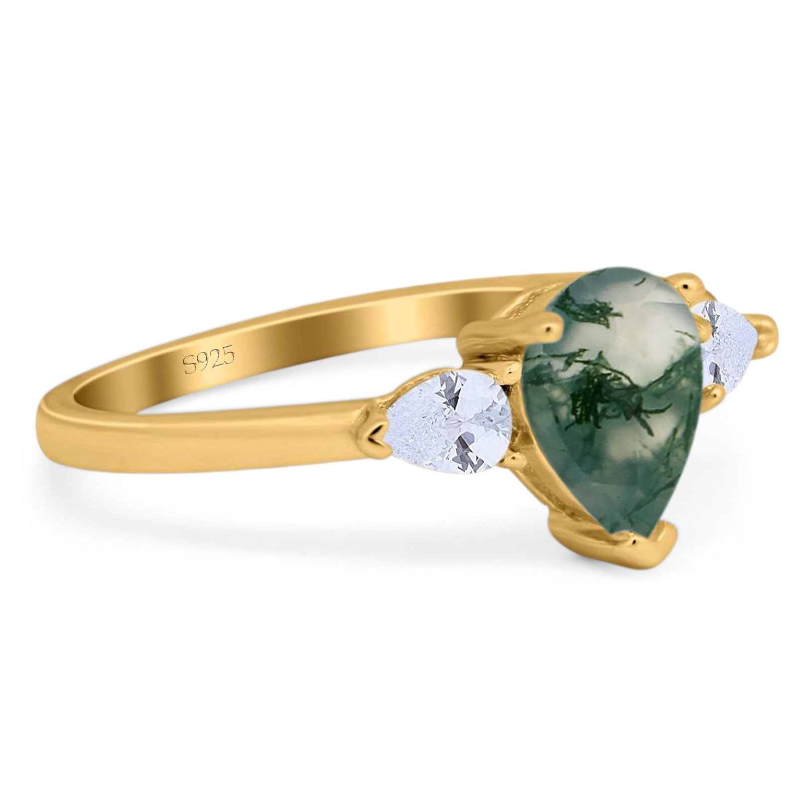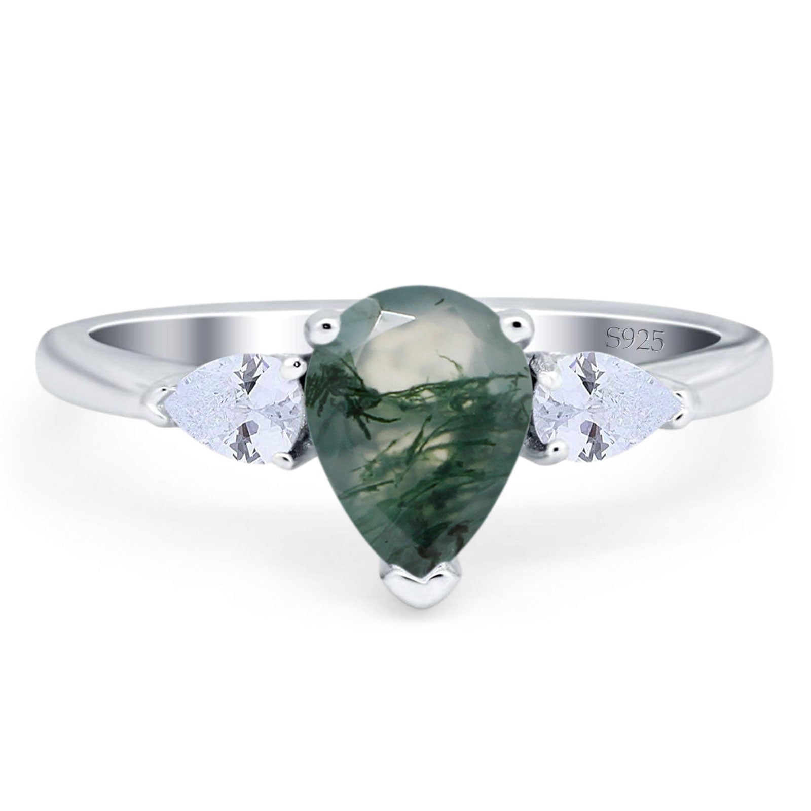 Three Stone Art Deco Pear Teardrop Natural Green Moss Agate Trio Ring 925 Sterling Silver