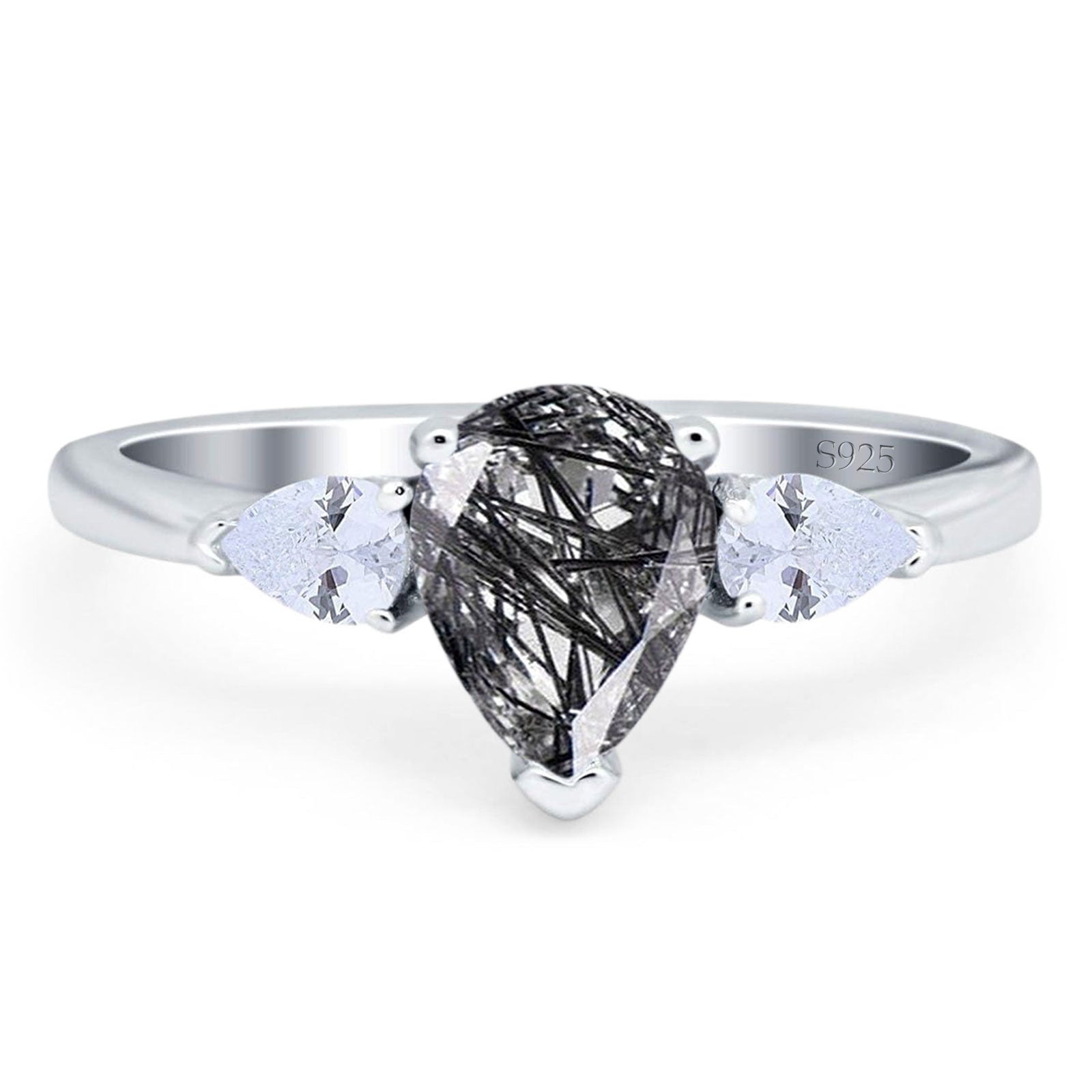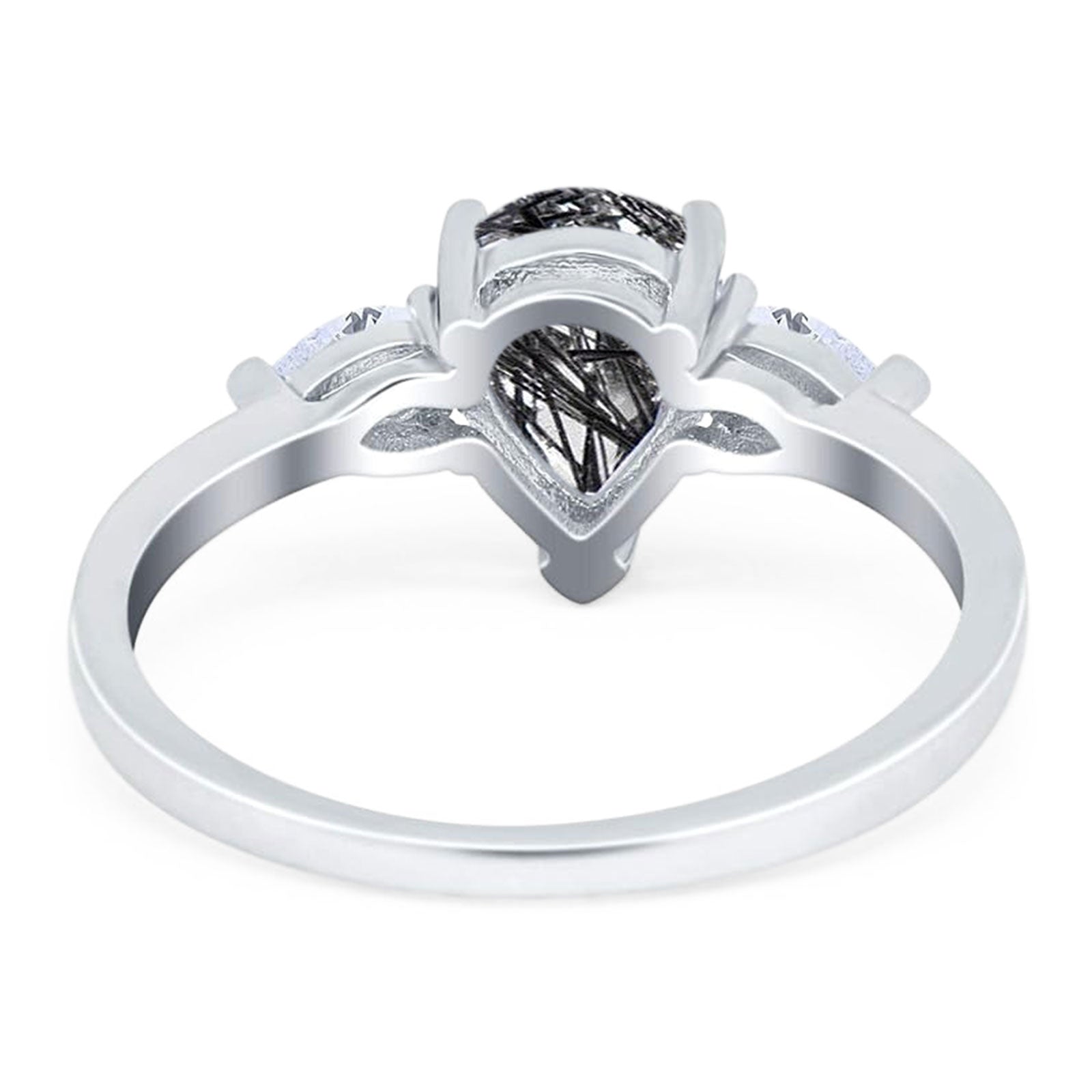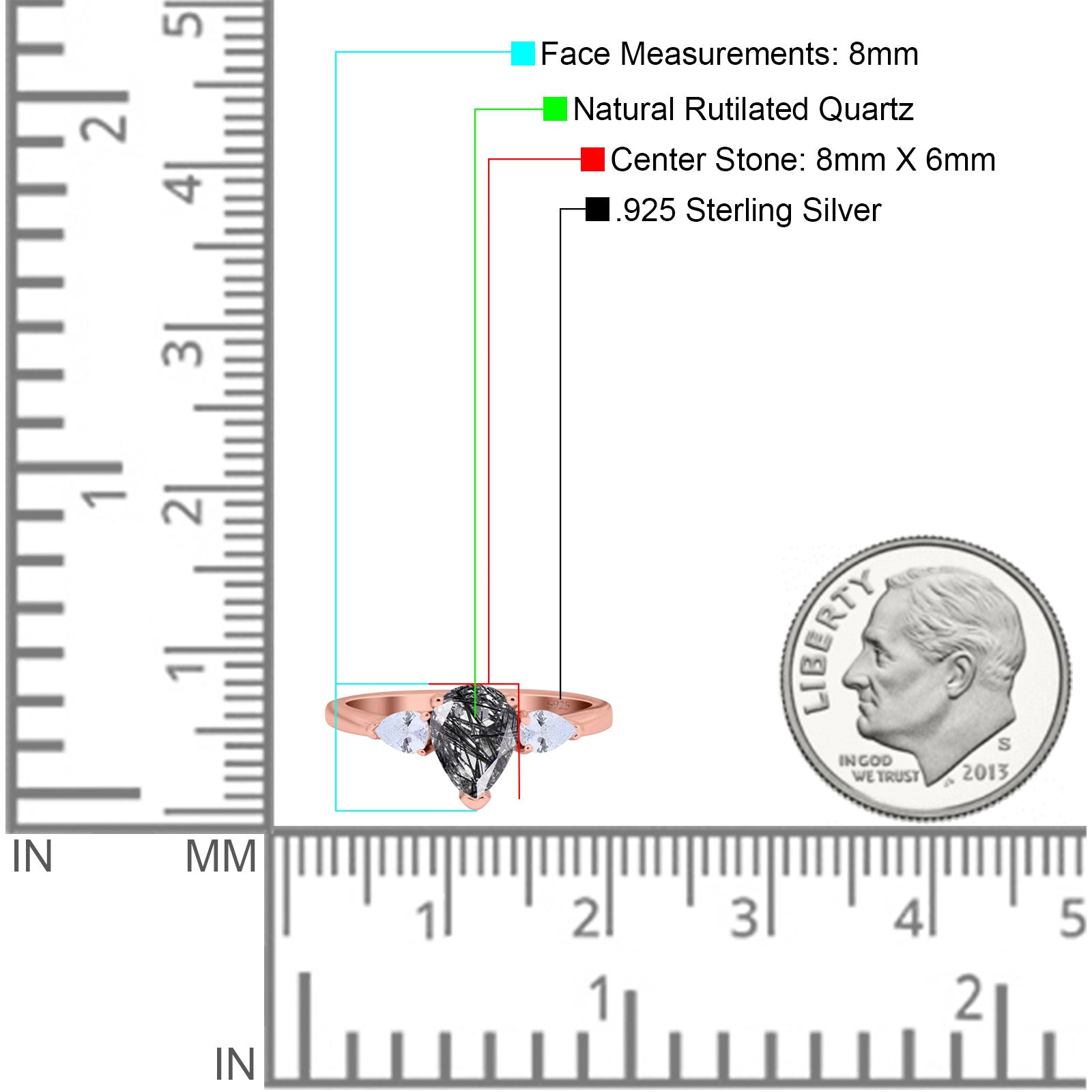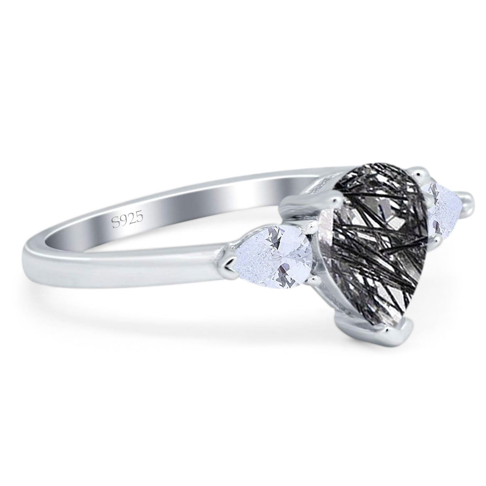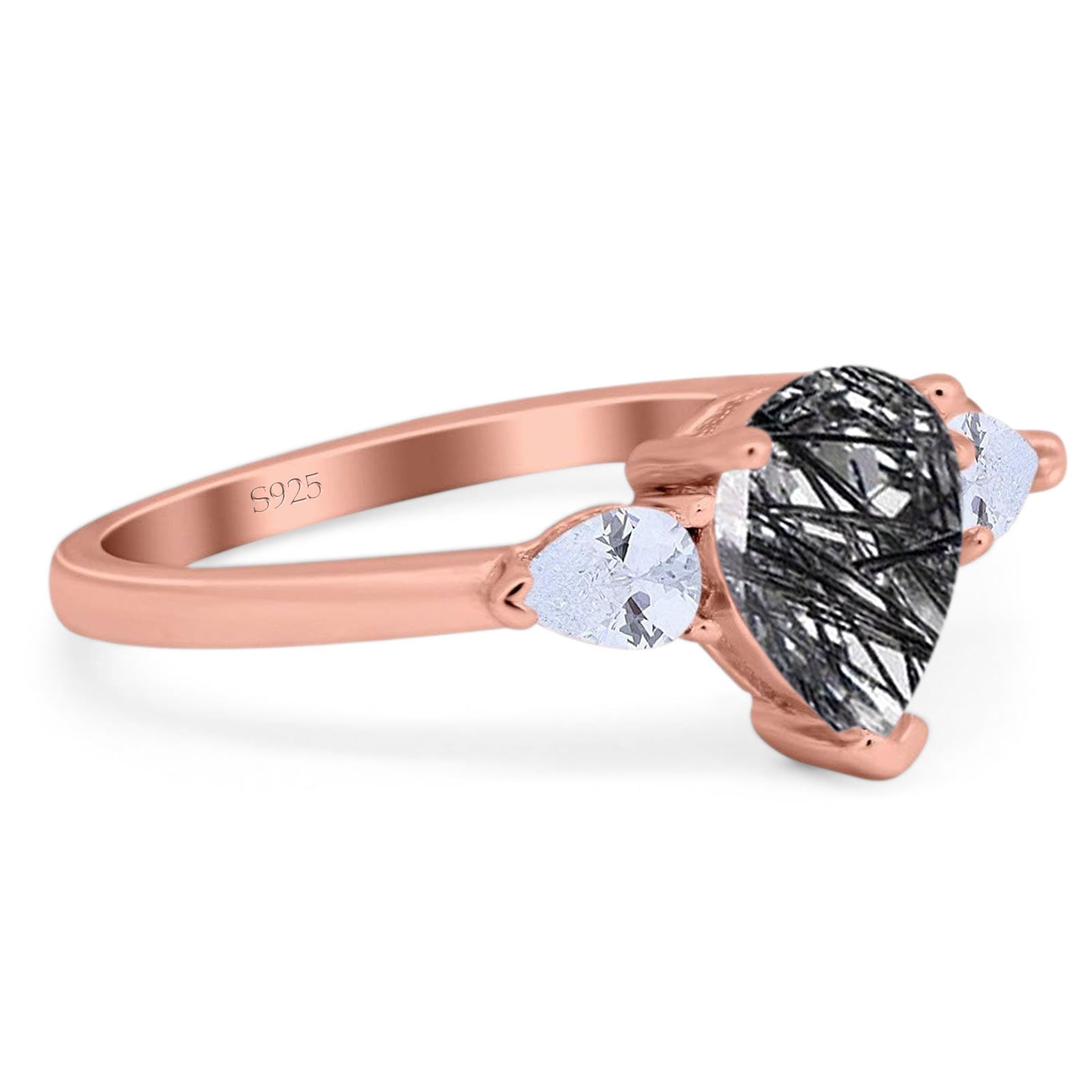 Three Stone Art Deco Pear Teardrop Natural Rutilated Quartz Trio Ring 925 Sterling Silver
