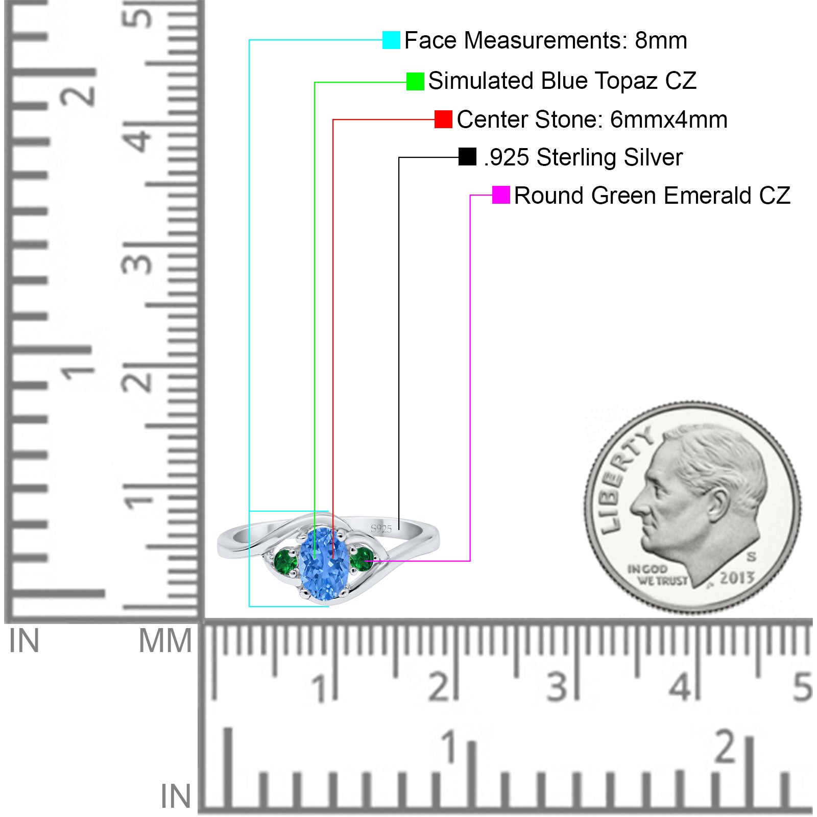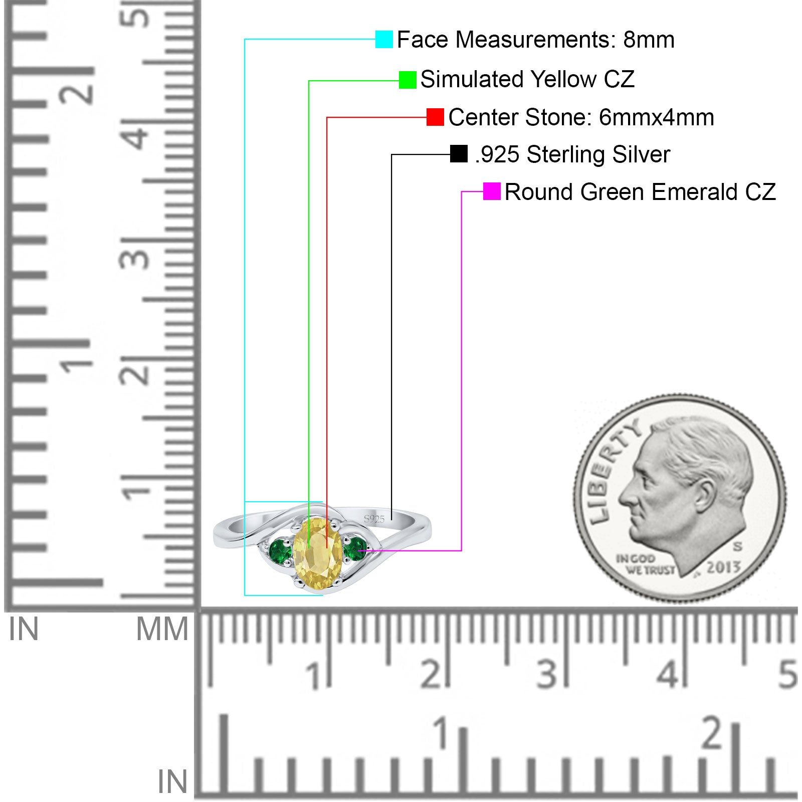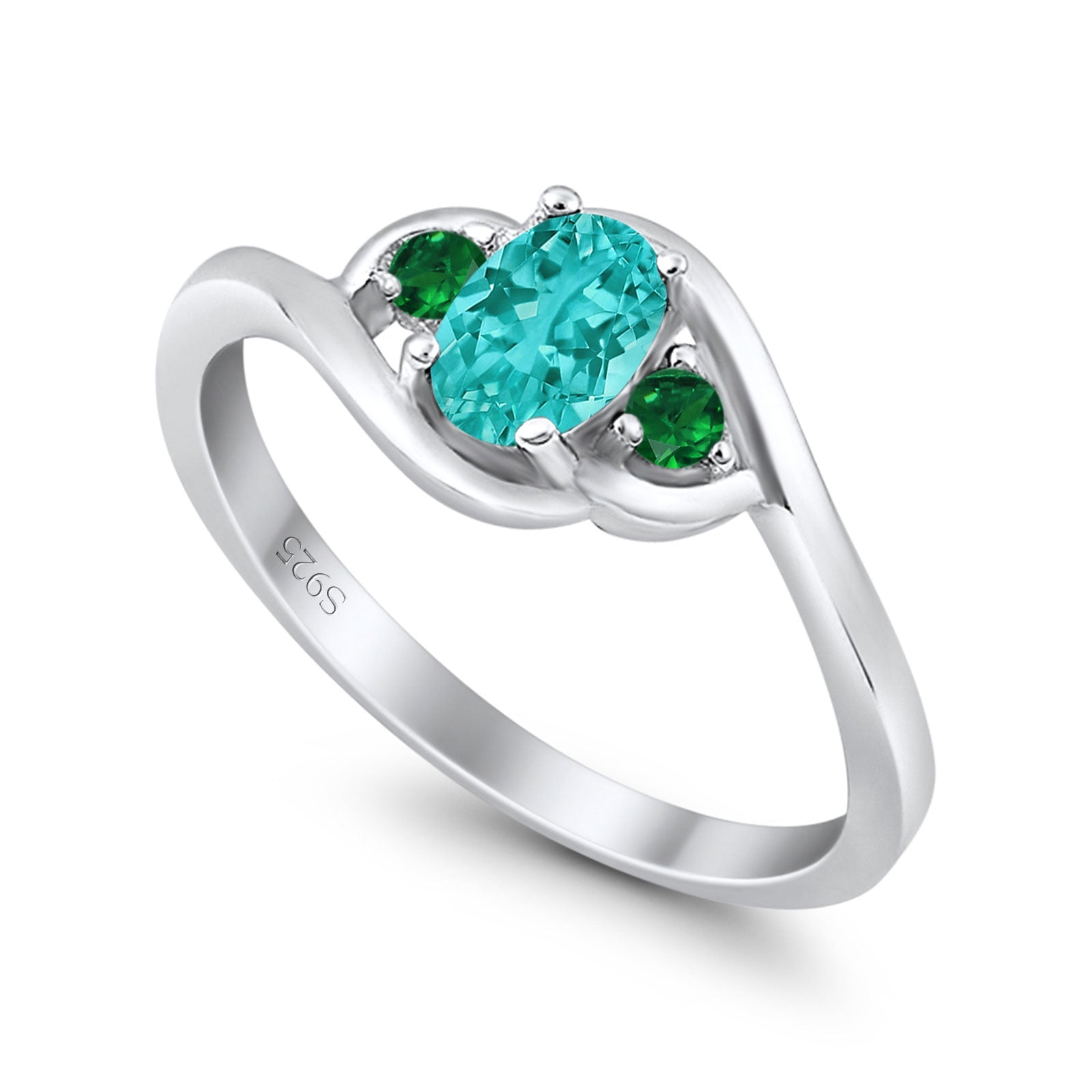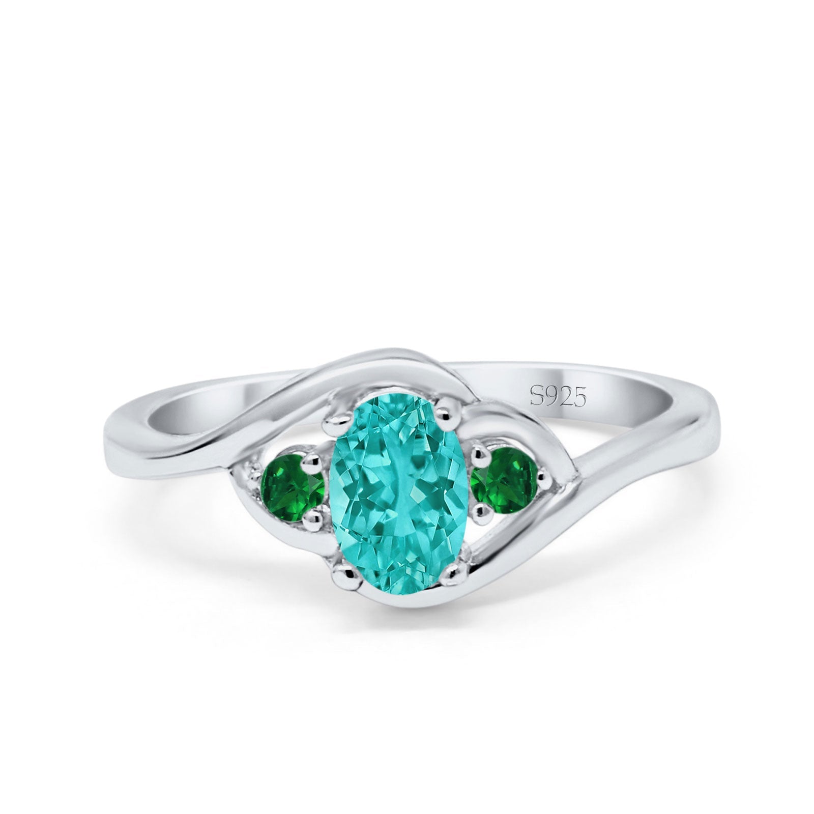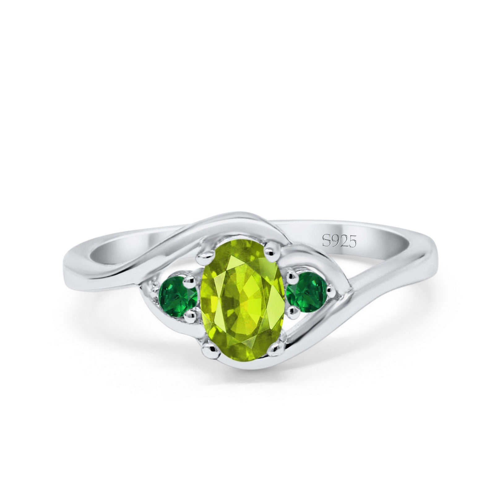 Three Stone Engagement Ring Oval Cut Round Simulated Green Emerald Cubic Zirconia 925 Sterling Silver