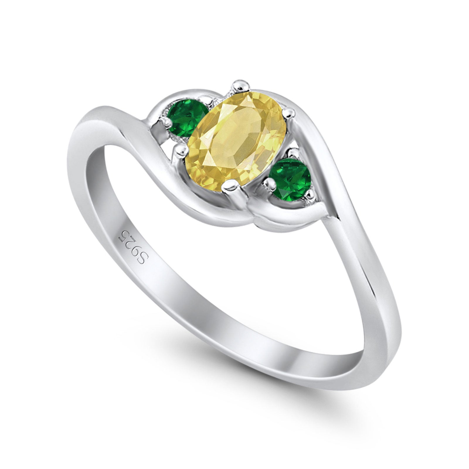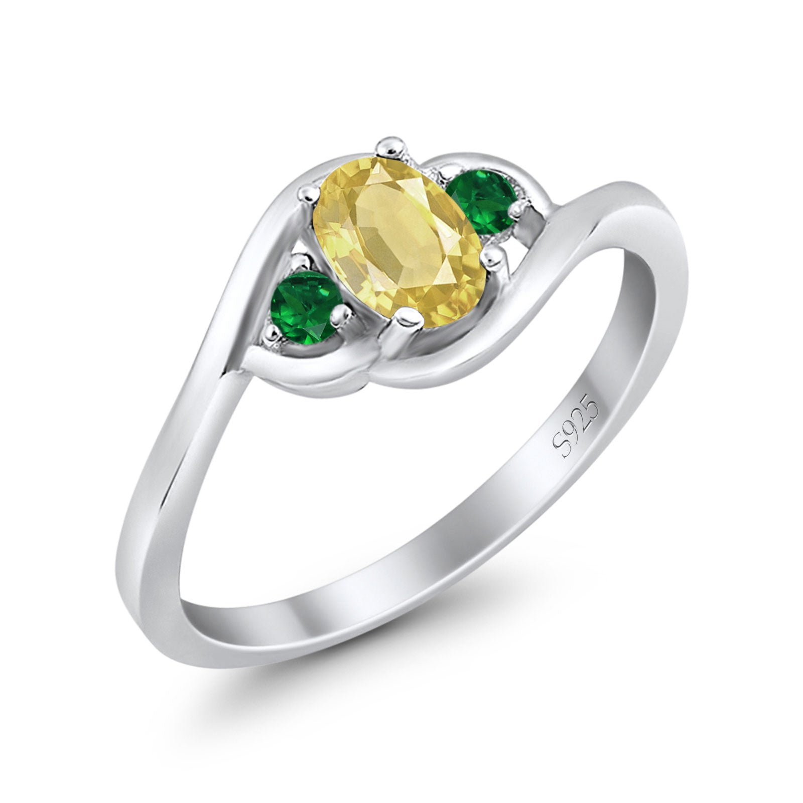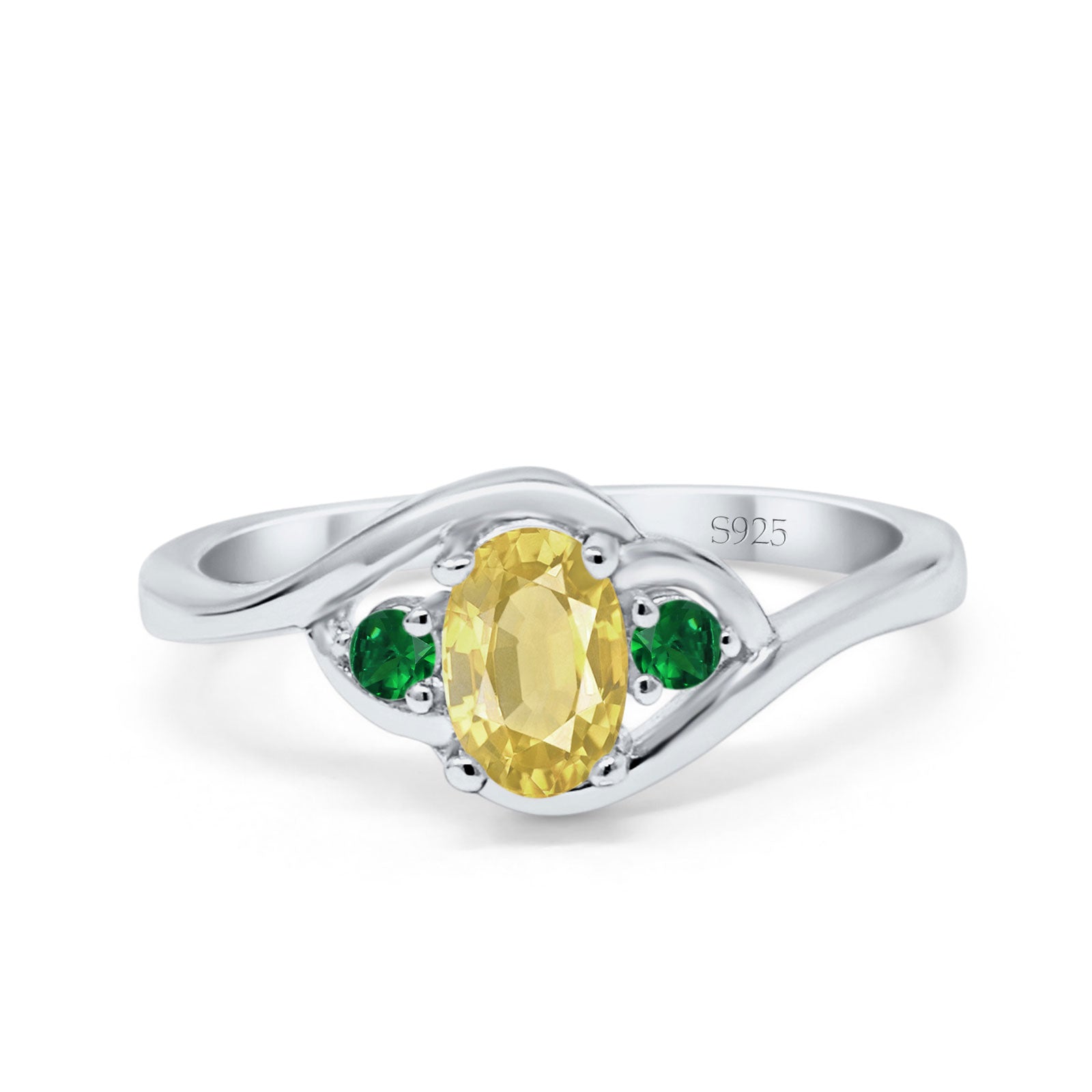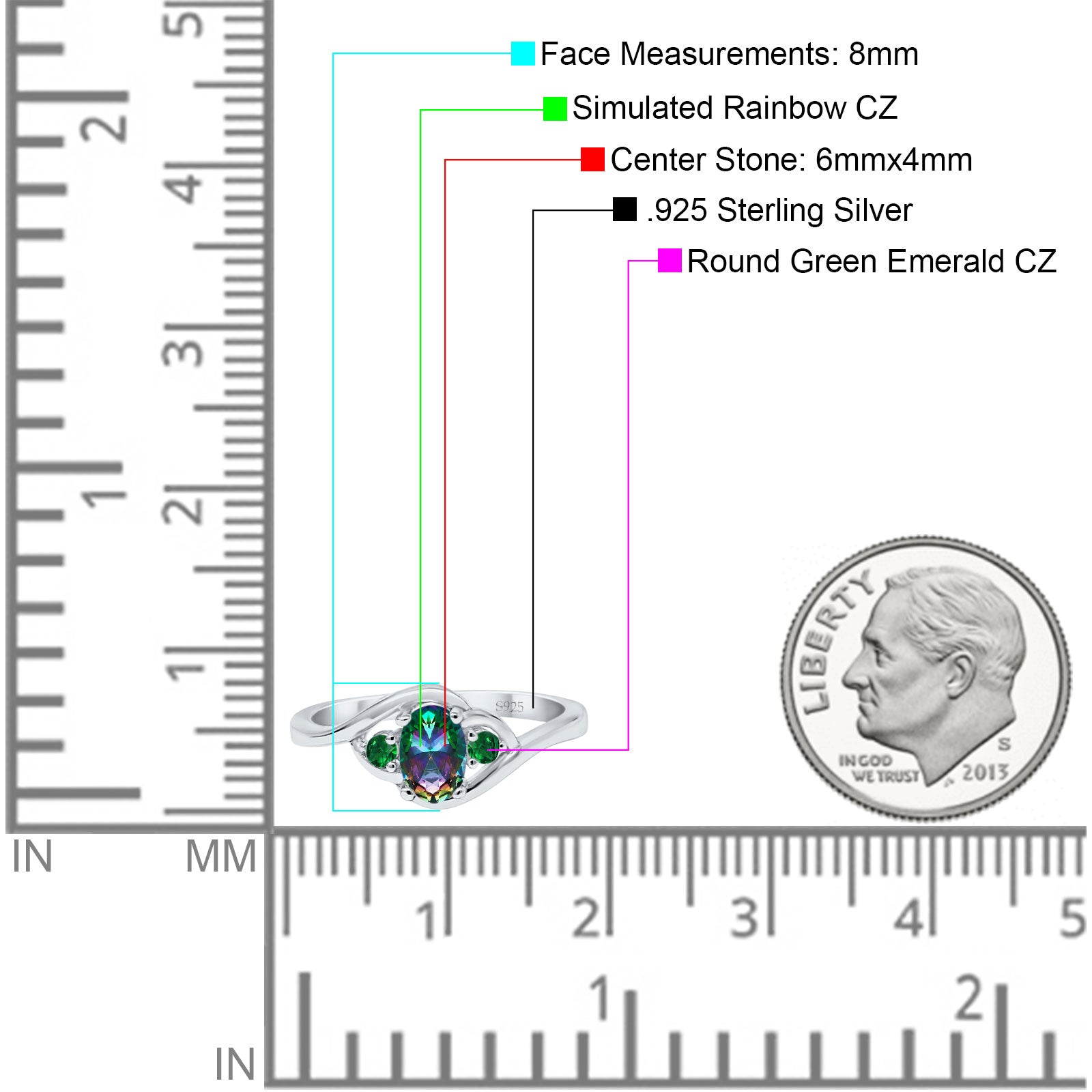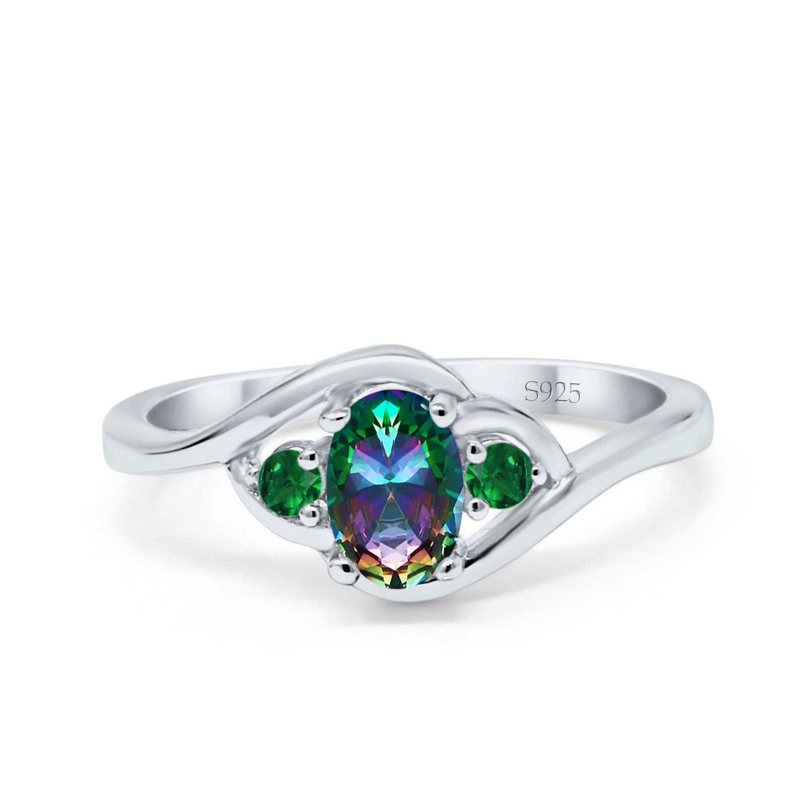 Three Stone Engagement Ring Oval Cut Round Simulated Green Emerald Cubic Zirconia 925 Sterling Silver