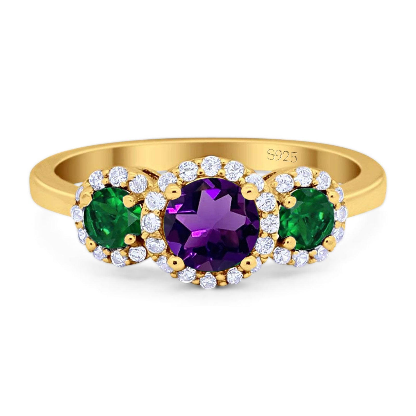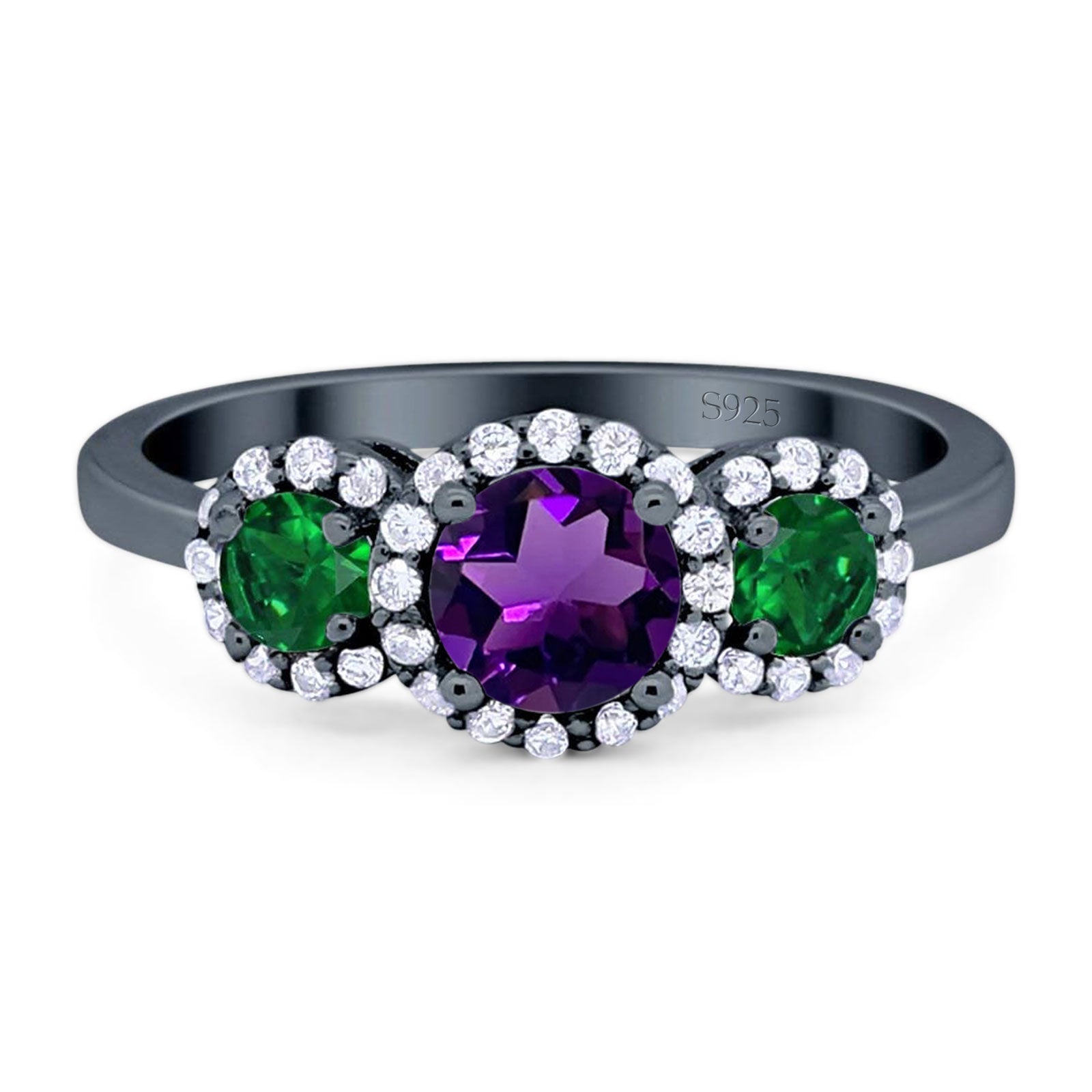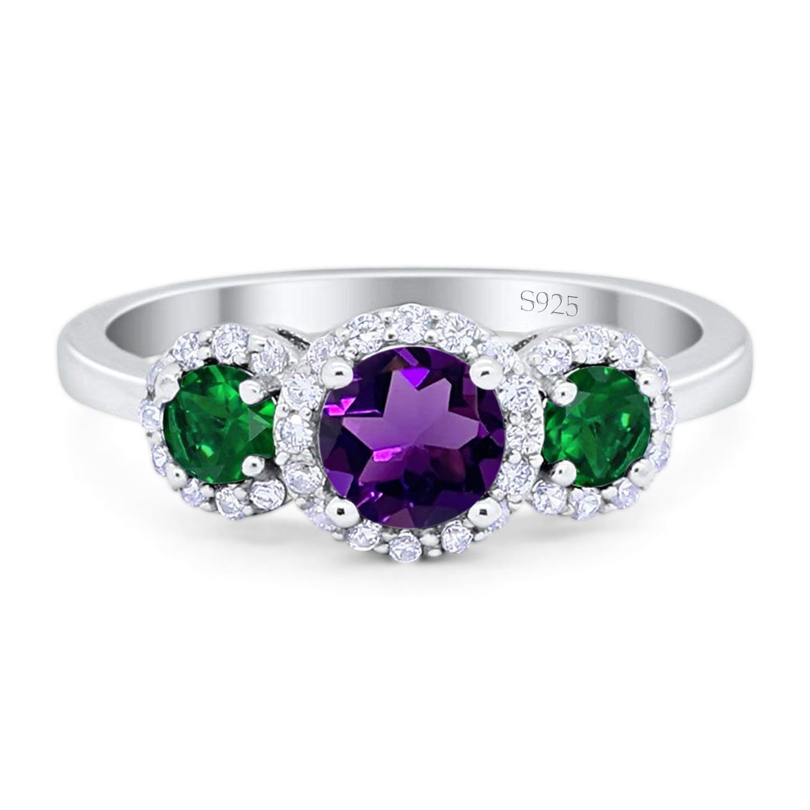 Three Stone Round Natural Amethyst Art Deco Ring 925 Sterling Silver