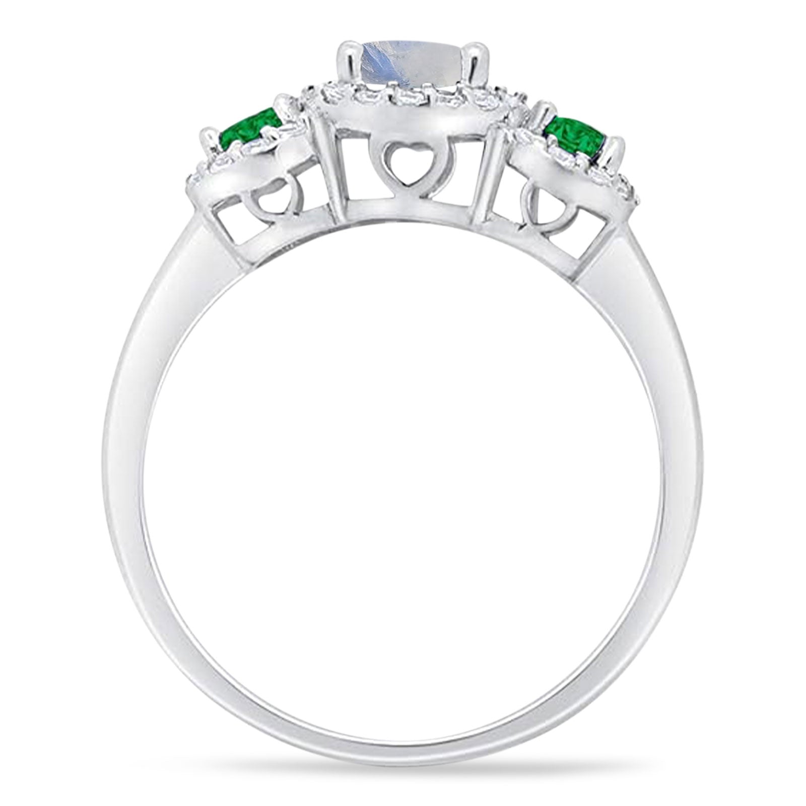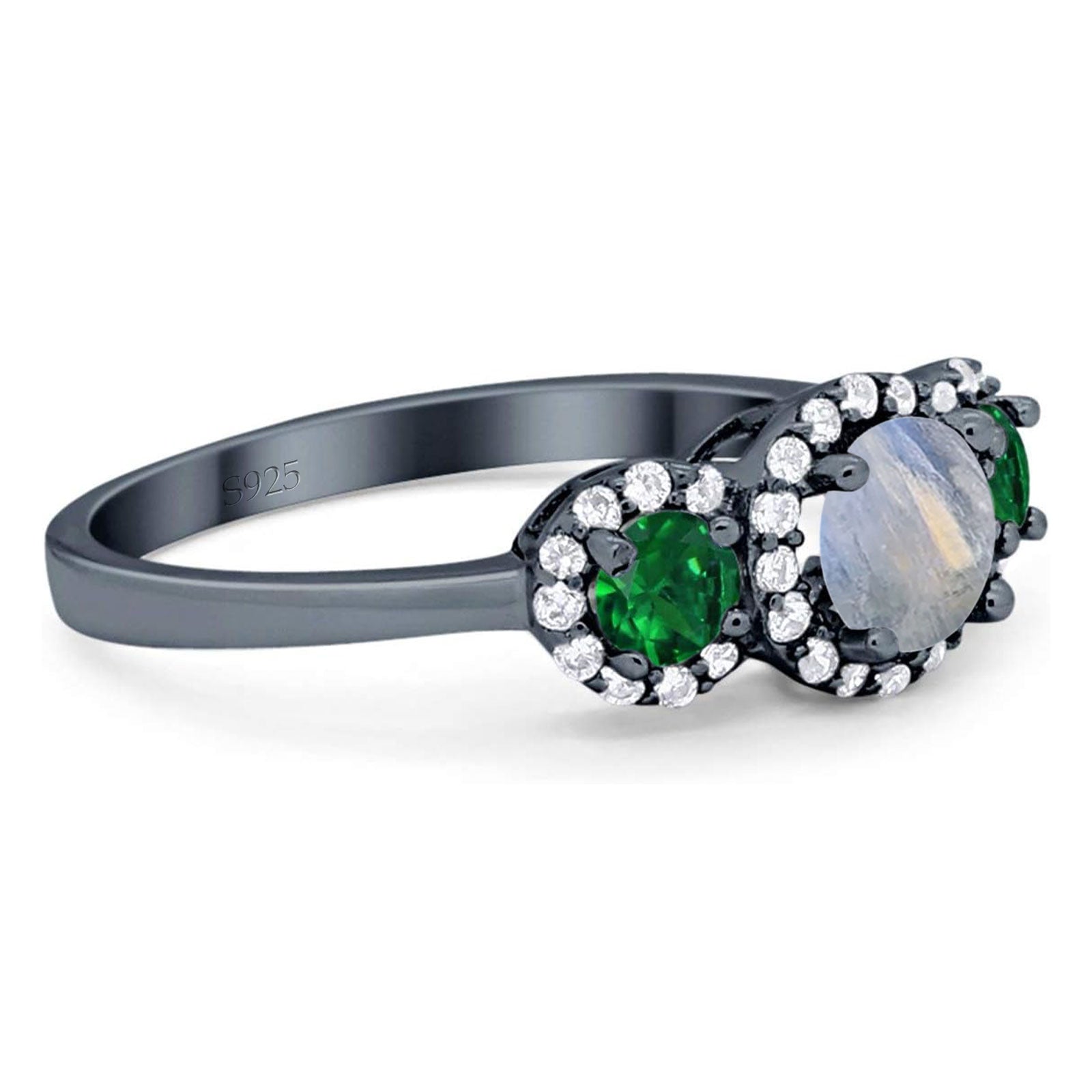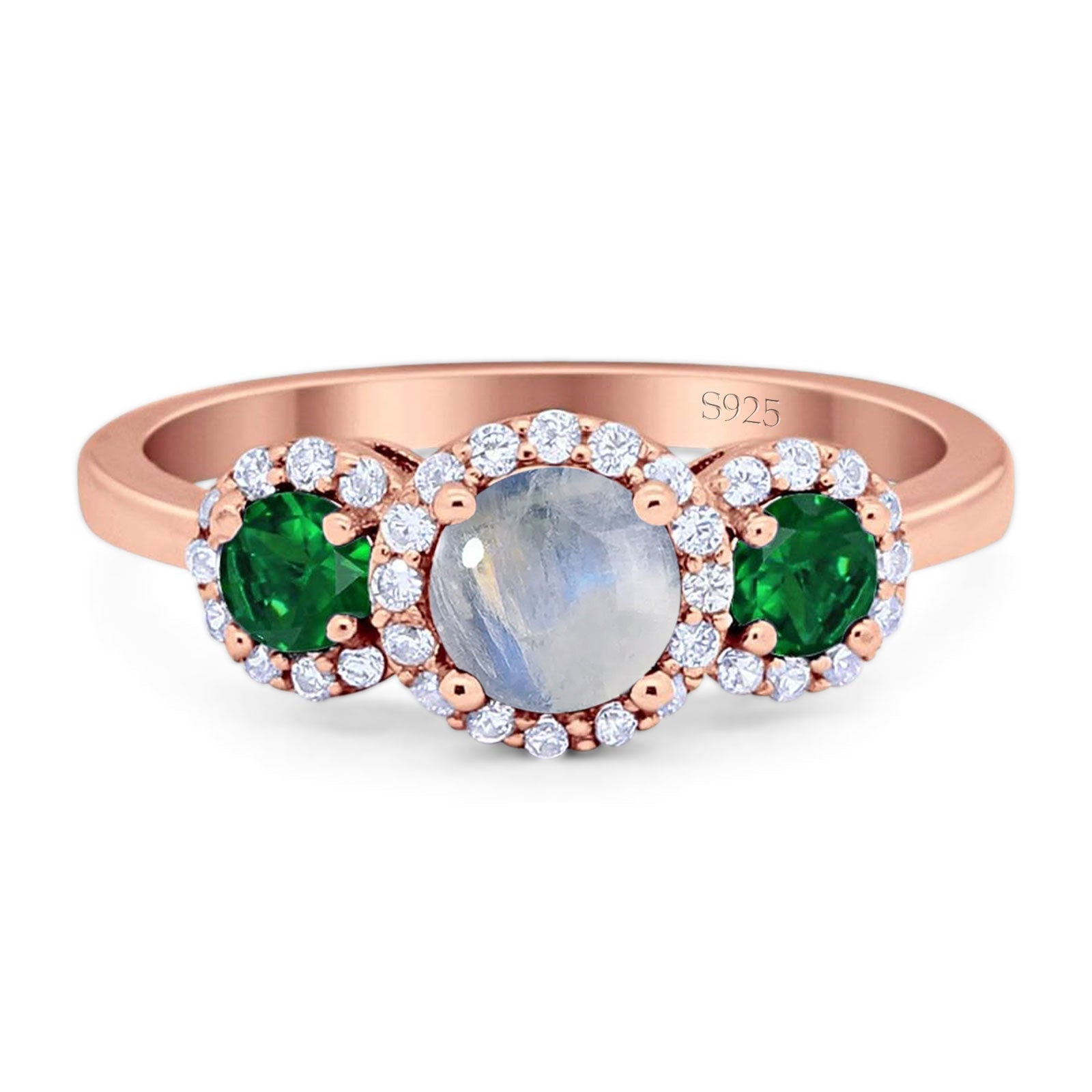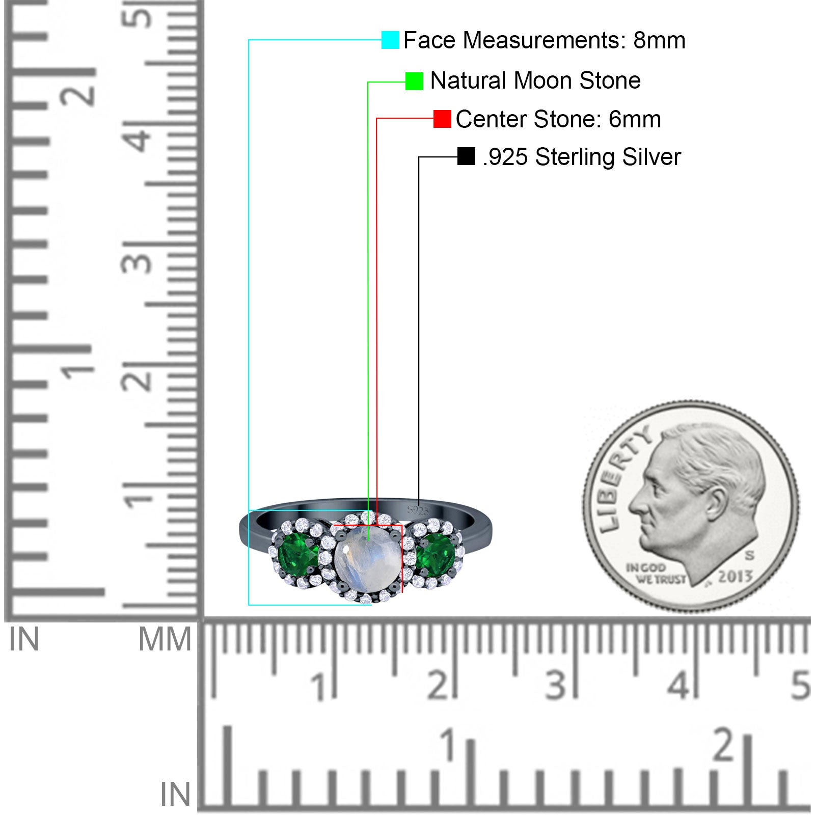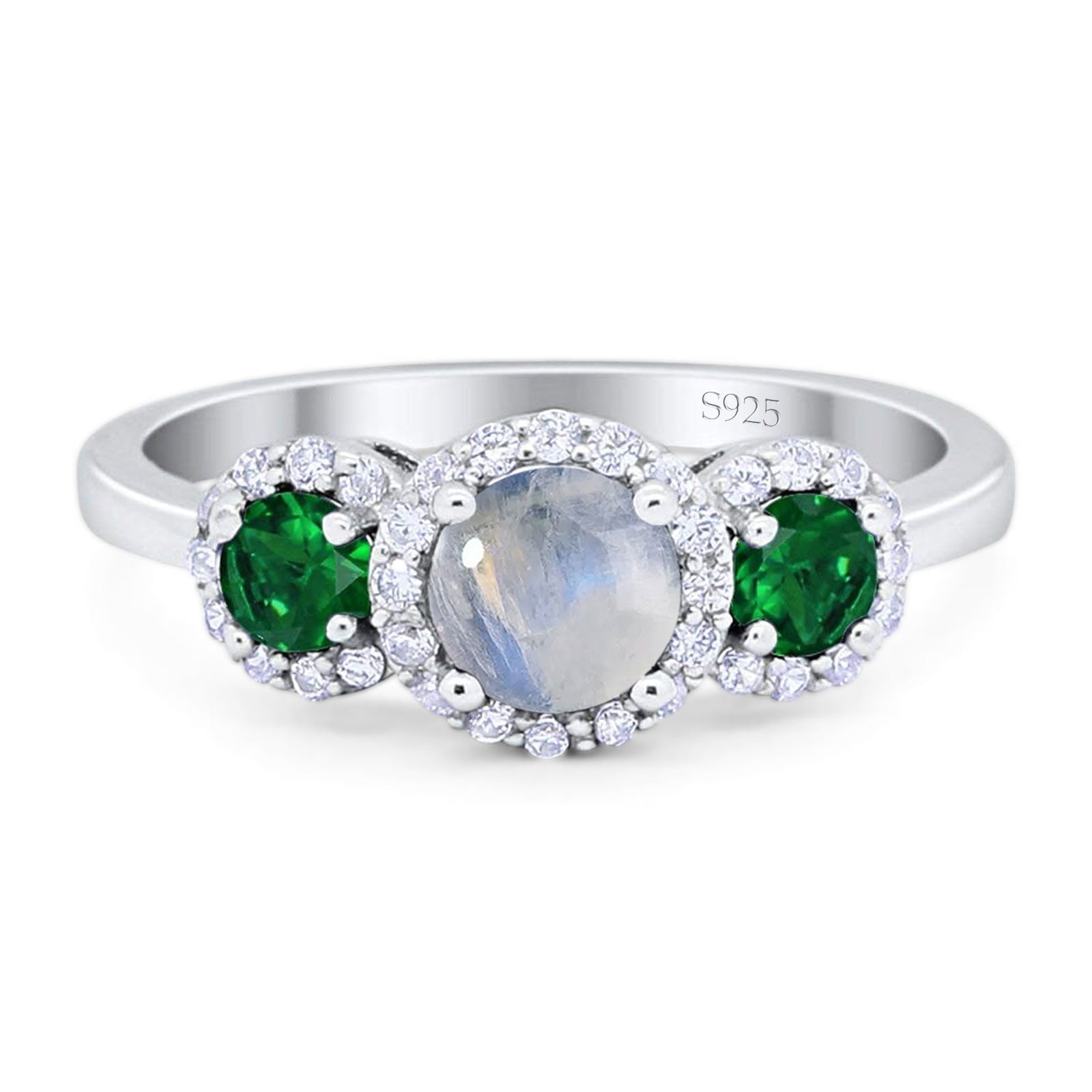 Three Stone Round Natural Moonstone Art Deco Ring 925 Sterling Silver