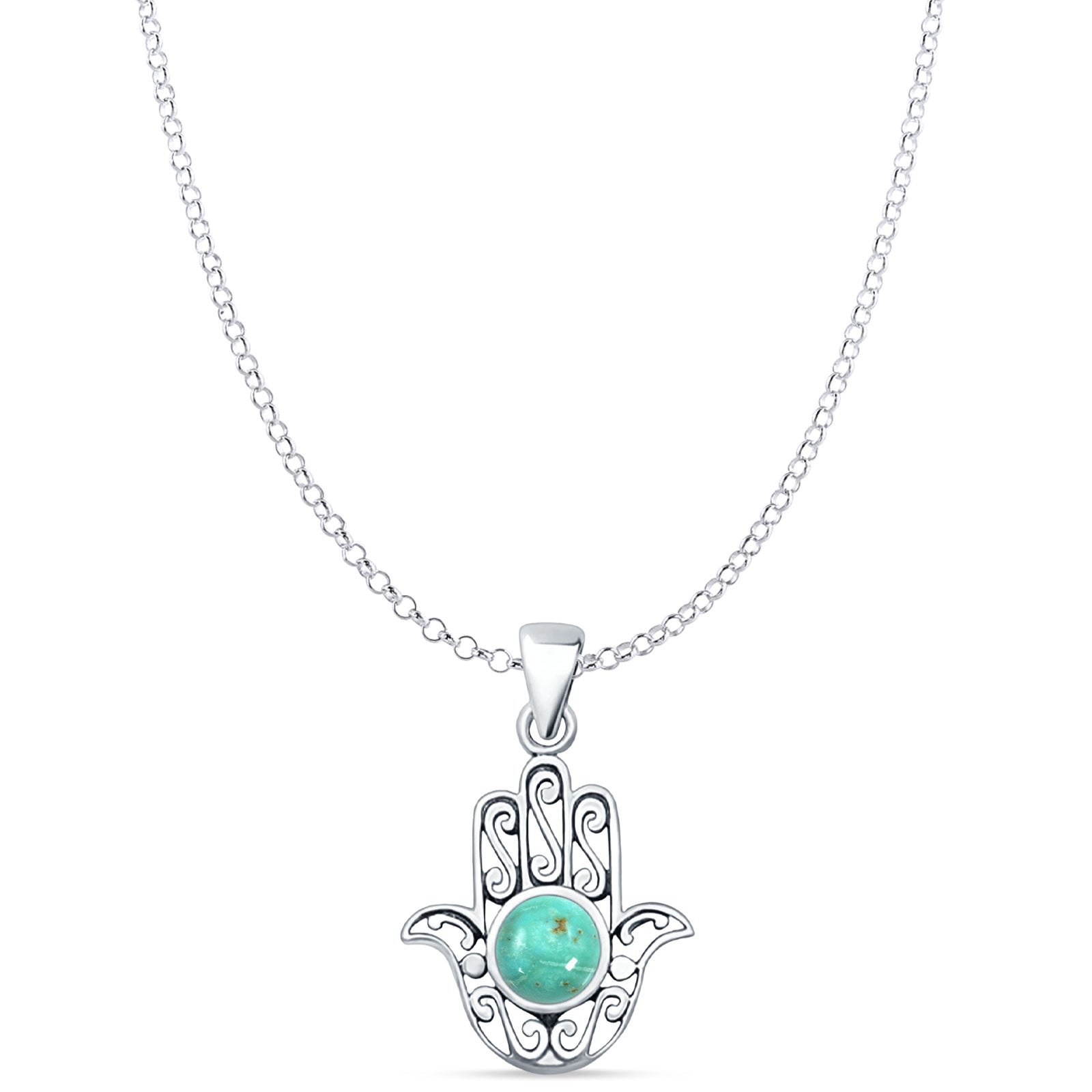 Turquoise Hand Of Hamsa Pendant Rolo Chain Necklace Oxidized 925 Sterling Silver