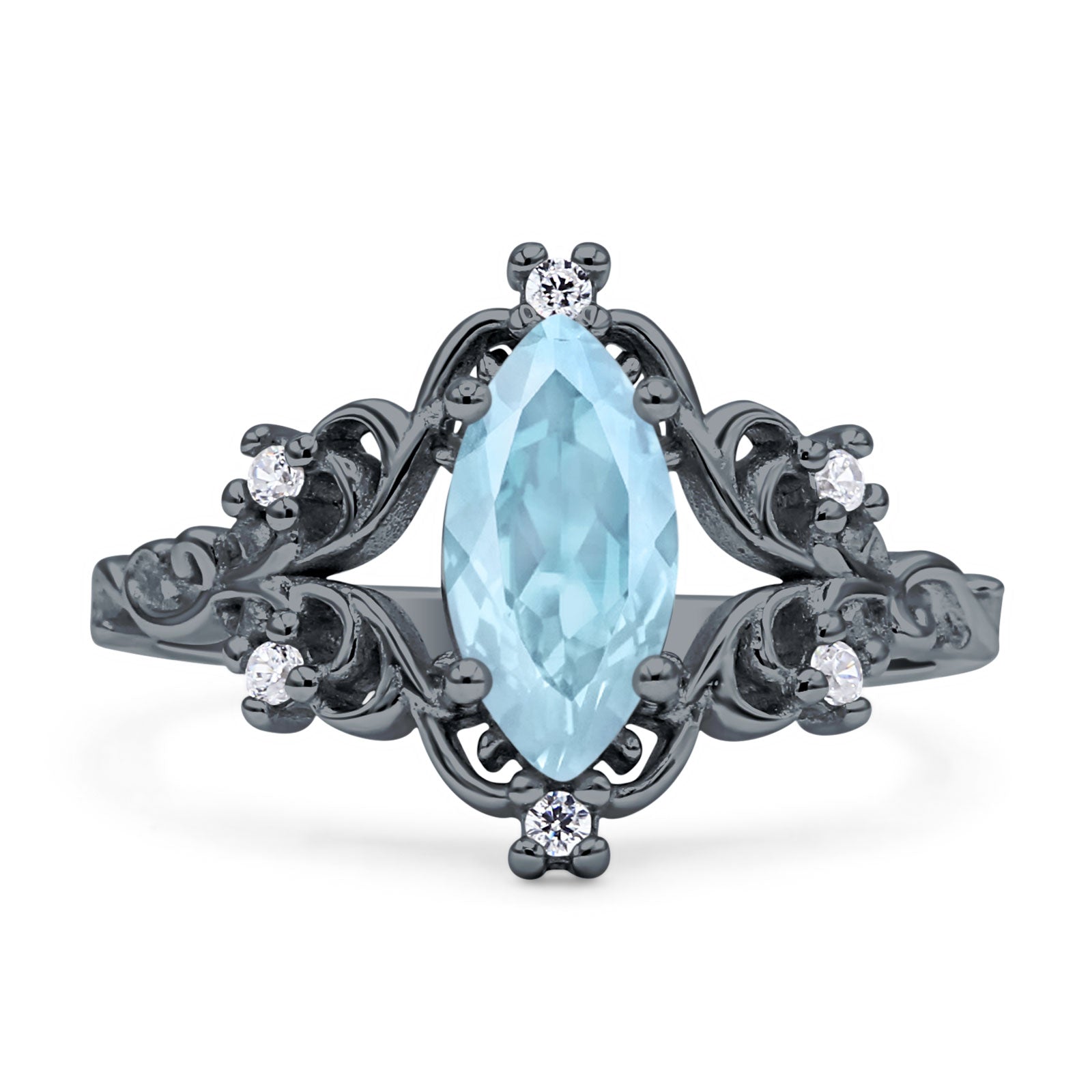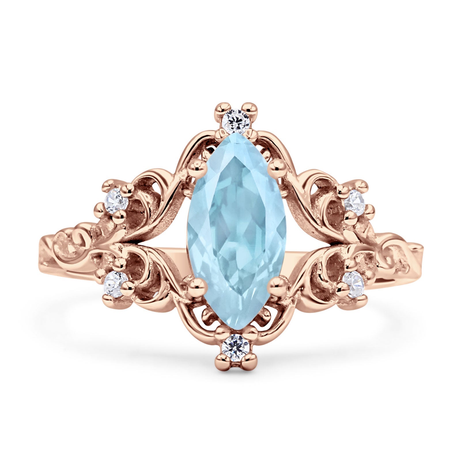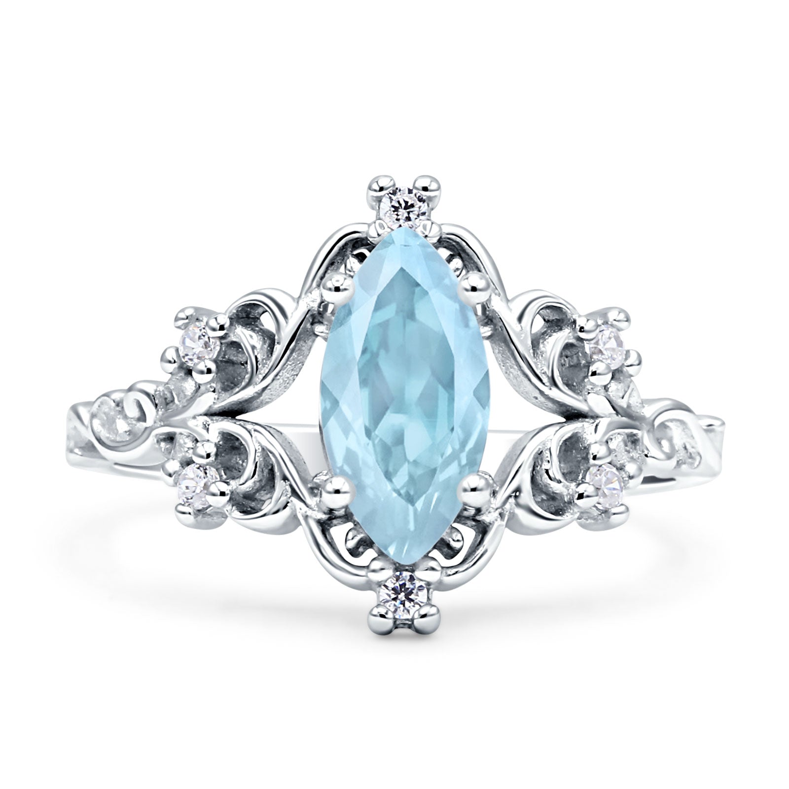Vintage Style Engagement Ring Marquise Natural Aquamarine 925 Sterling Silver