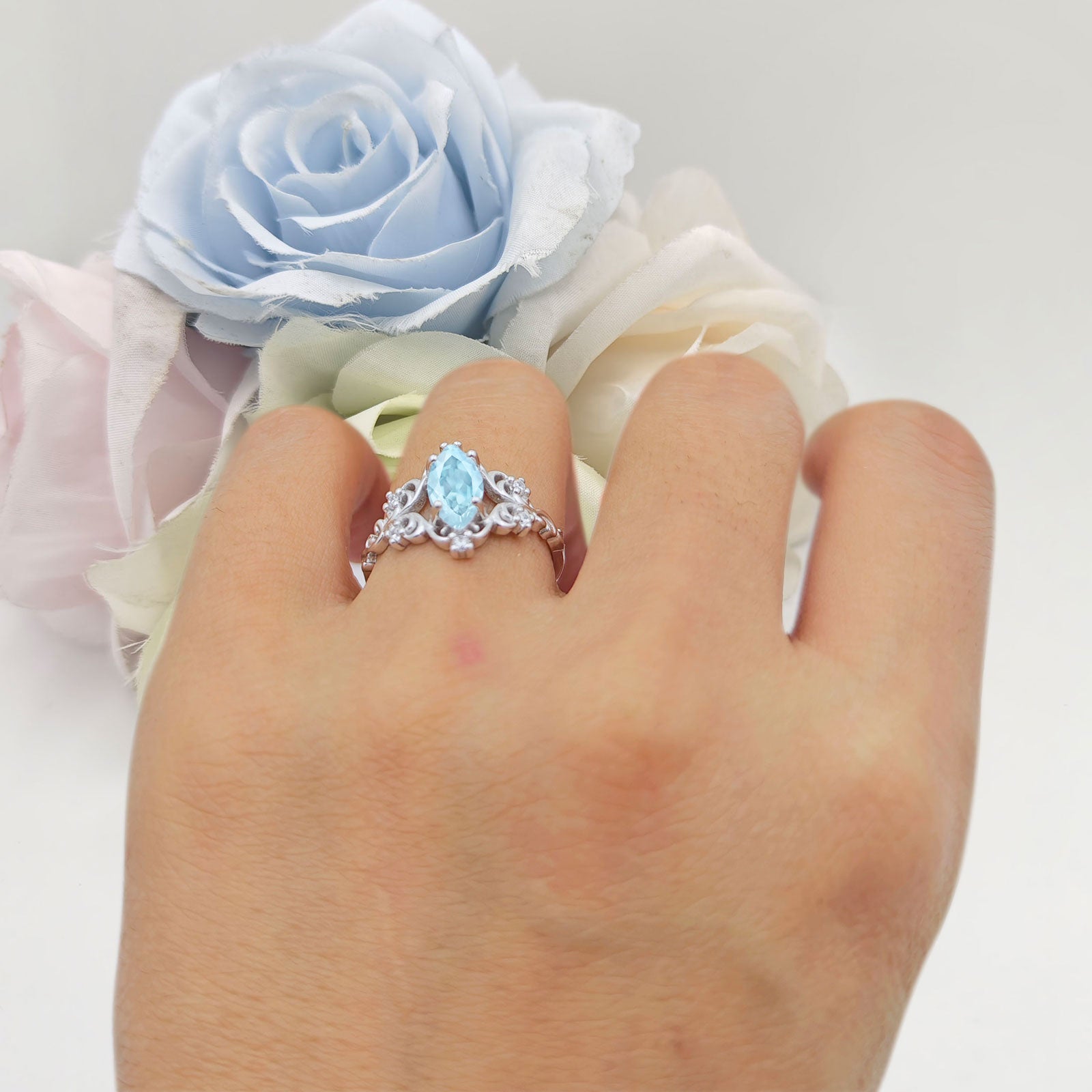 Product Description:Introducing our vintage style engagement ring featuring a captivating marquise natural aquamarine set in 925 sterling silver. Embracing the allure of yesteryears, this ring exudes timeless elegance with its vintage-inspired design. Perfect for expressing your love with a touch of old-world charm and sophistication.