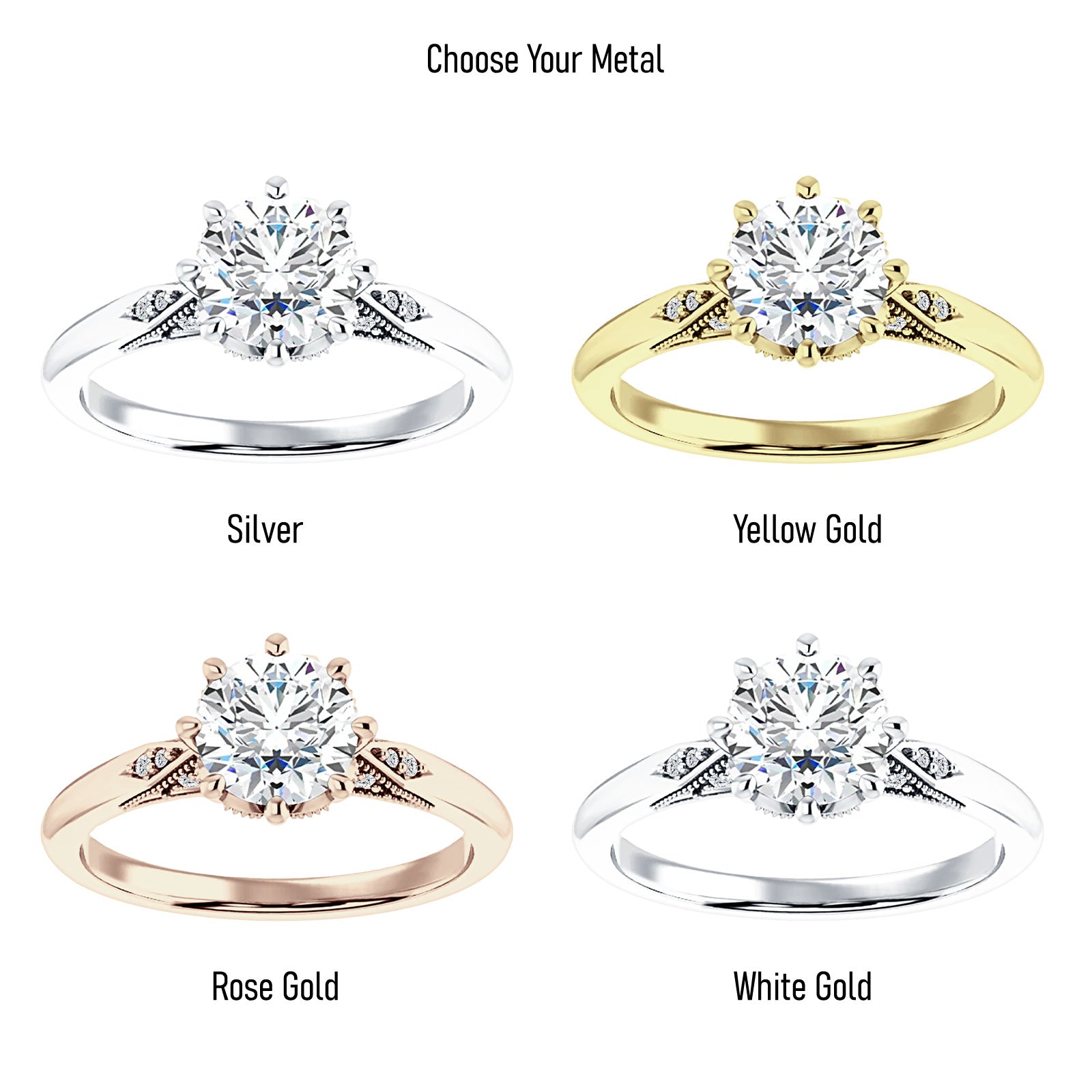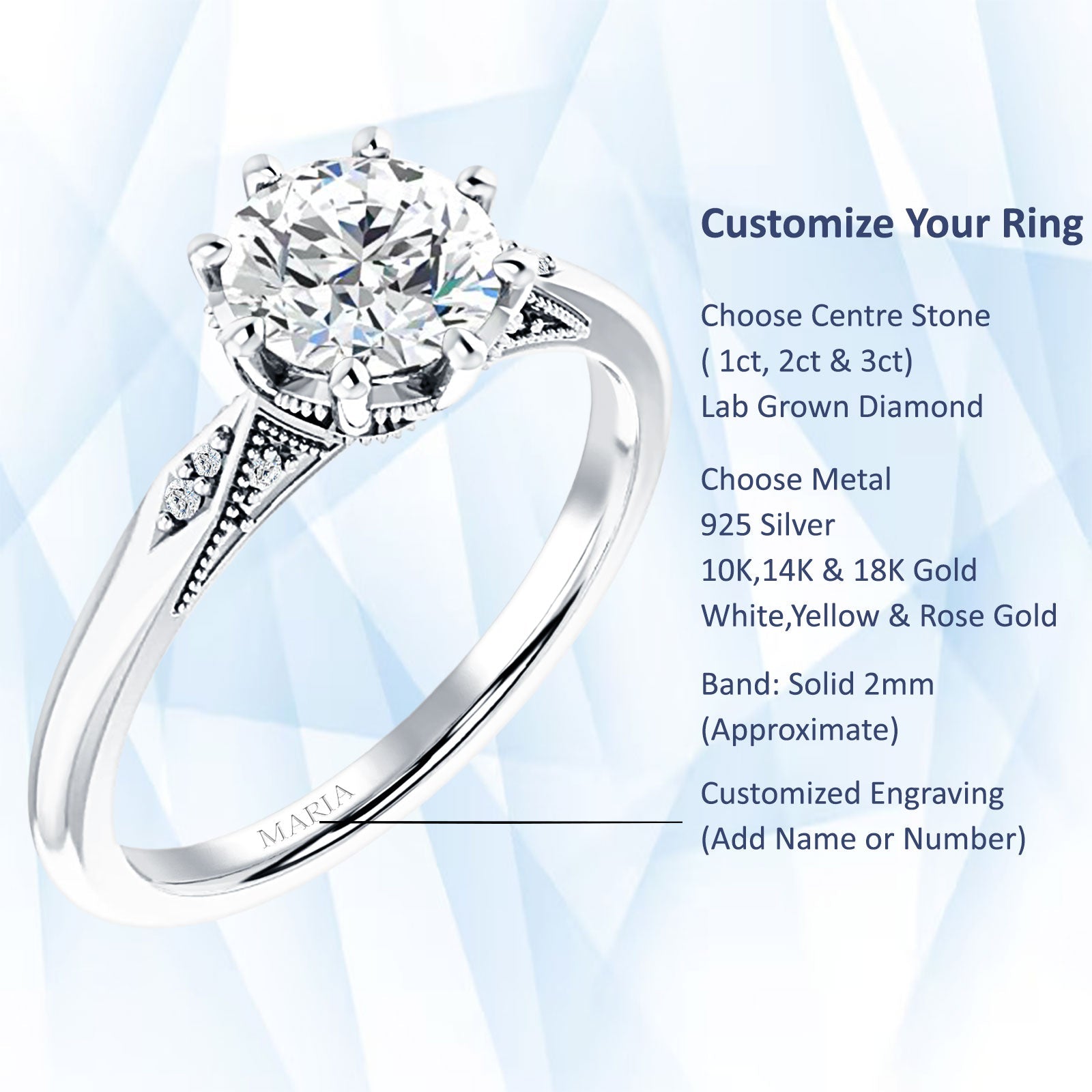 This lab grown diamond ring is available in three different carat weights and also comes in a choice of various metal types.(Tarnish Resistant Sterling Silver, 14K Gold & 18K Gold)