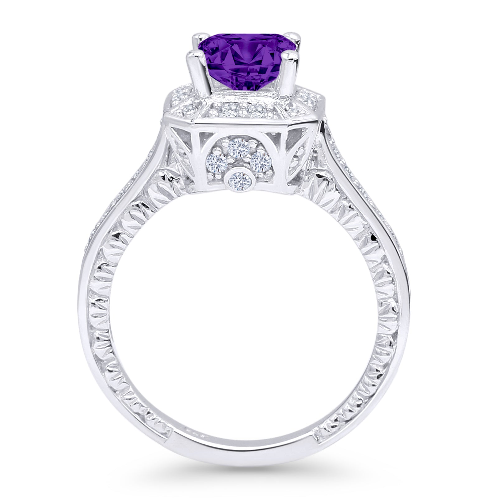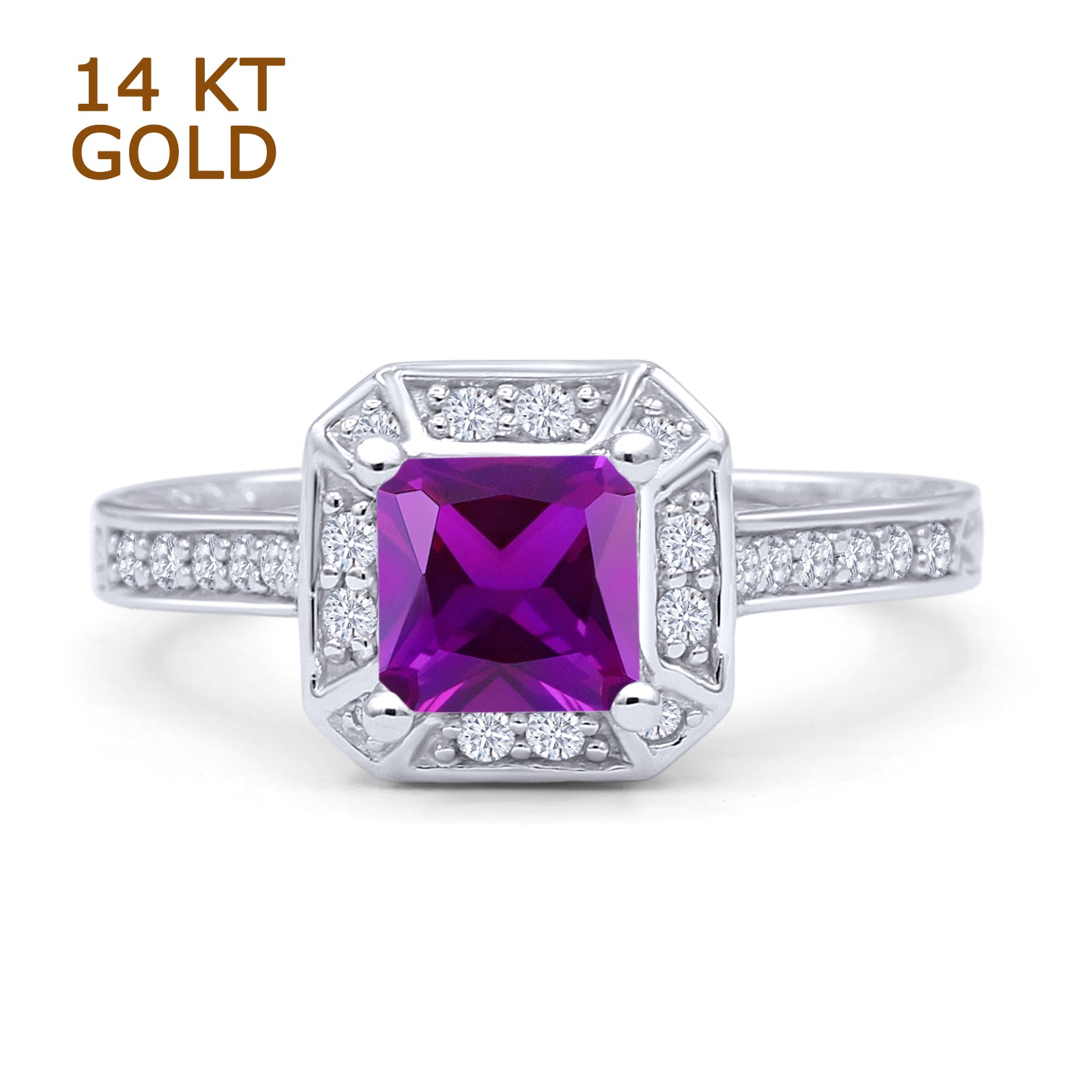 14K White Gold Art Deco Princess Cut Halo Amethyst CZ Ring