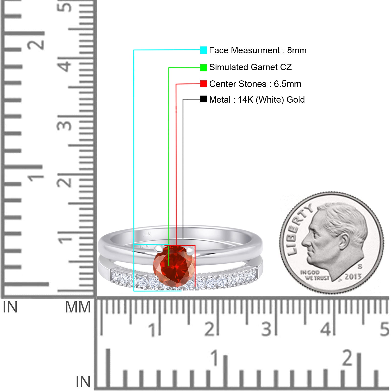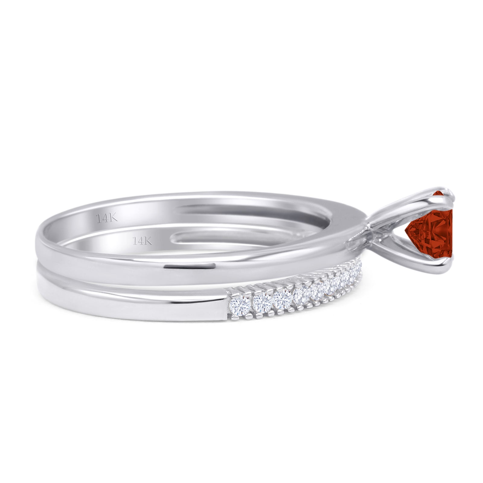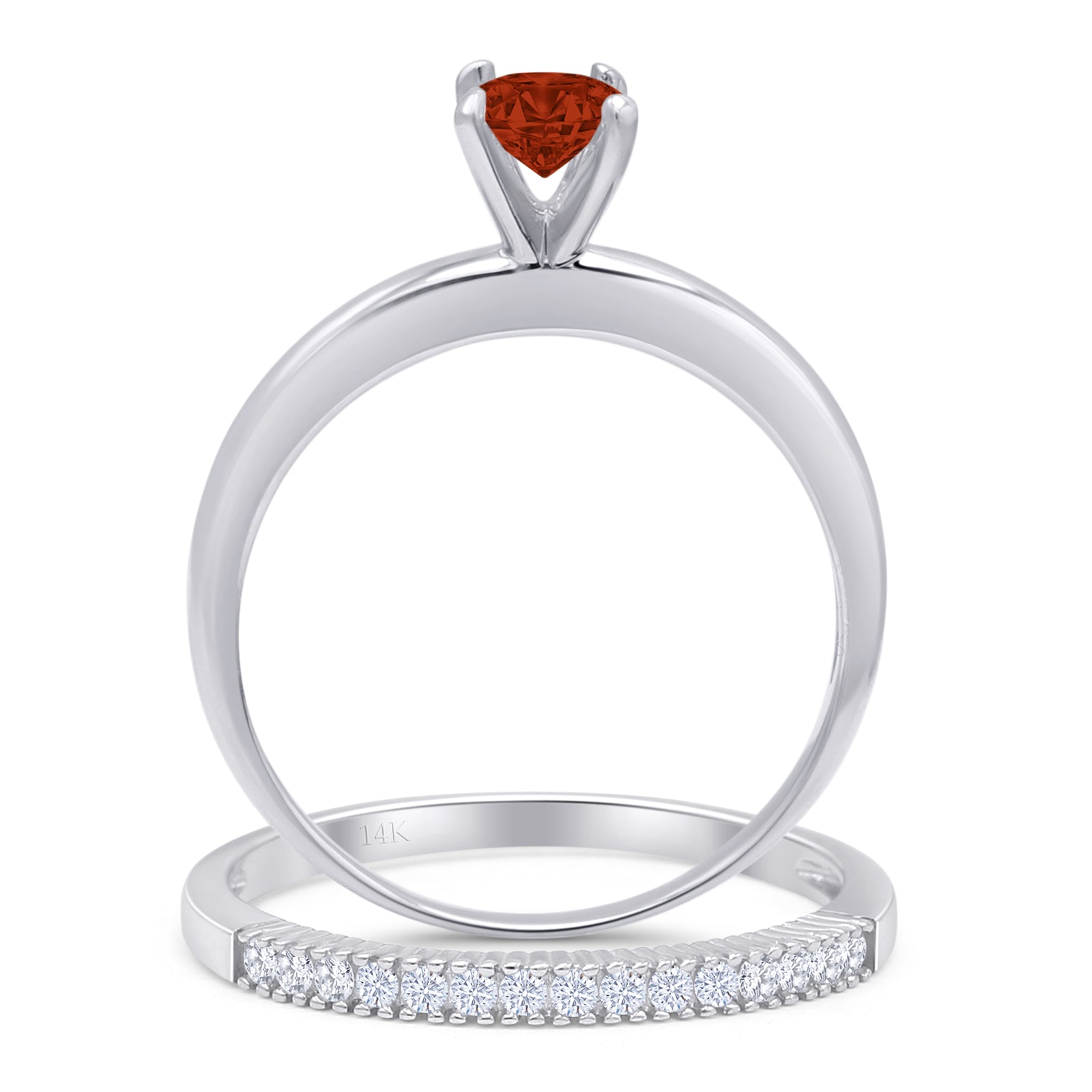14K White Gold Two Piece Round Solitaire Half Eternity Band Garnet CZ Bridal Ring
