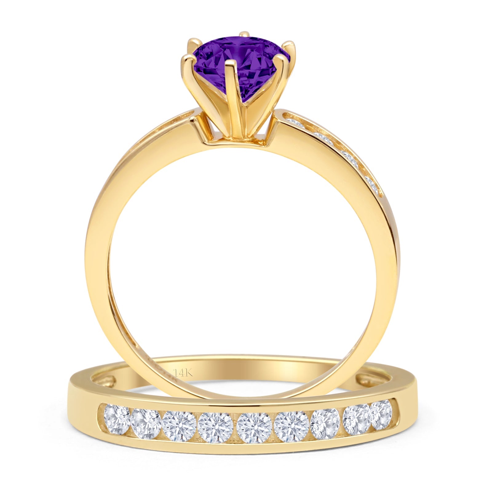 14K Yellow Gold Two Piece Half Eternity Round Amethyst CZ Cathedral Ring