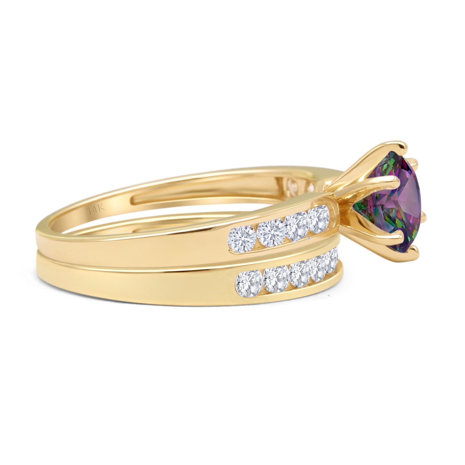 14K Yellow Gold Two Piece Half Eternity Round Rainbow CZ Cathedral Ring