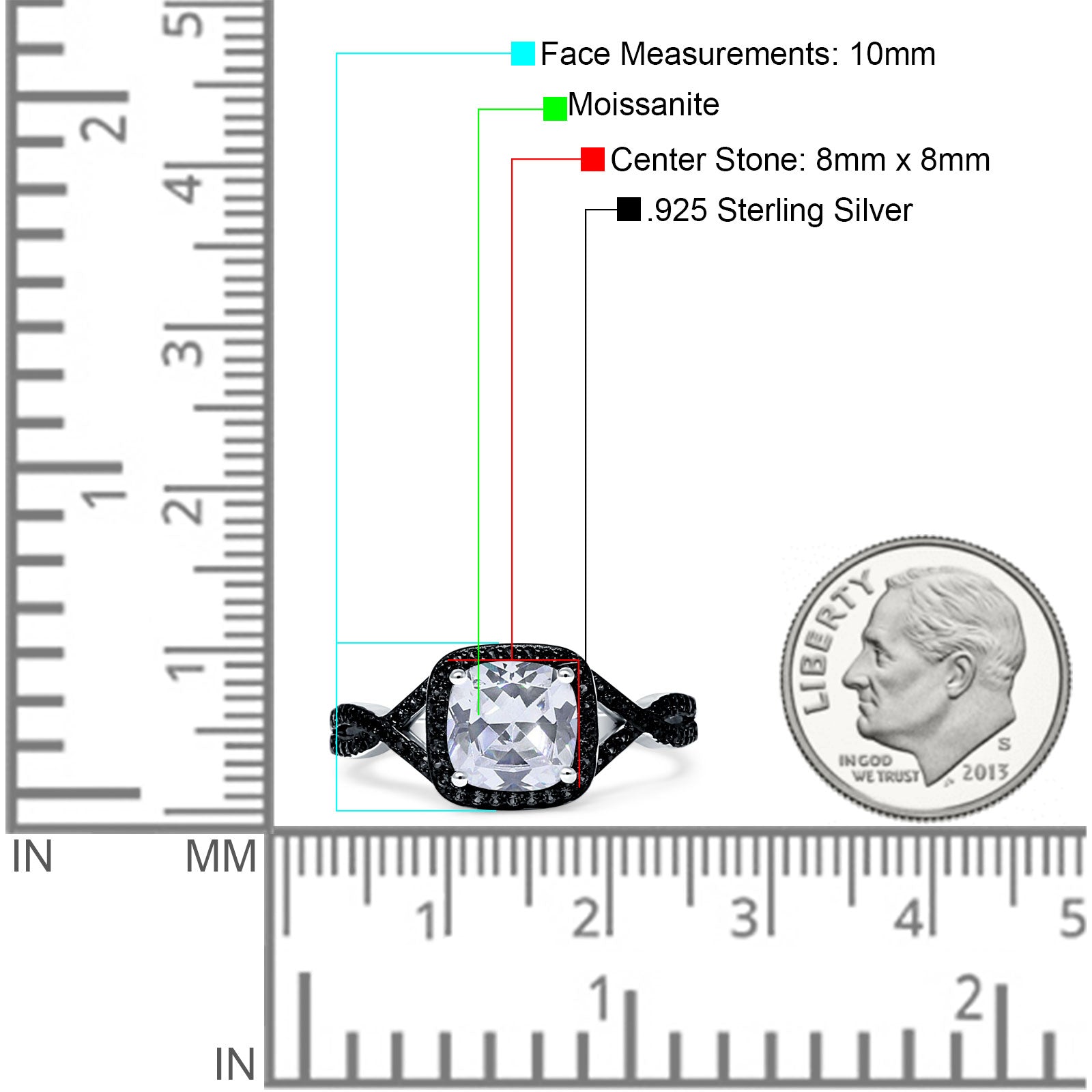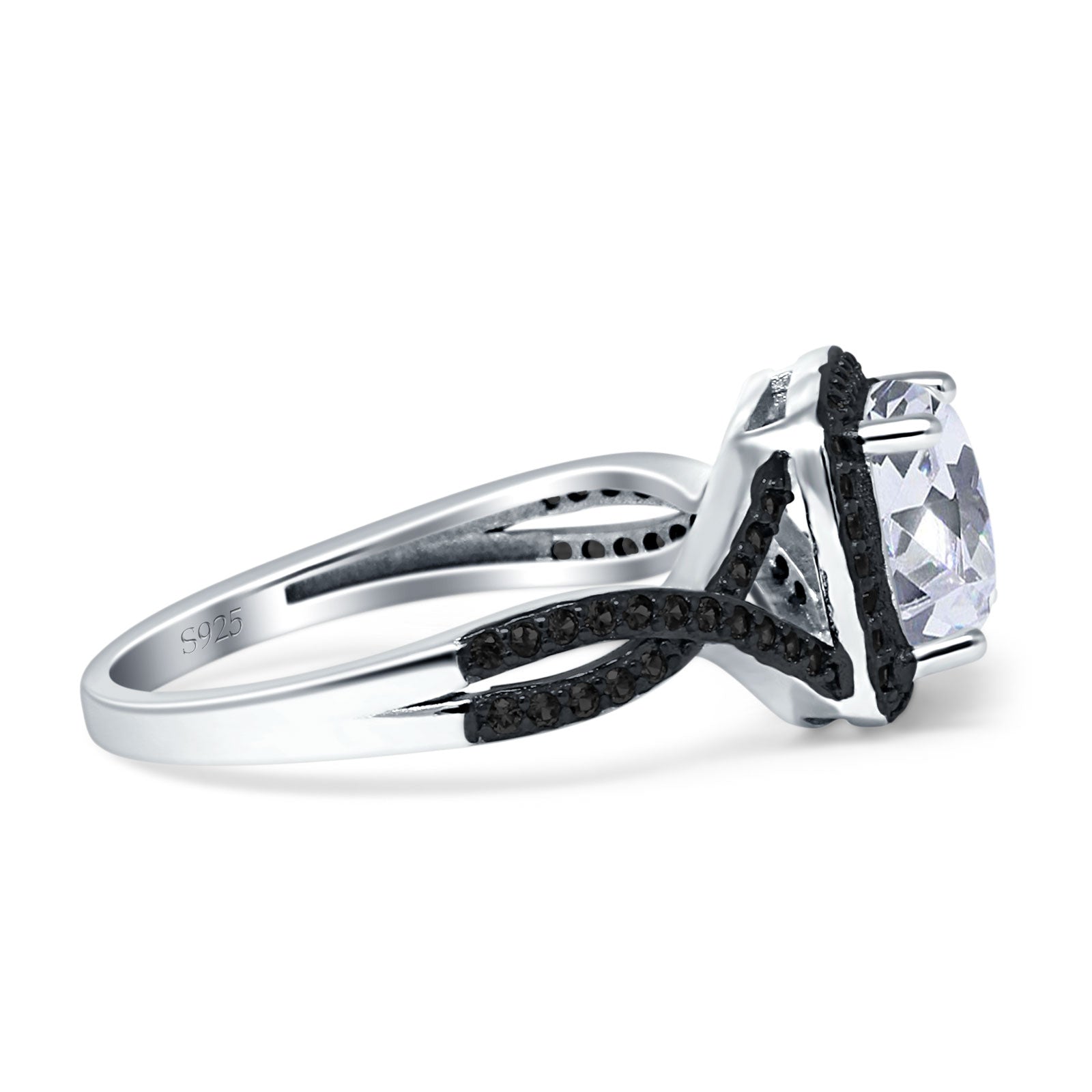 Art Deco Cushion Cut Halo Moissanite Side Stone Black CZ Ring 925 Sterling Silver