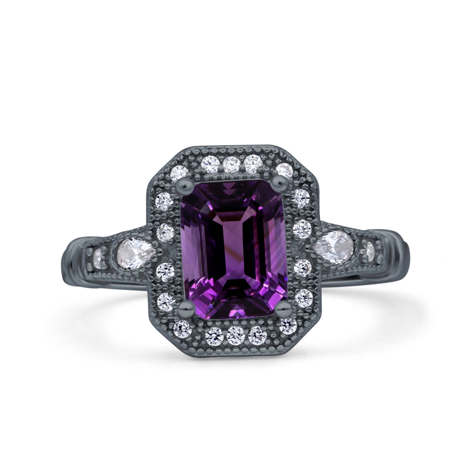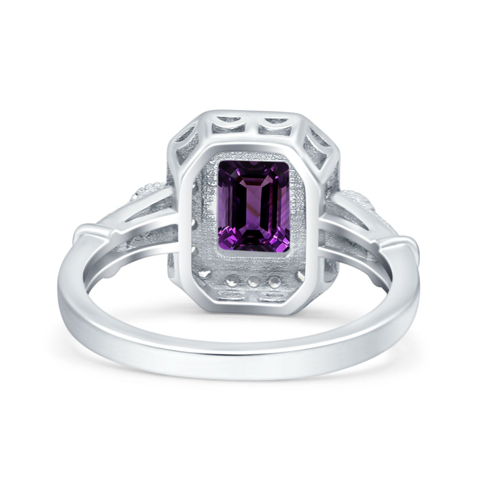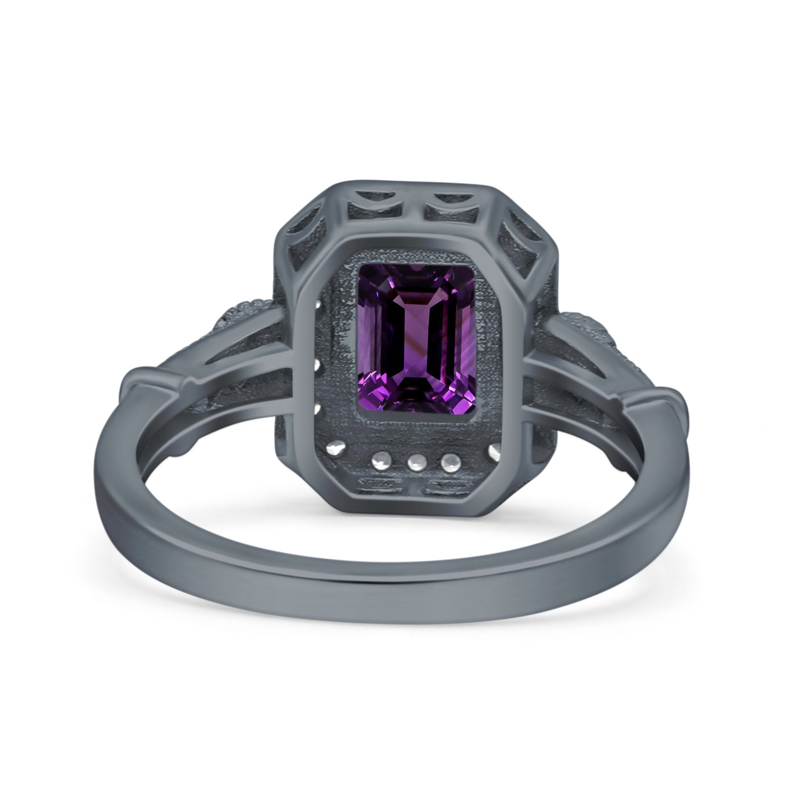 Art Deco Emerald Cut Natural Amethyst Halo Beaded Bridal Ring 925 Sterling Silver