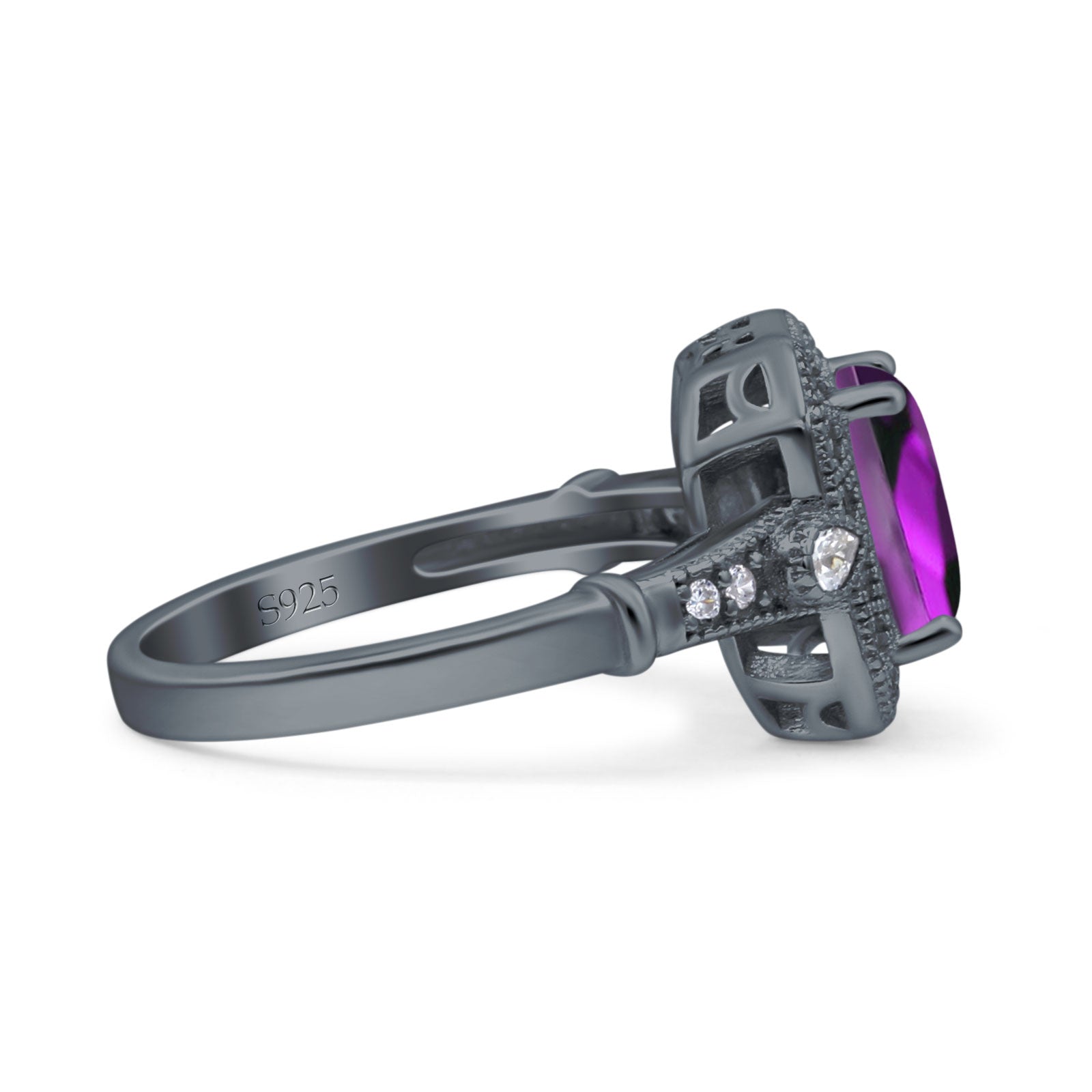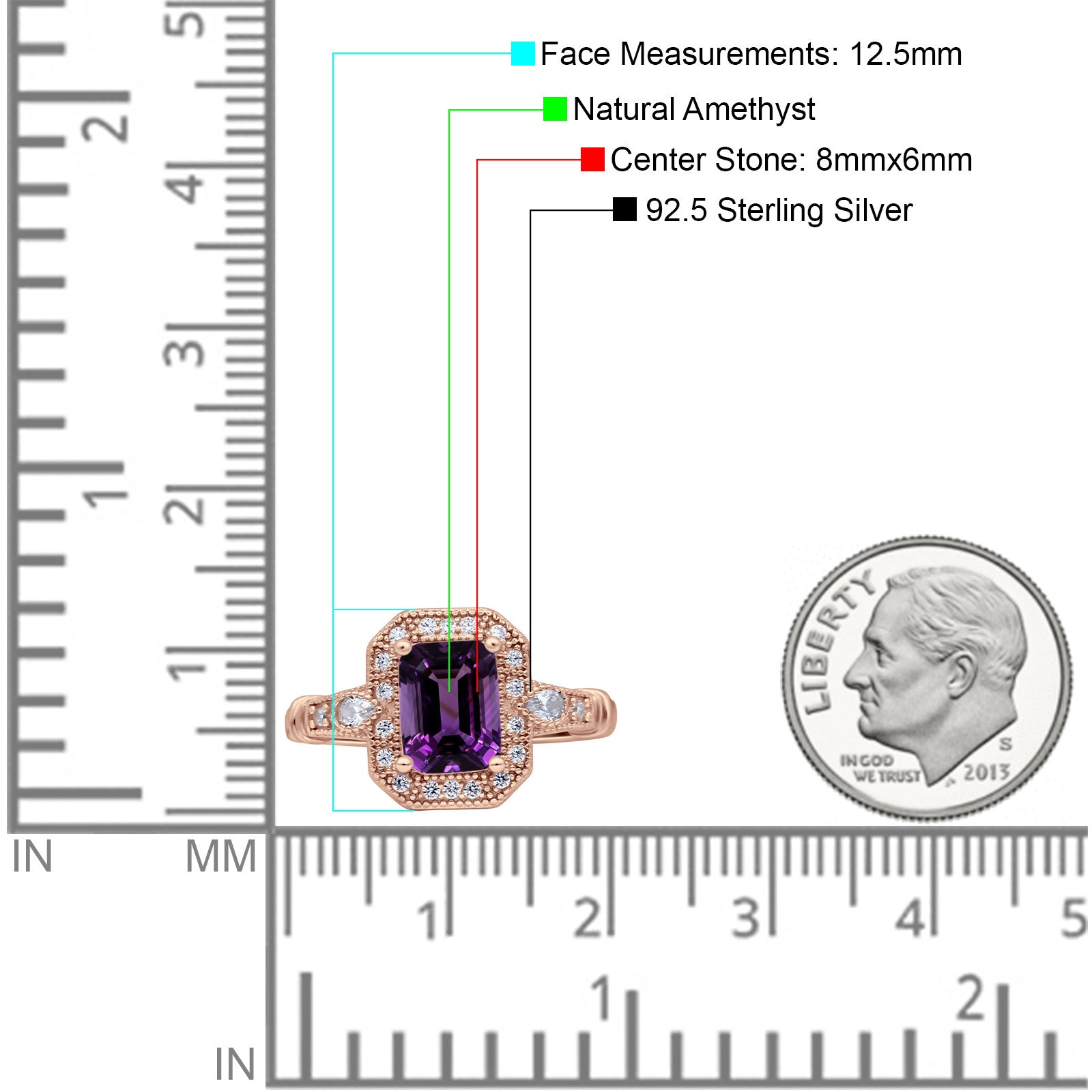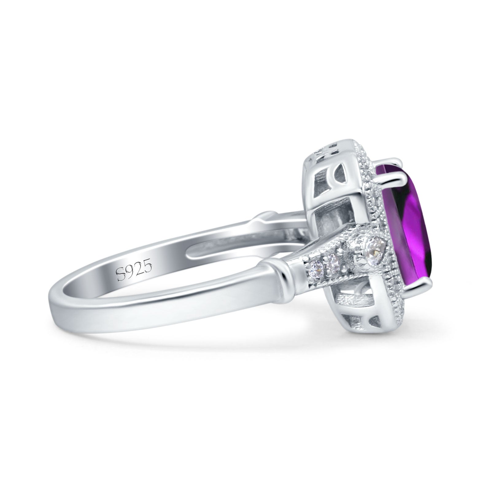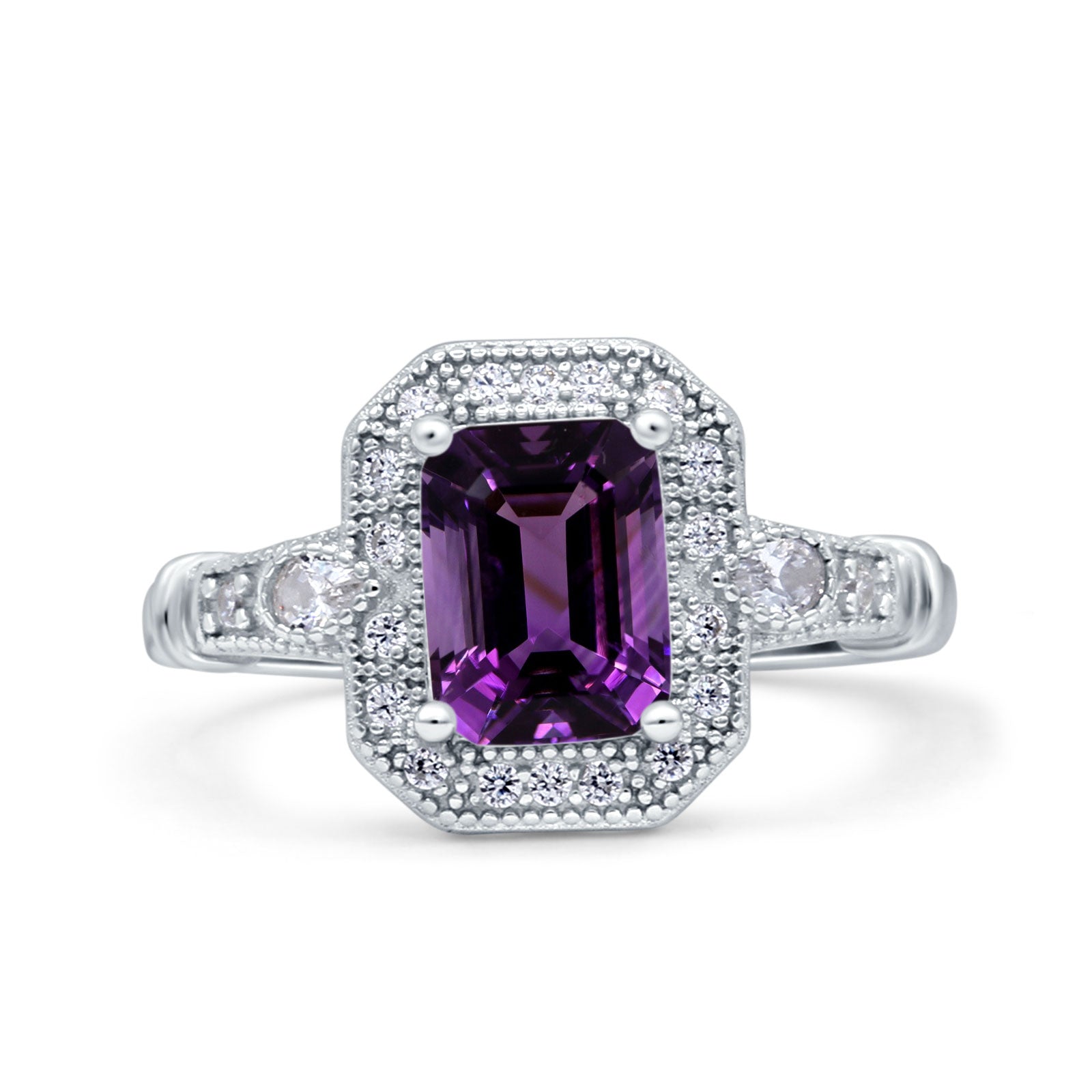 Art Deco Emerald Cut Natural Amethyst Halo Beaded Bridal Ring 925 Sterling Silver