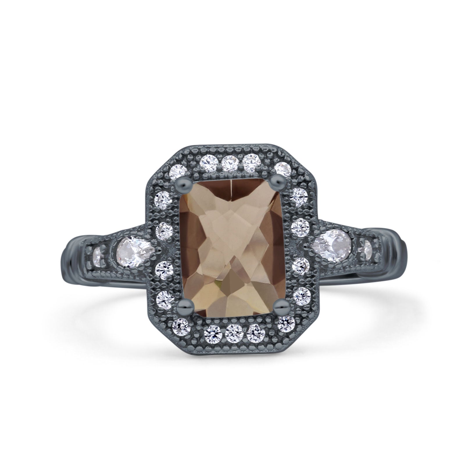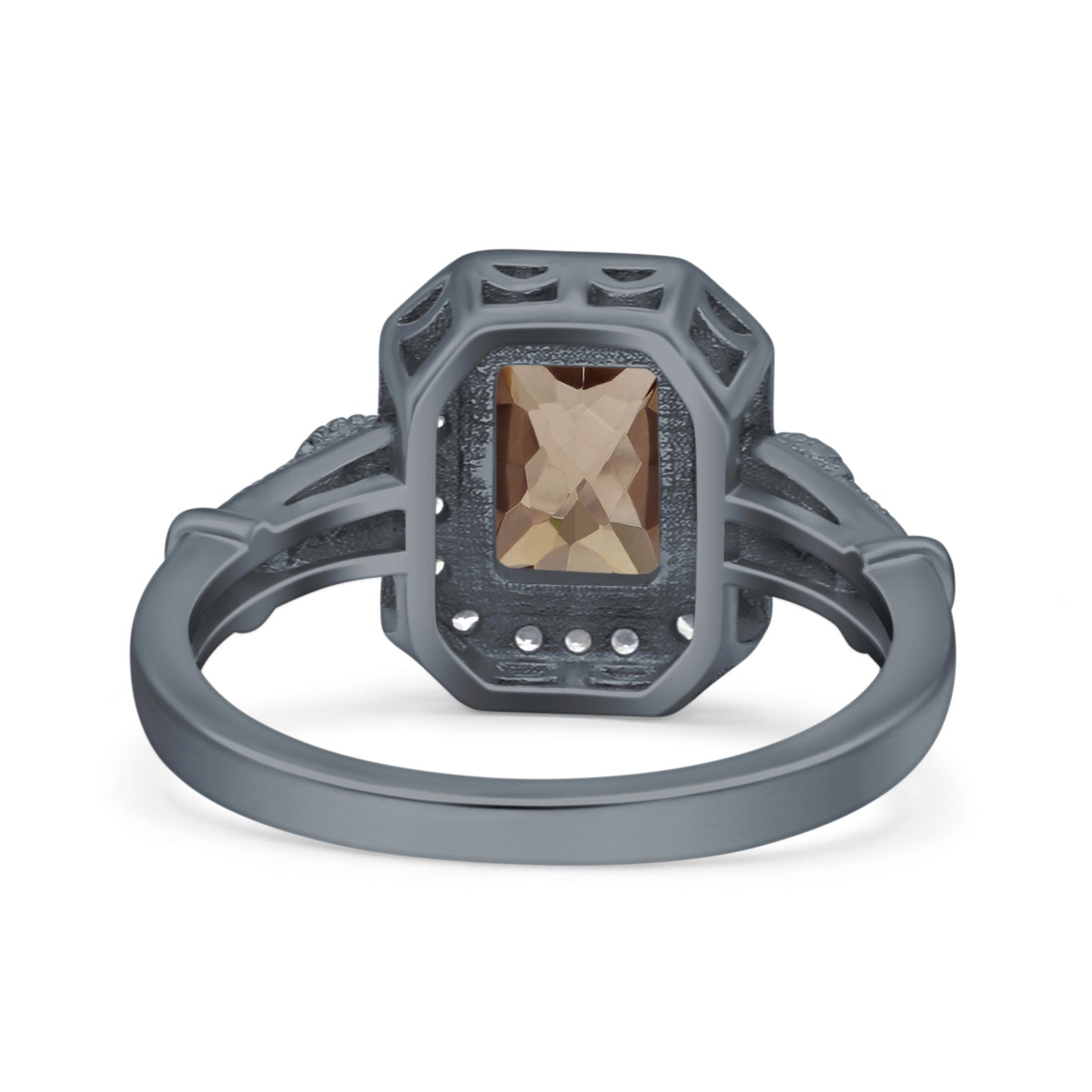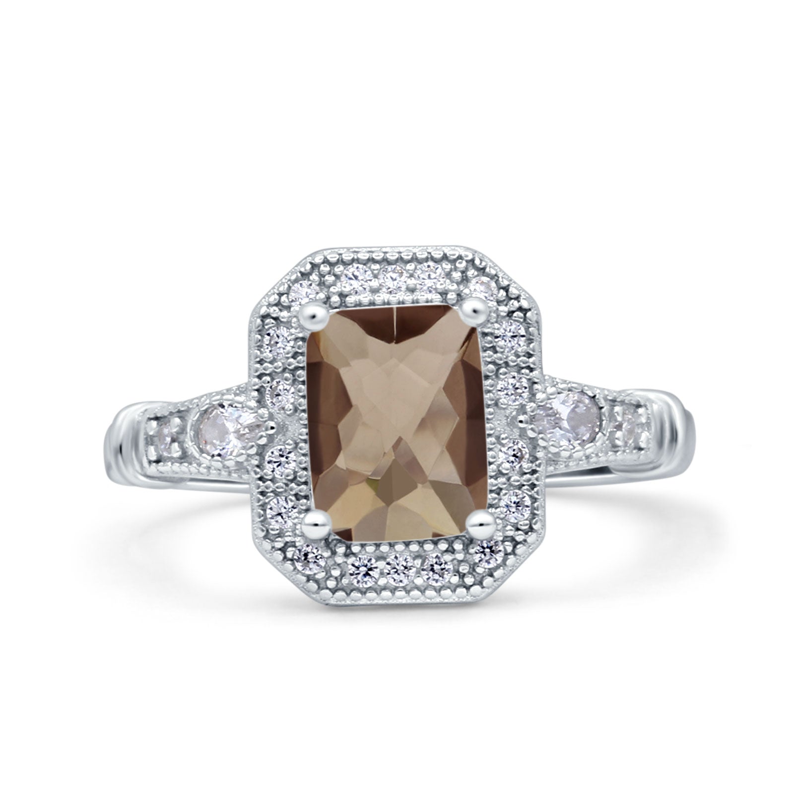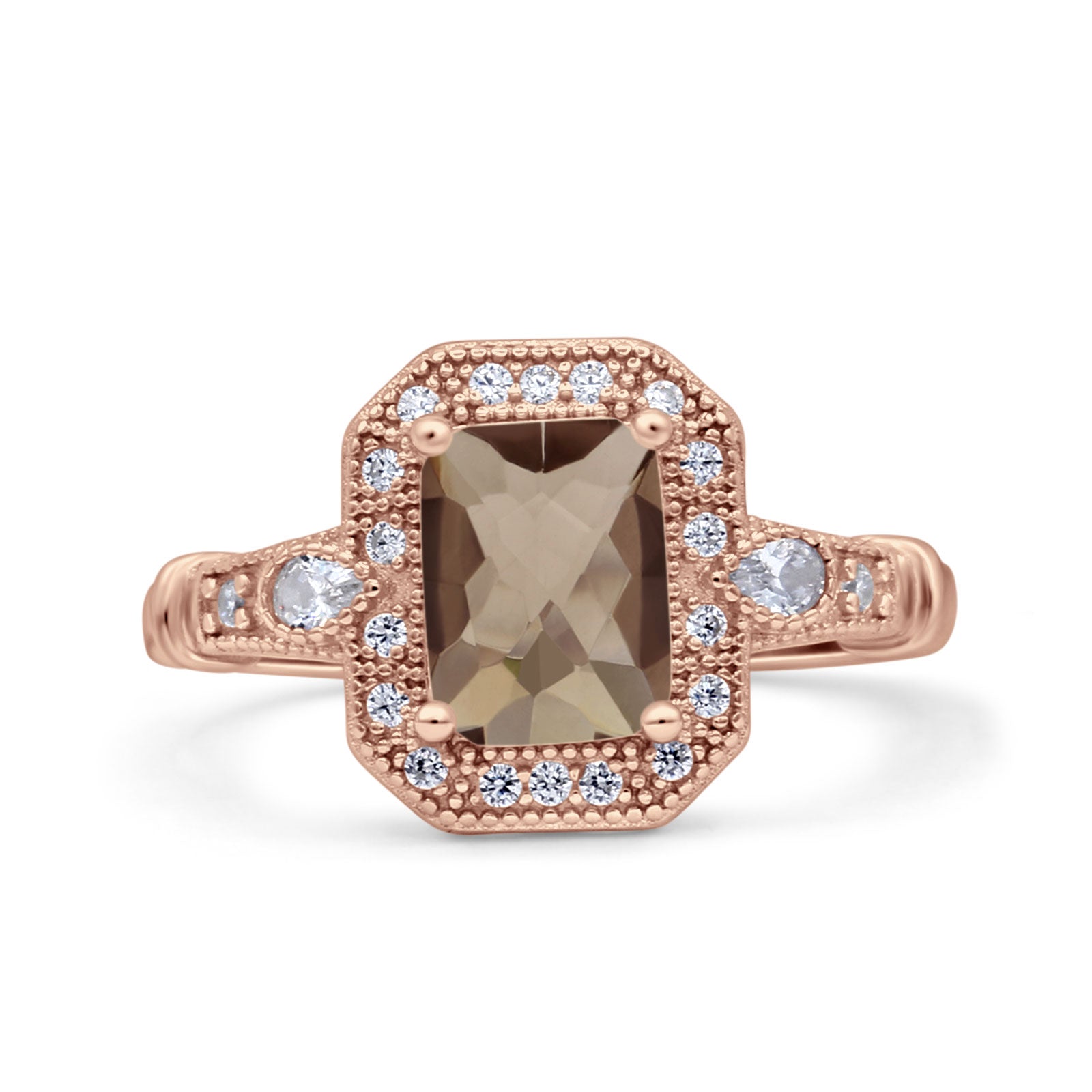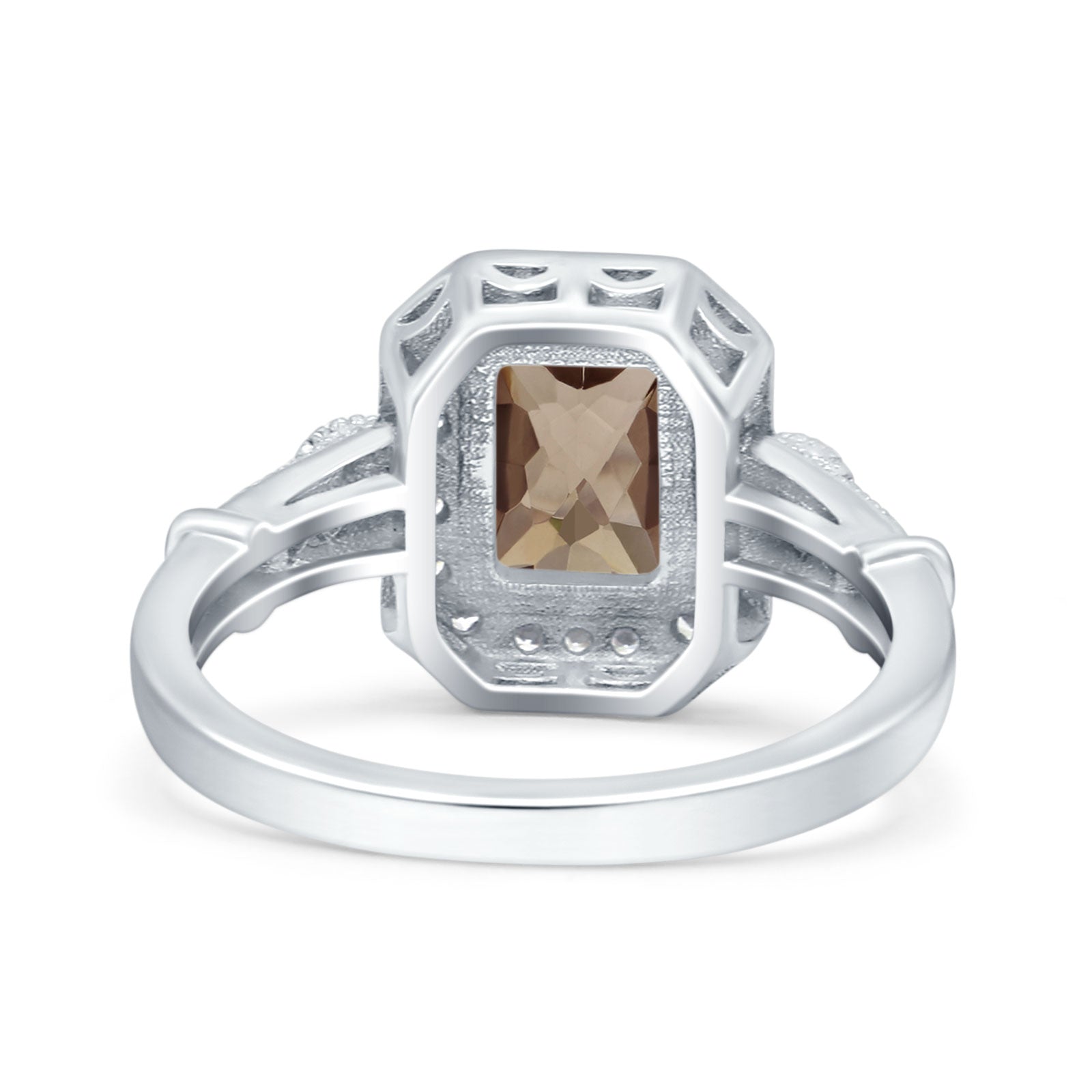 Art Deco Emerald Cut Natural Chocolate Smoky Quartz Halo Beaded Bridal Ring 925 Sterling Silver
