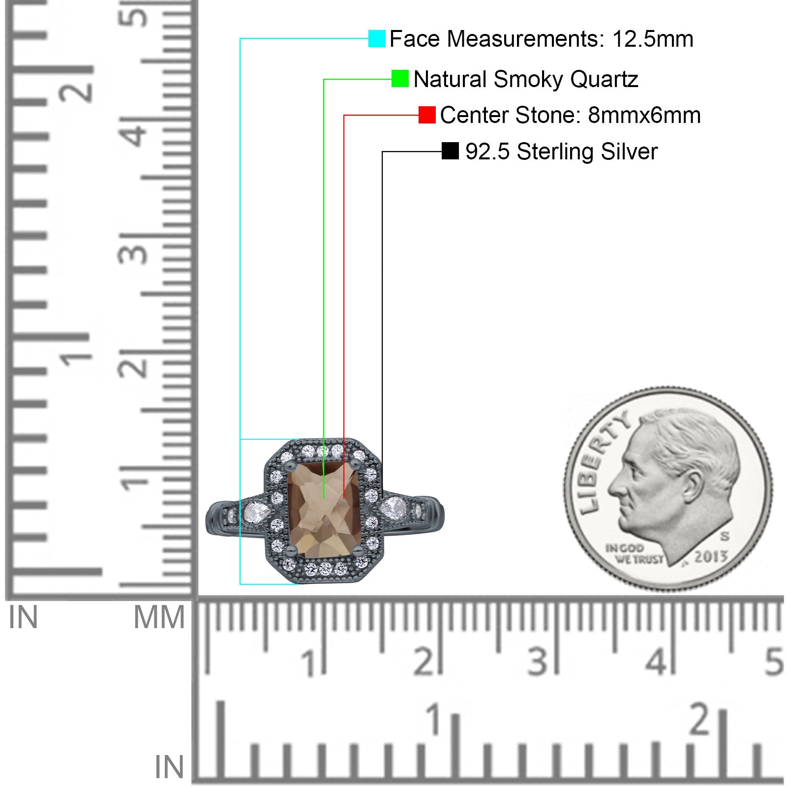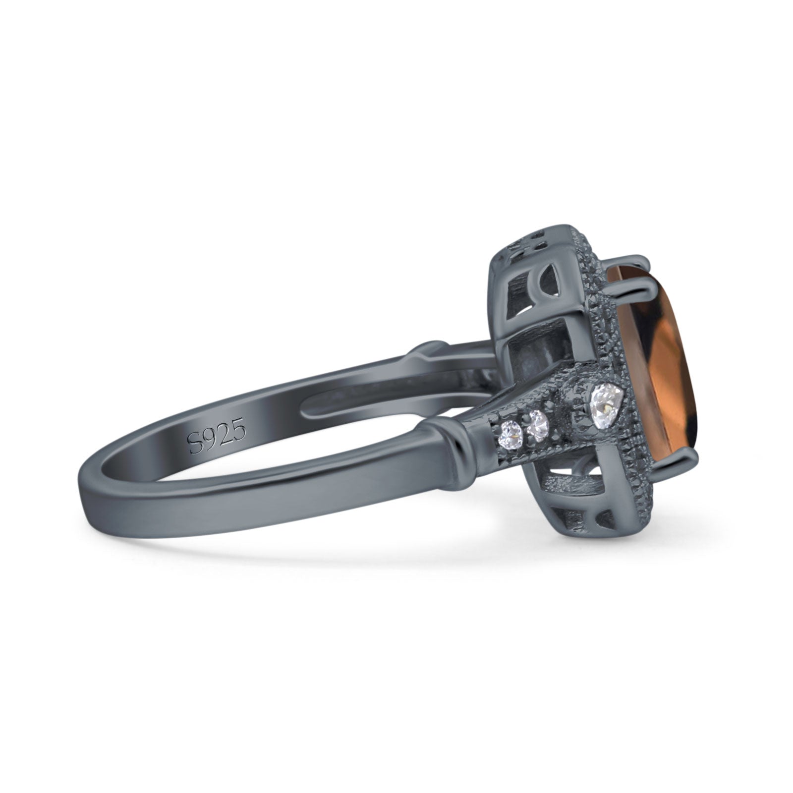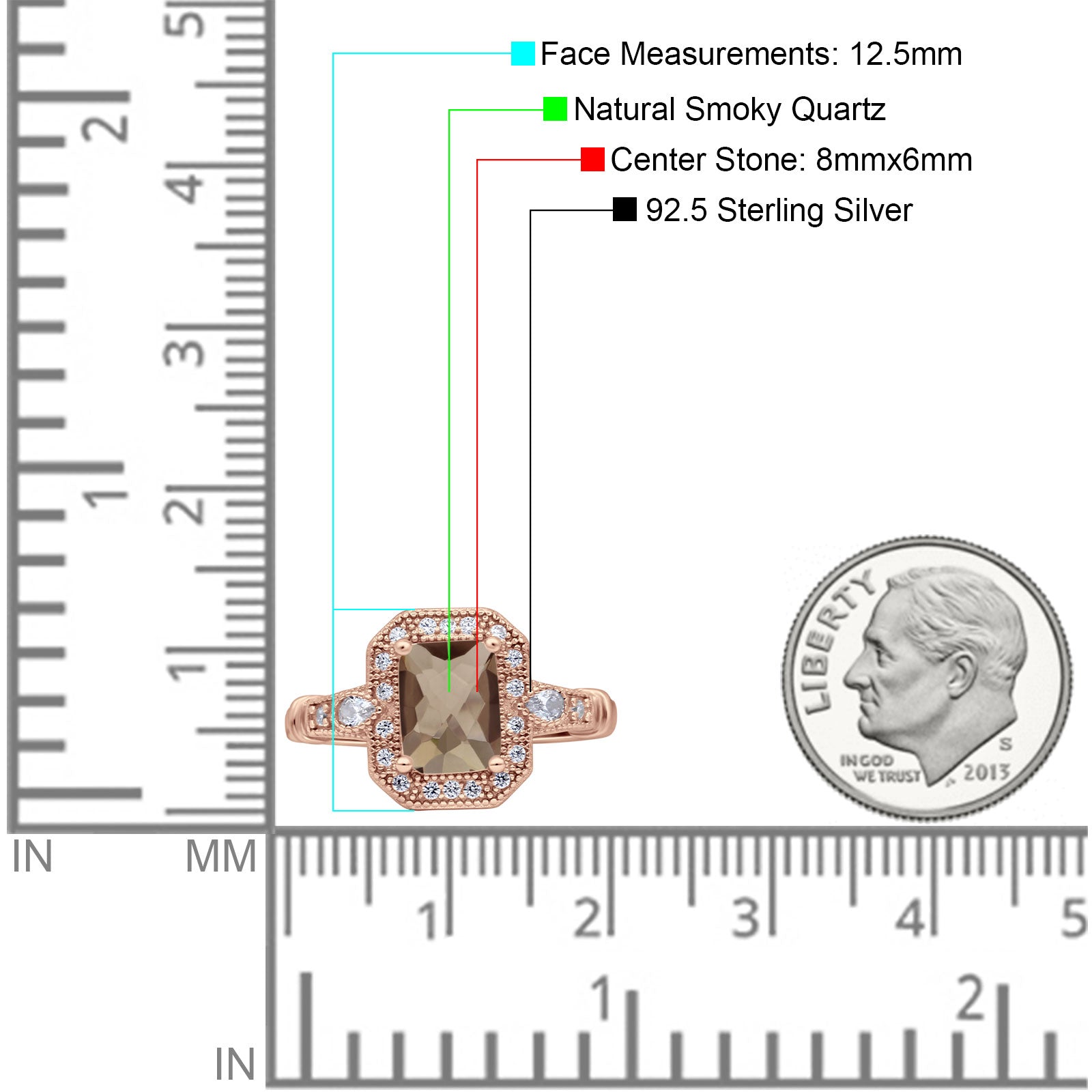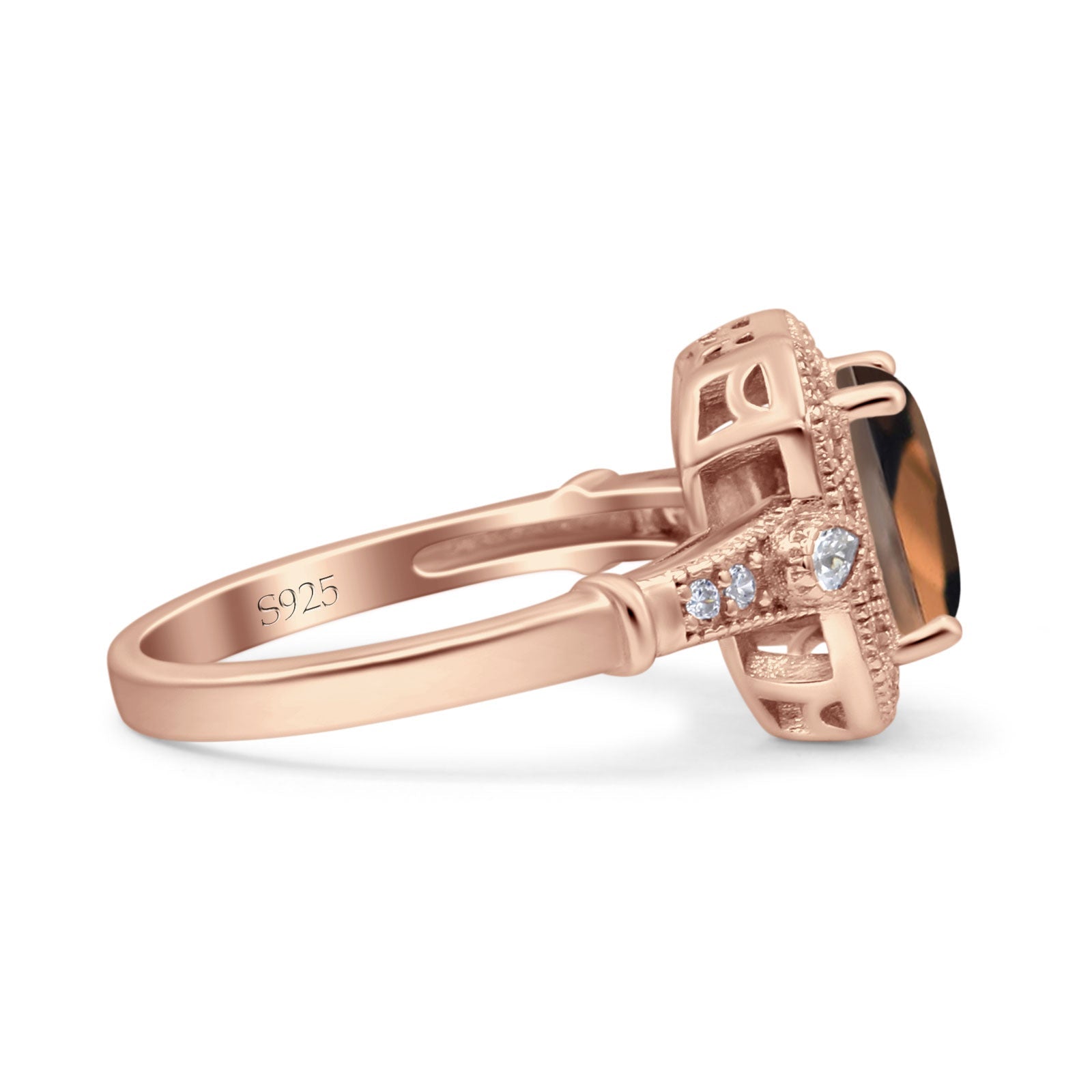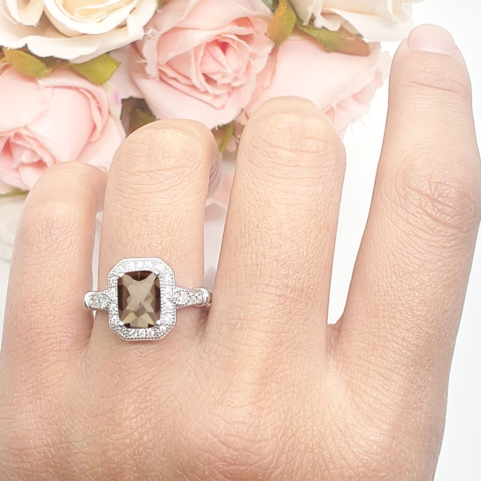 Art Deco Emerald Cut Natural Chocolate Smoky Quartz Halo Beaded Bridal Ring 925 Sterling Silver