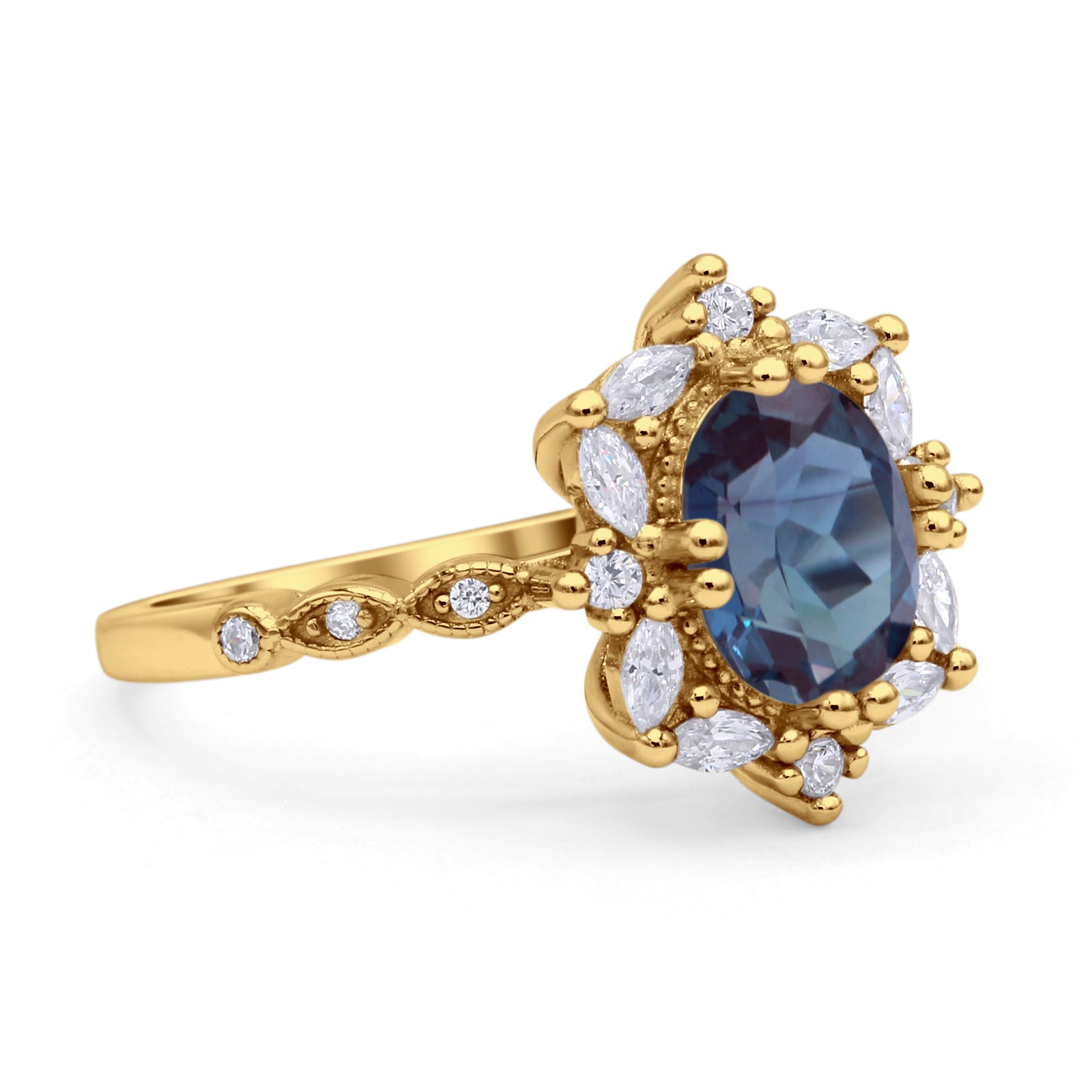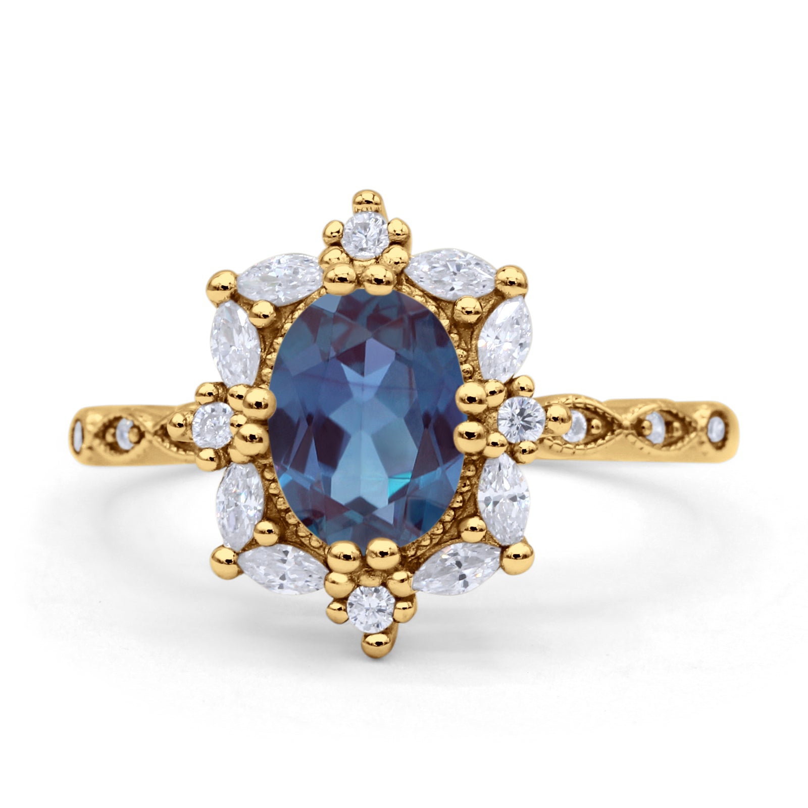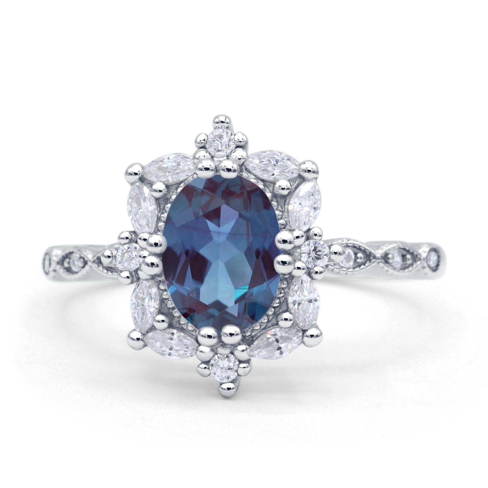 Art Deco Oval Lab Alexandrite Halo Ballerina Style Engagement Ring