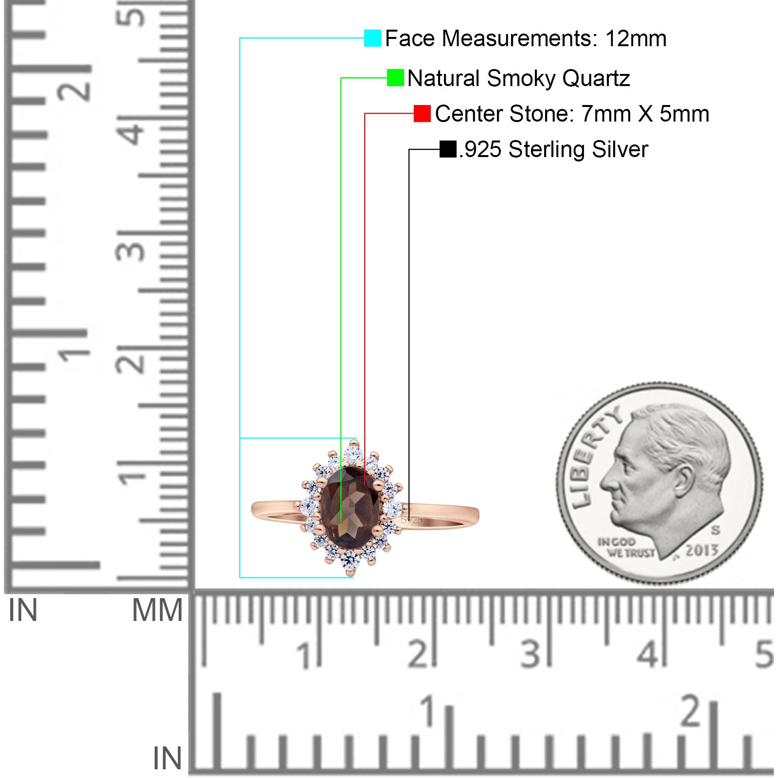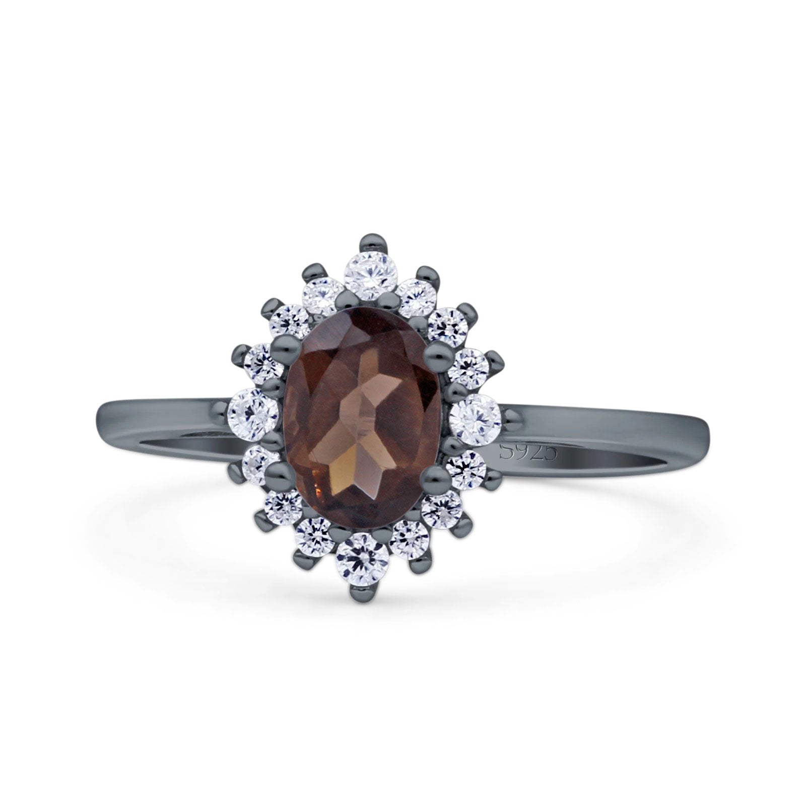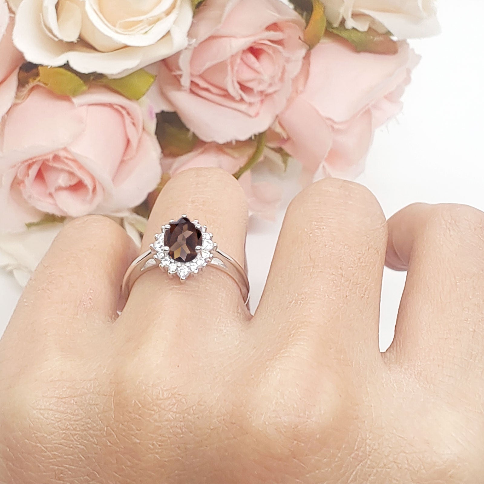 Art Deco Oval Natural Chocolate Smoky Quartz Halo Floral Cubic Zirconia Ring 925 Sterling Silver
