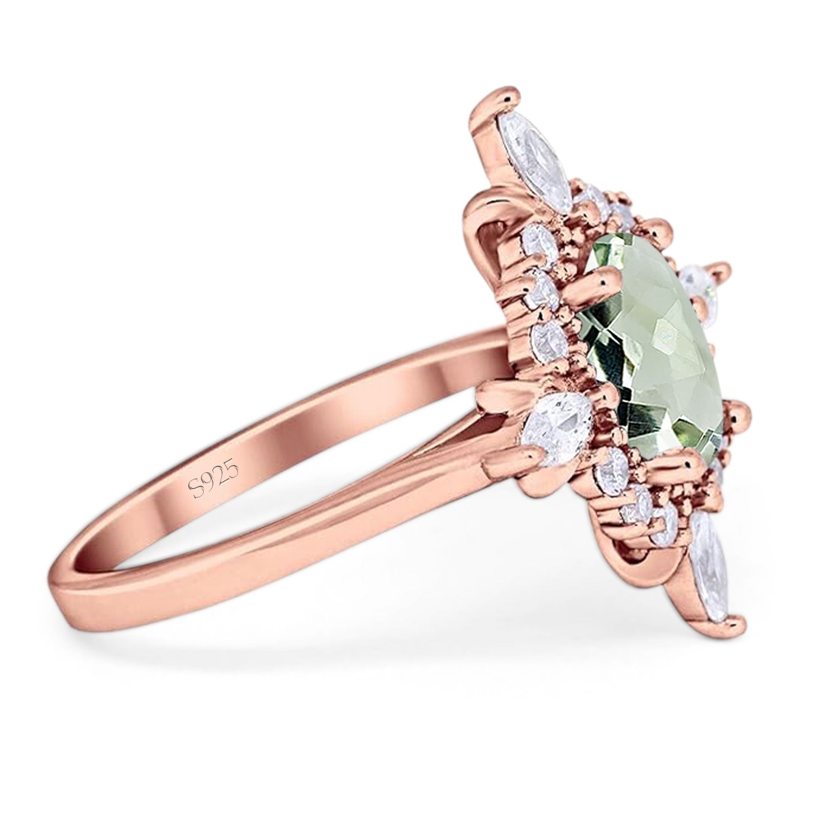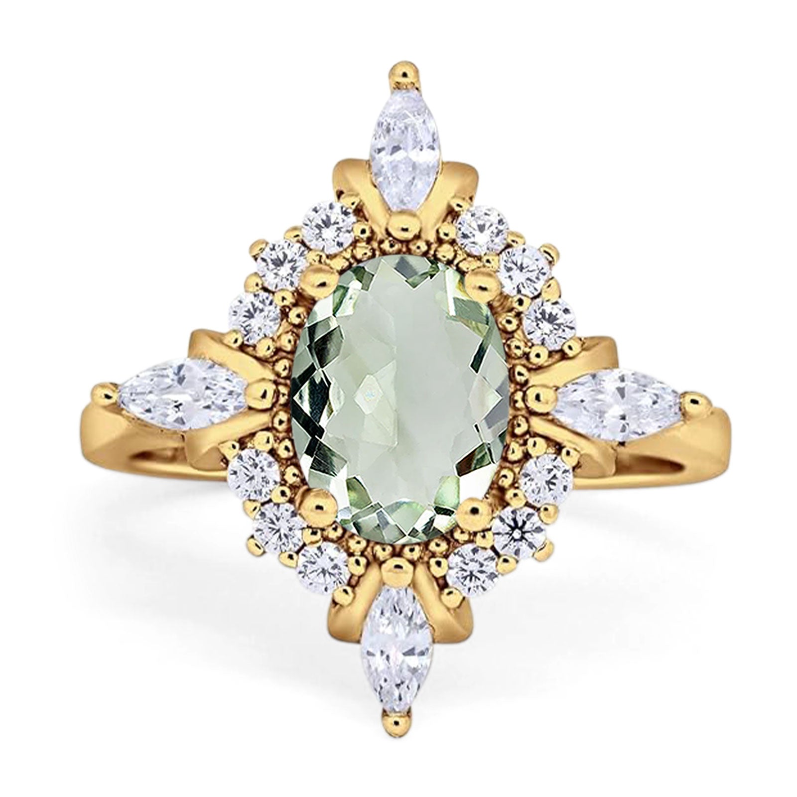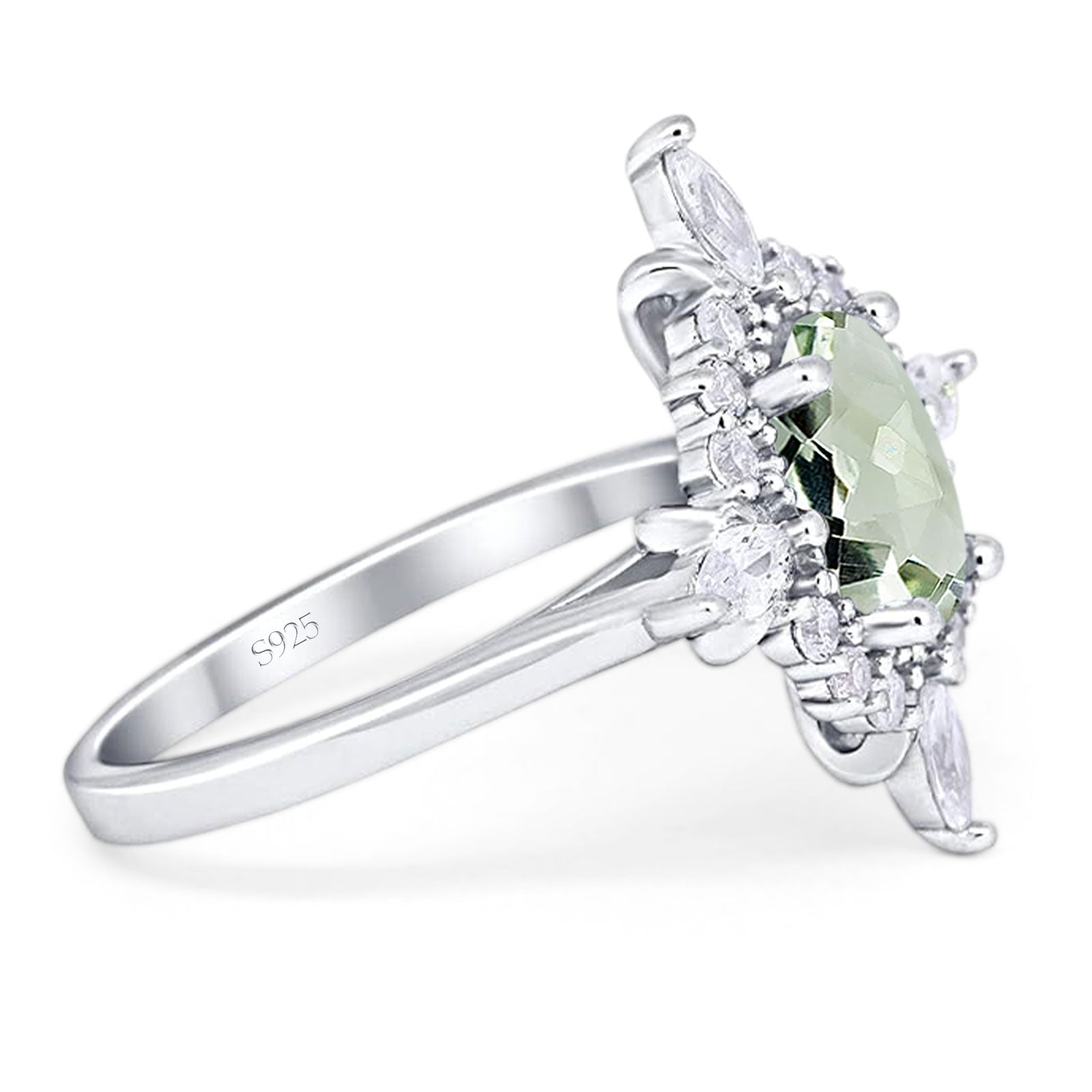 Art Deco Oval Natural Green Amethyst Prasiolite Marquise Style Beaded Ring 925 Sterling Silver