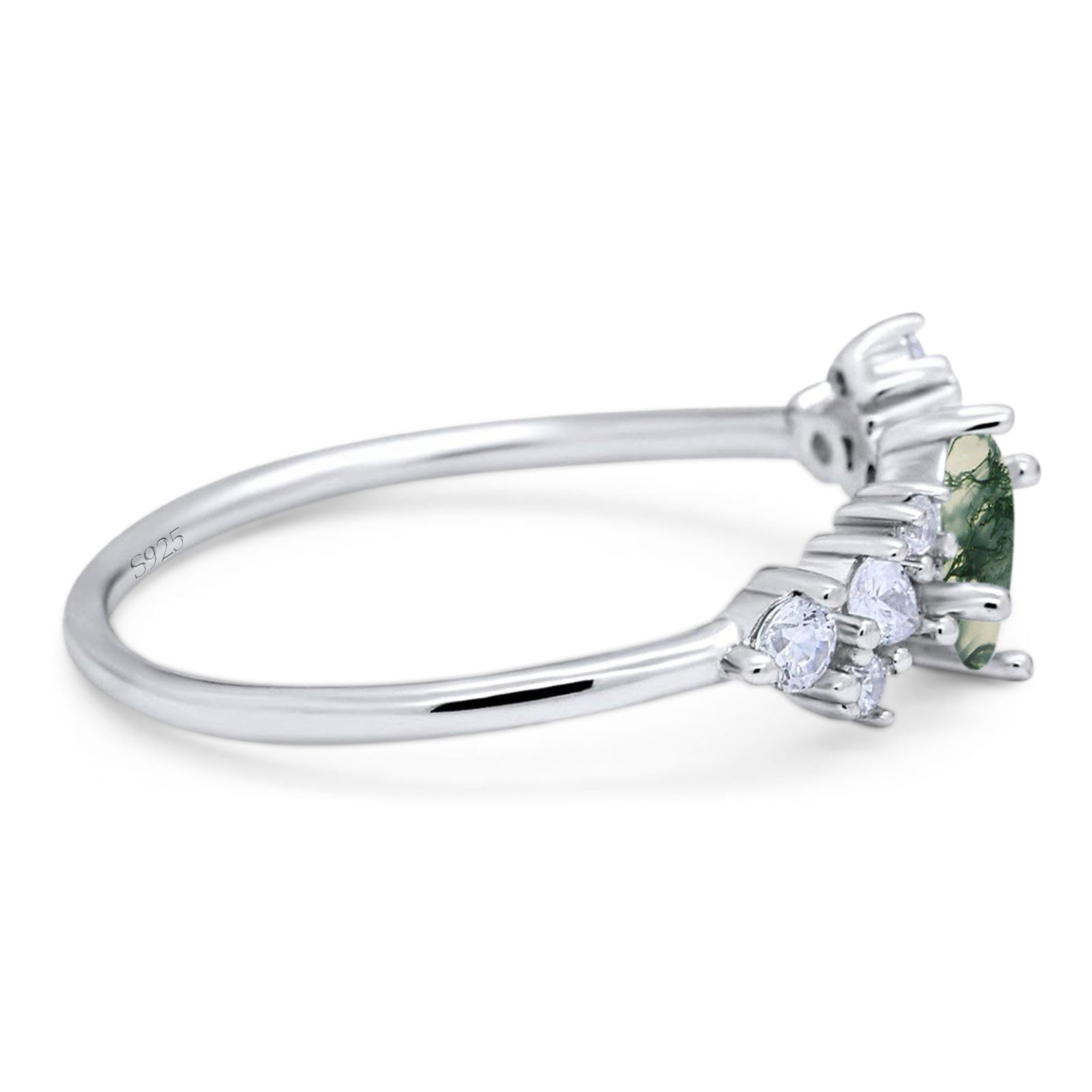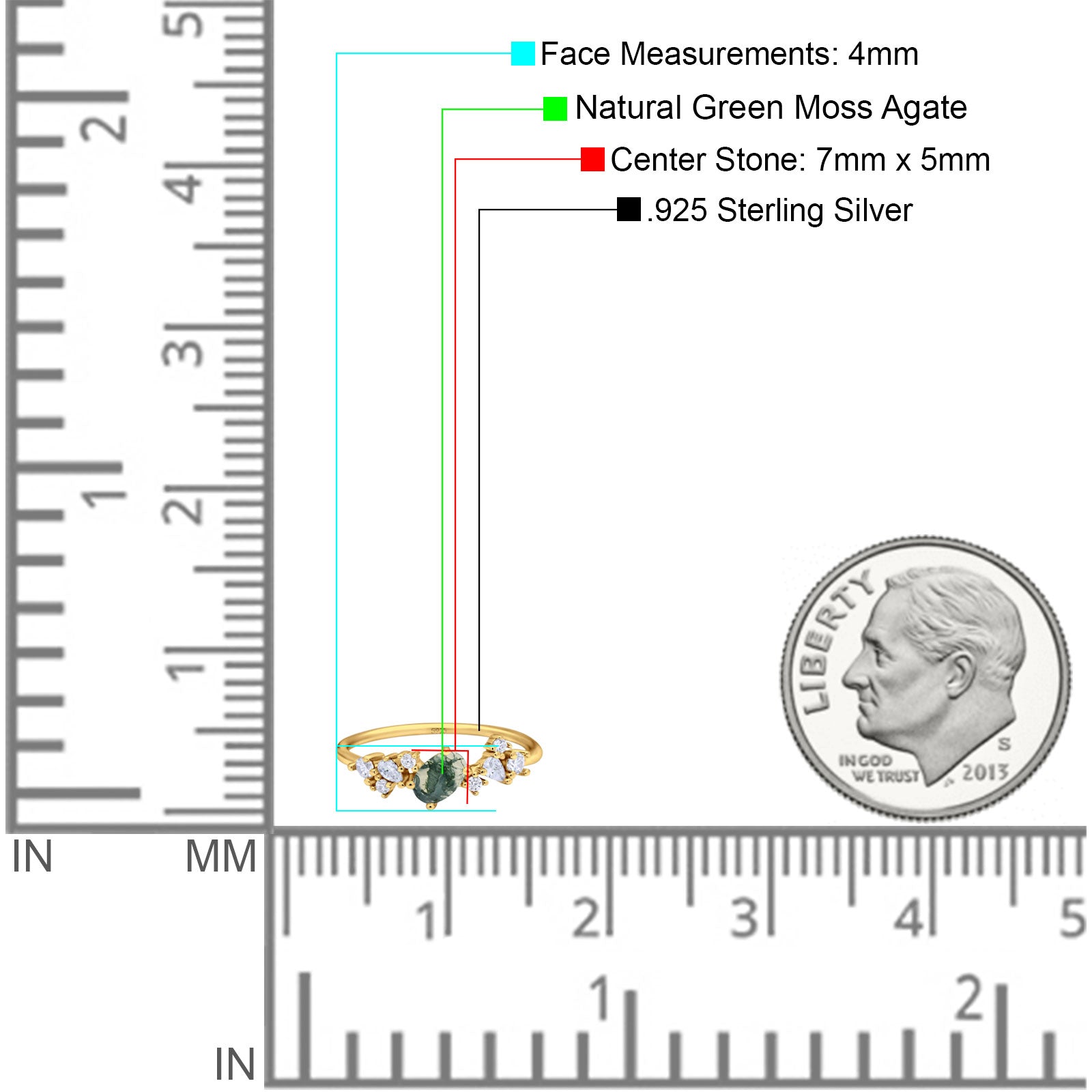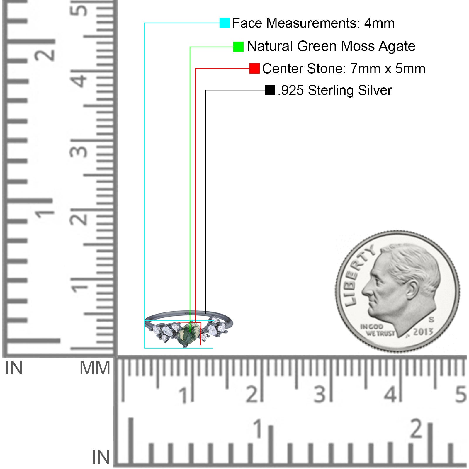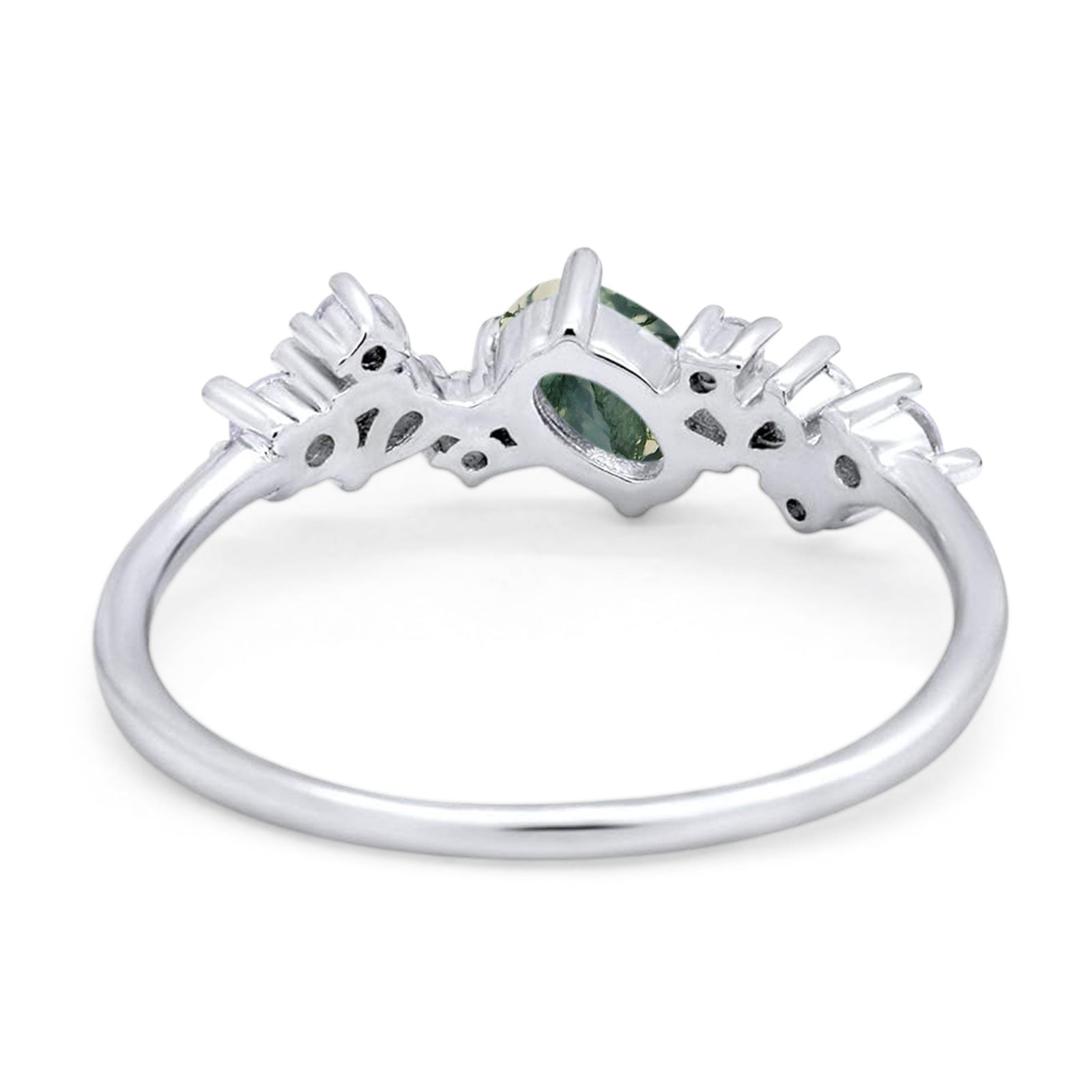Art Deco Oval Natural Green Moss Agate Cluster CZ Ring 925 Sterling Silver