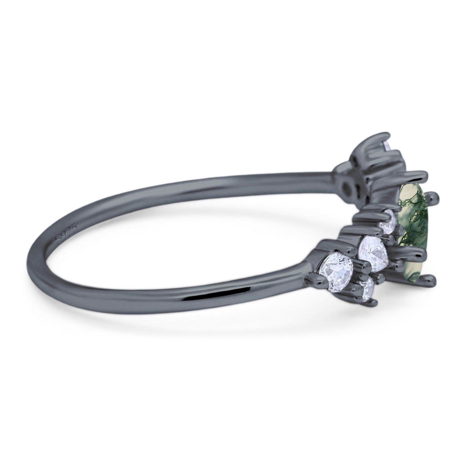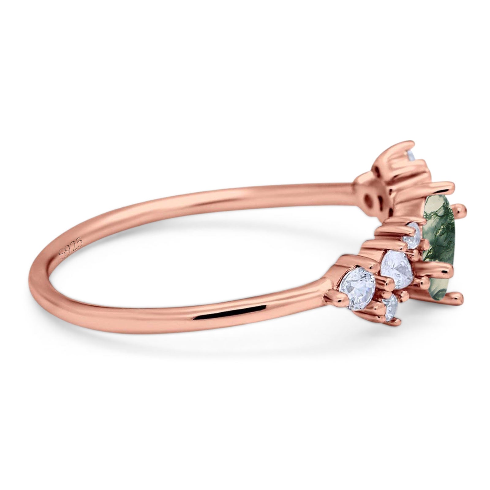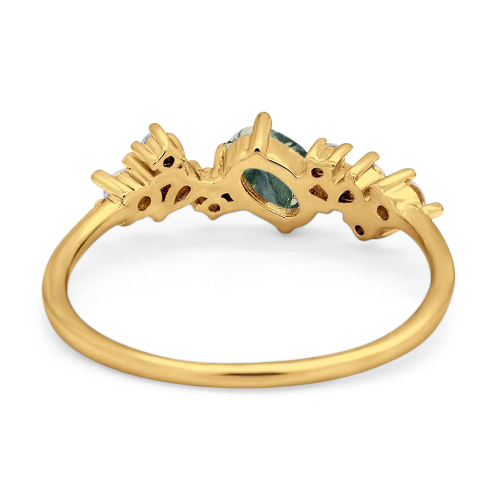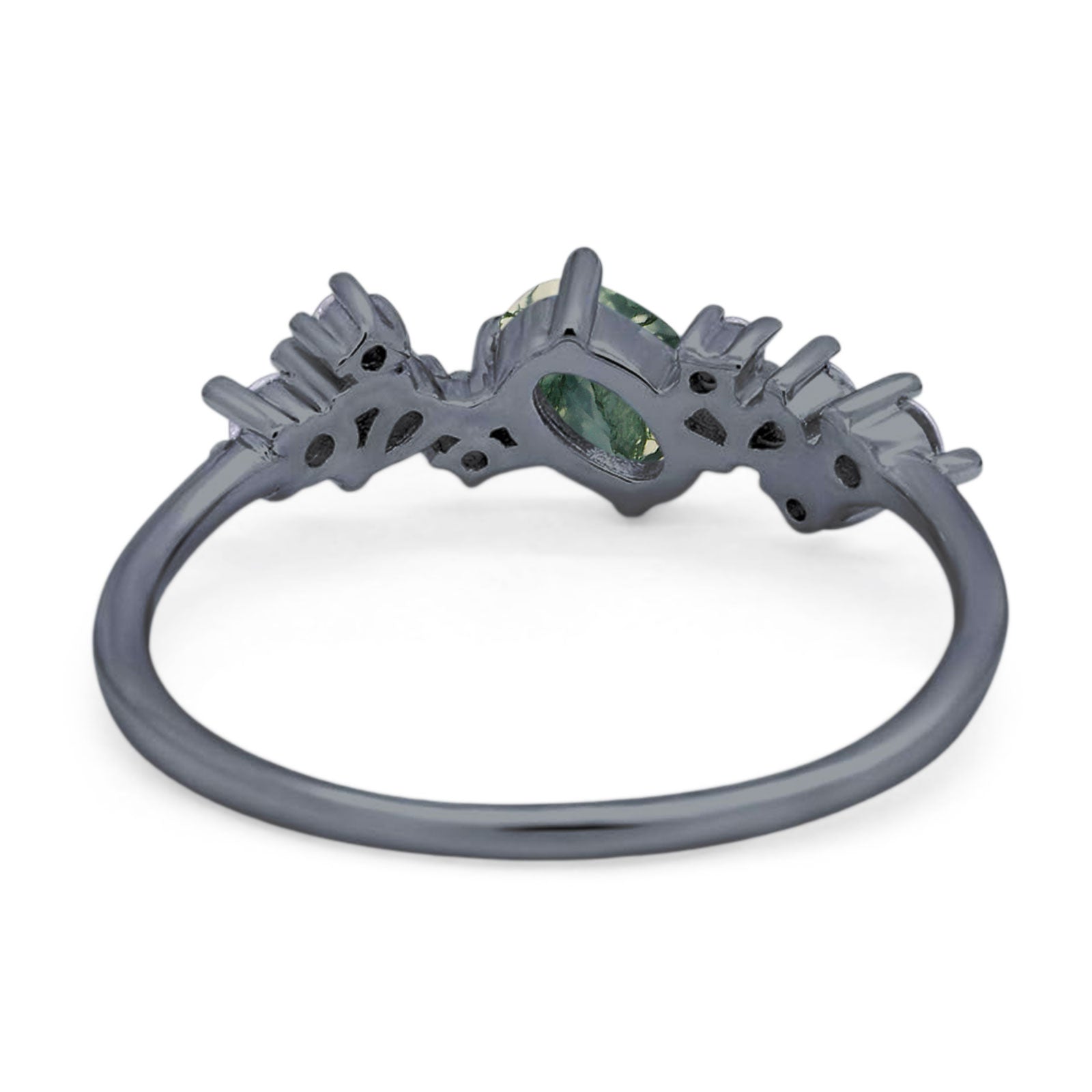 Art Deco Oval Natural Green Moss Agate Cluster CZ Ring 925 Sterling Silver