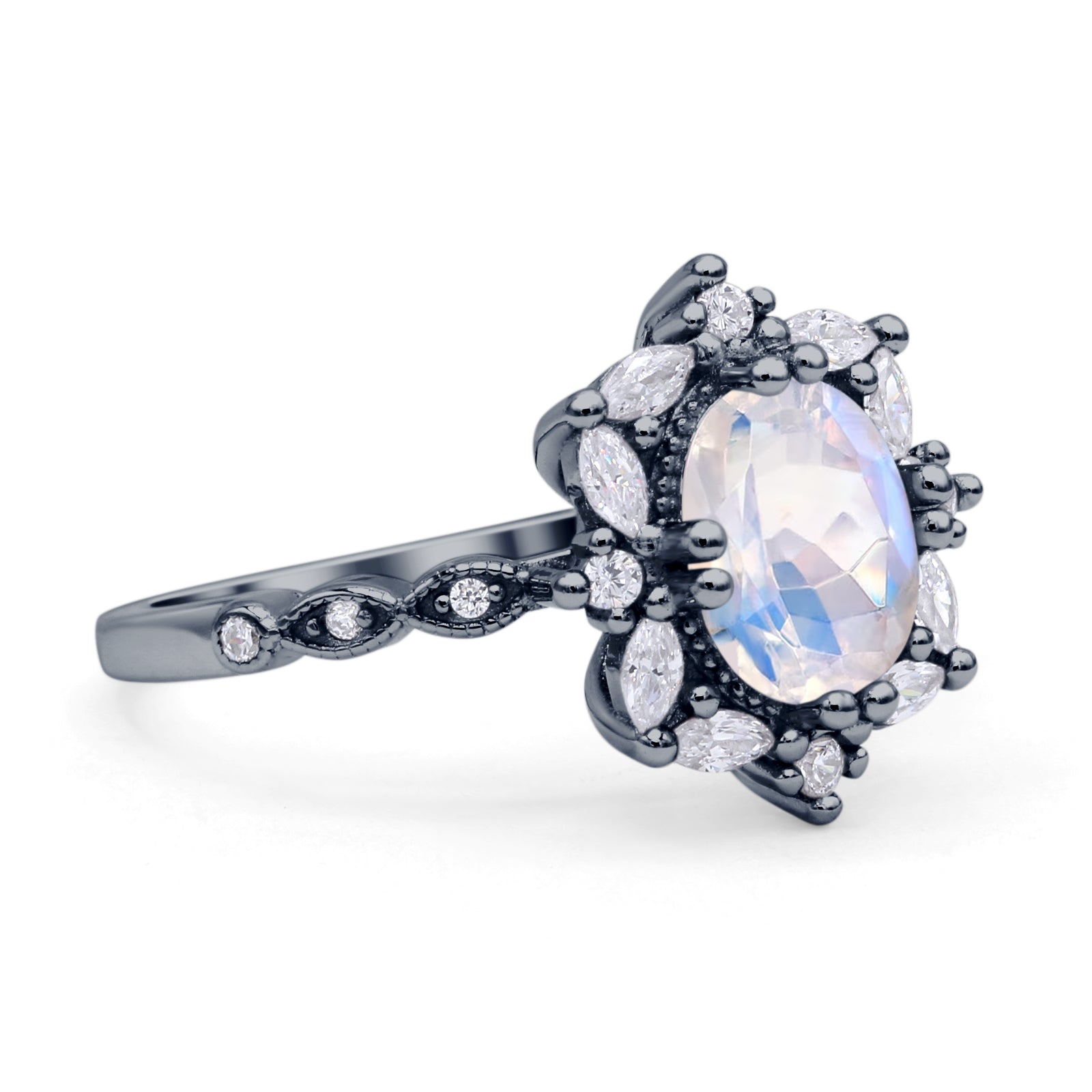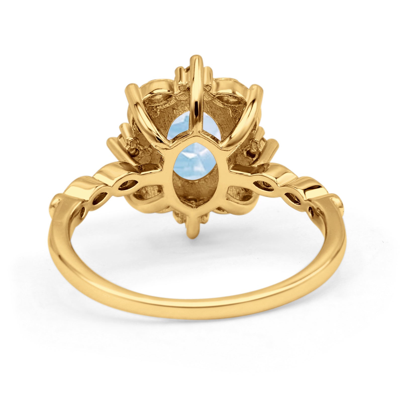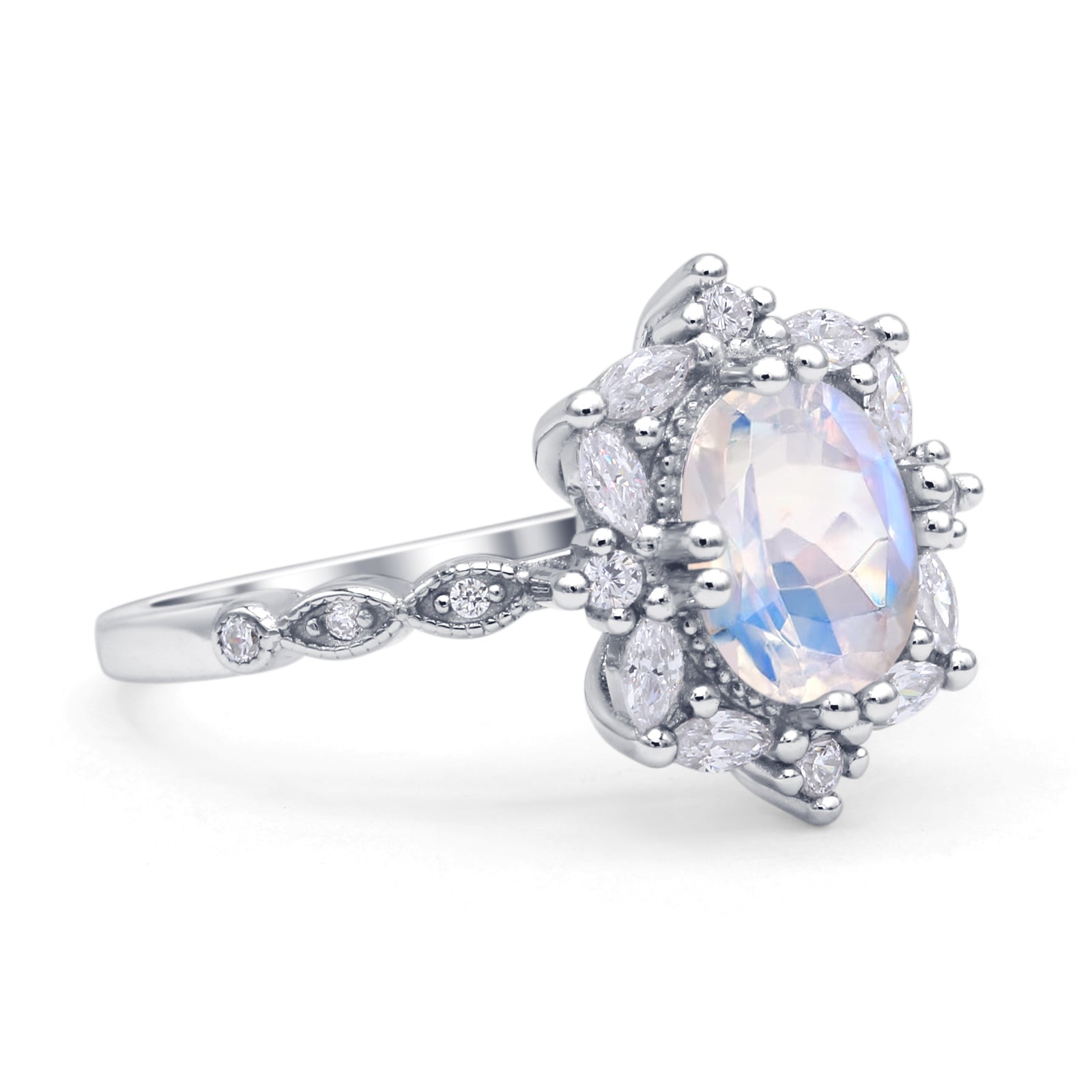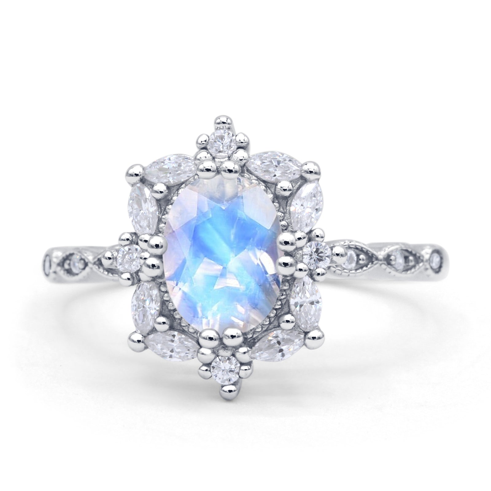 Product Description: Elevate with our art deco oval gemstone halo ballerina style engagement ring. Inspired by the glamour and sophistication of the art deco movement, this exquisite ring showcases a captivating oval gemstone at its heart, encircled by a shimmering halo of smaller gemstone. The addition of small side stones, which are cubic zirconia accentuates its allure even further, enhancing its overall splendor.