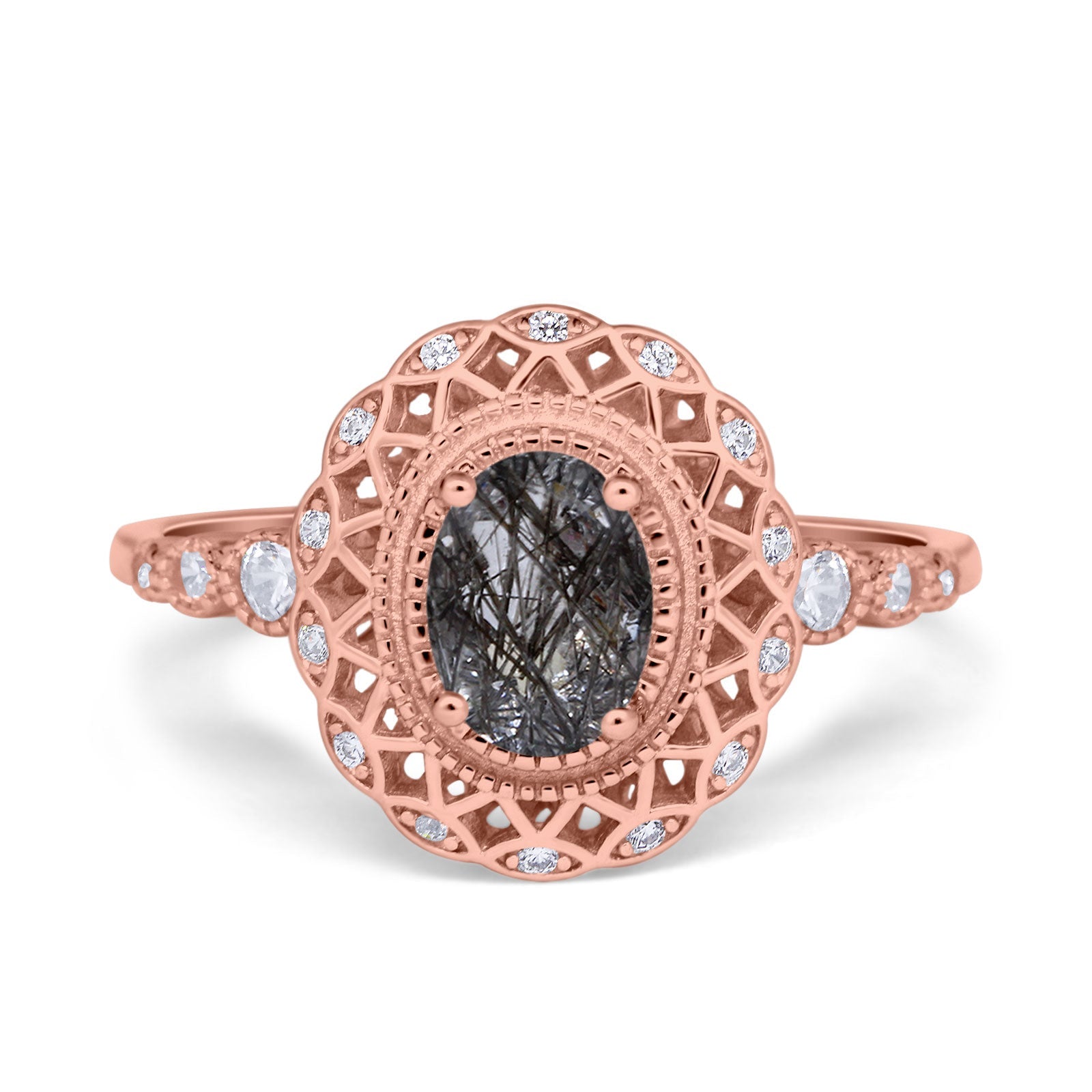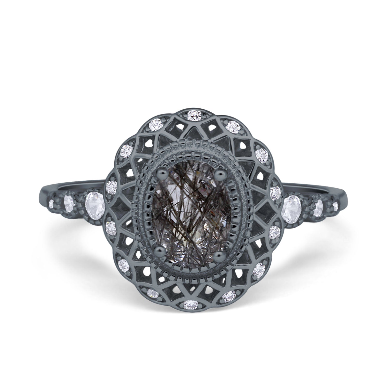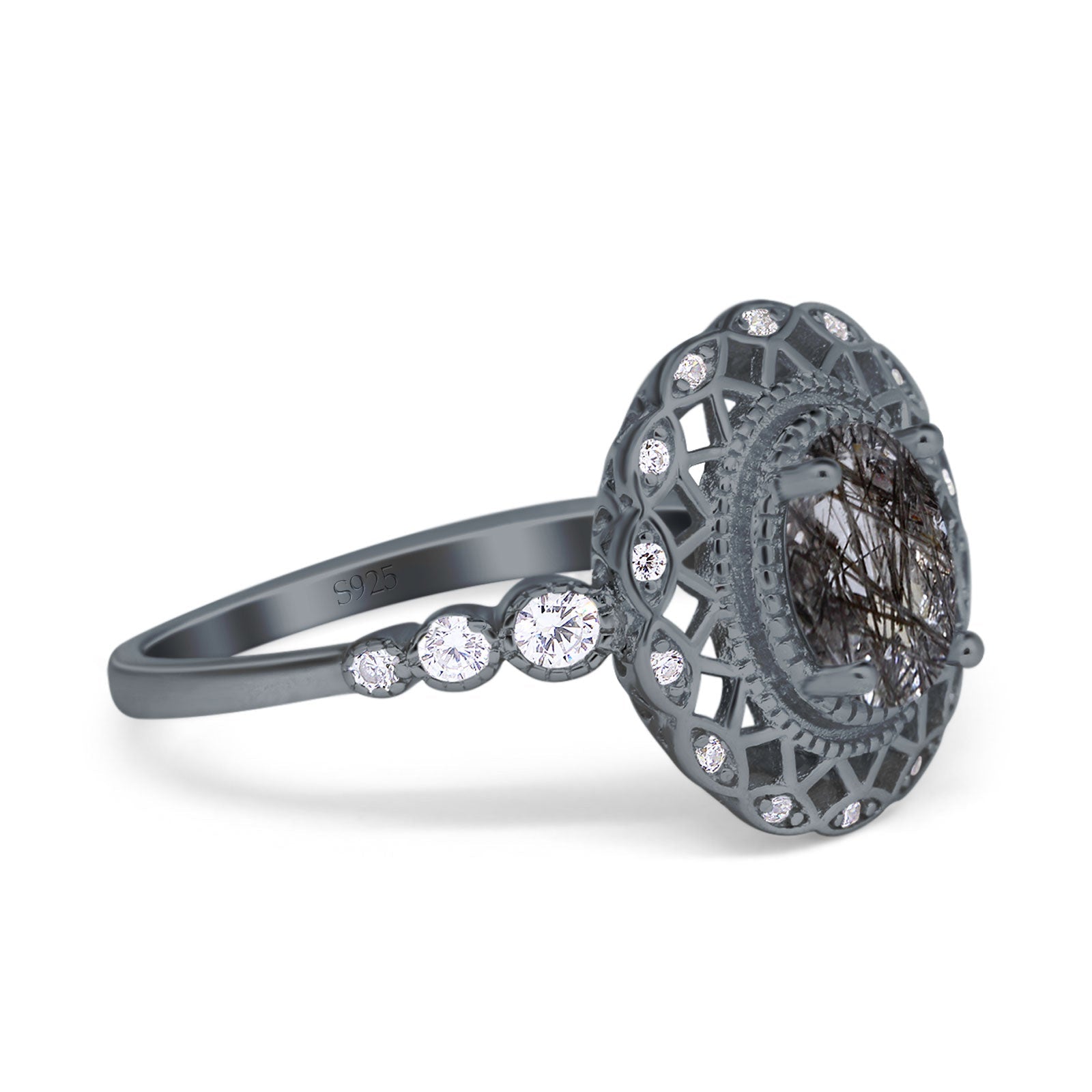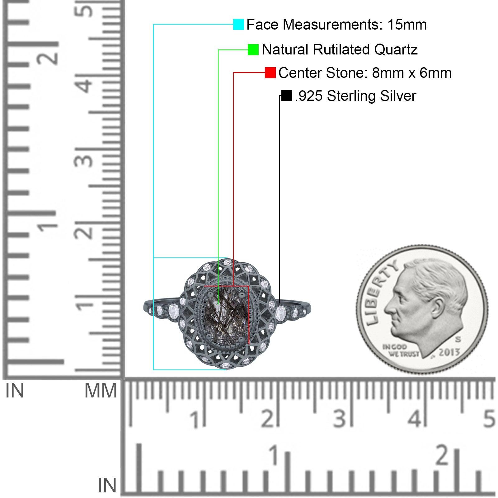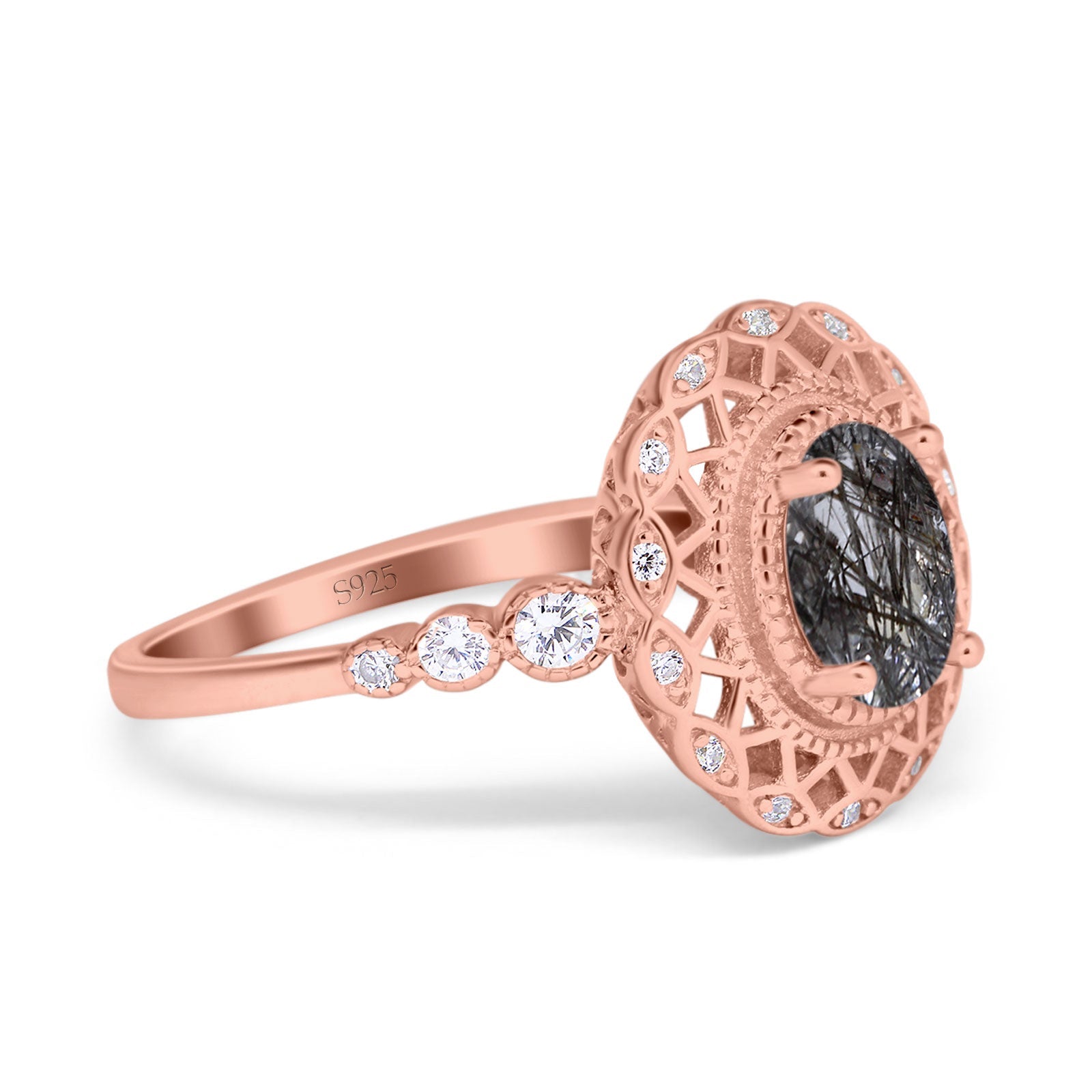 Art Deco Oval Natural Rutilated Quartz Cocktail Ring 925 Sterling Silver