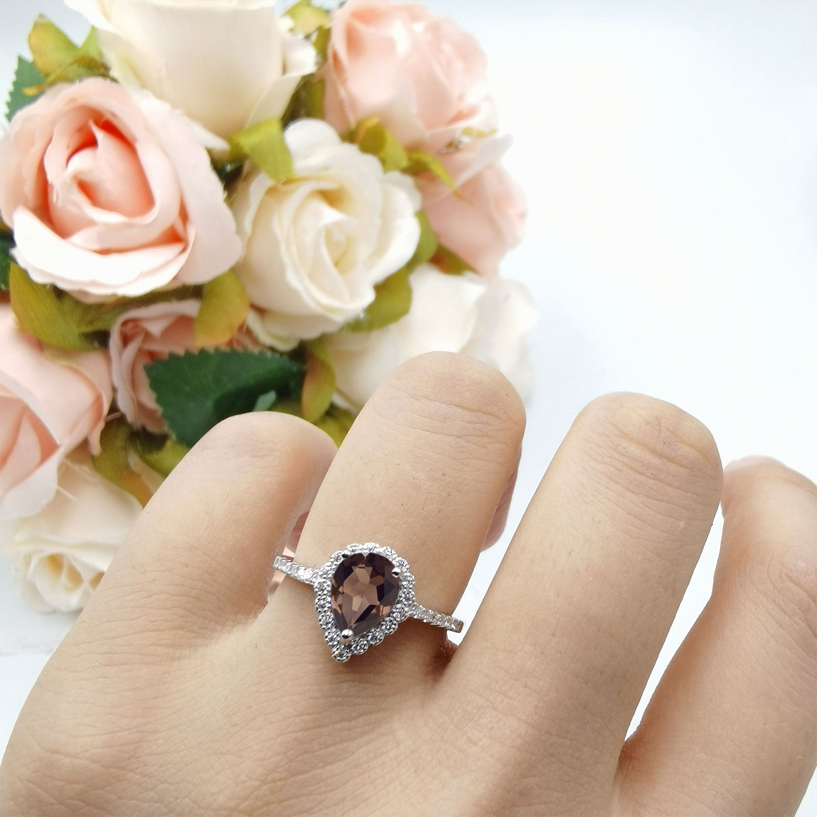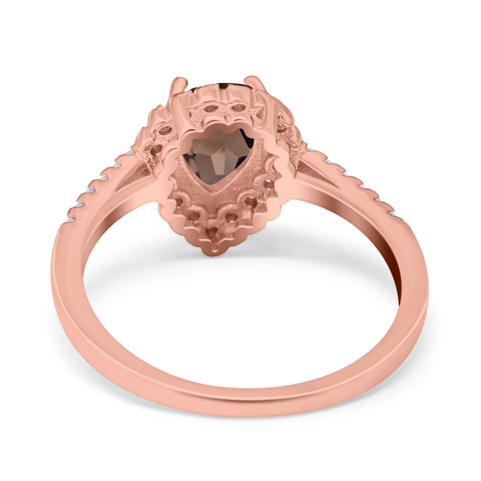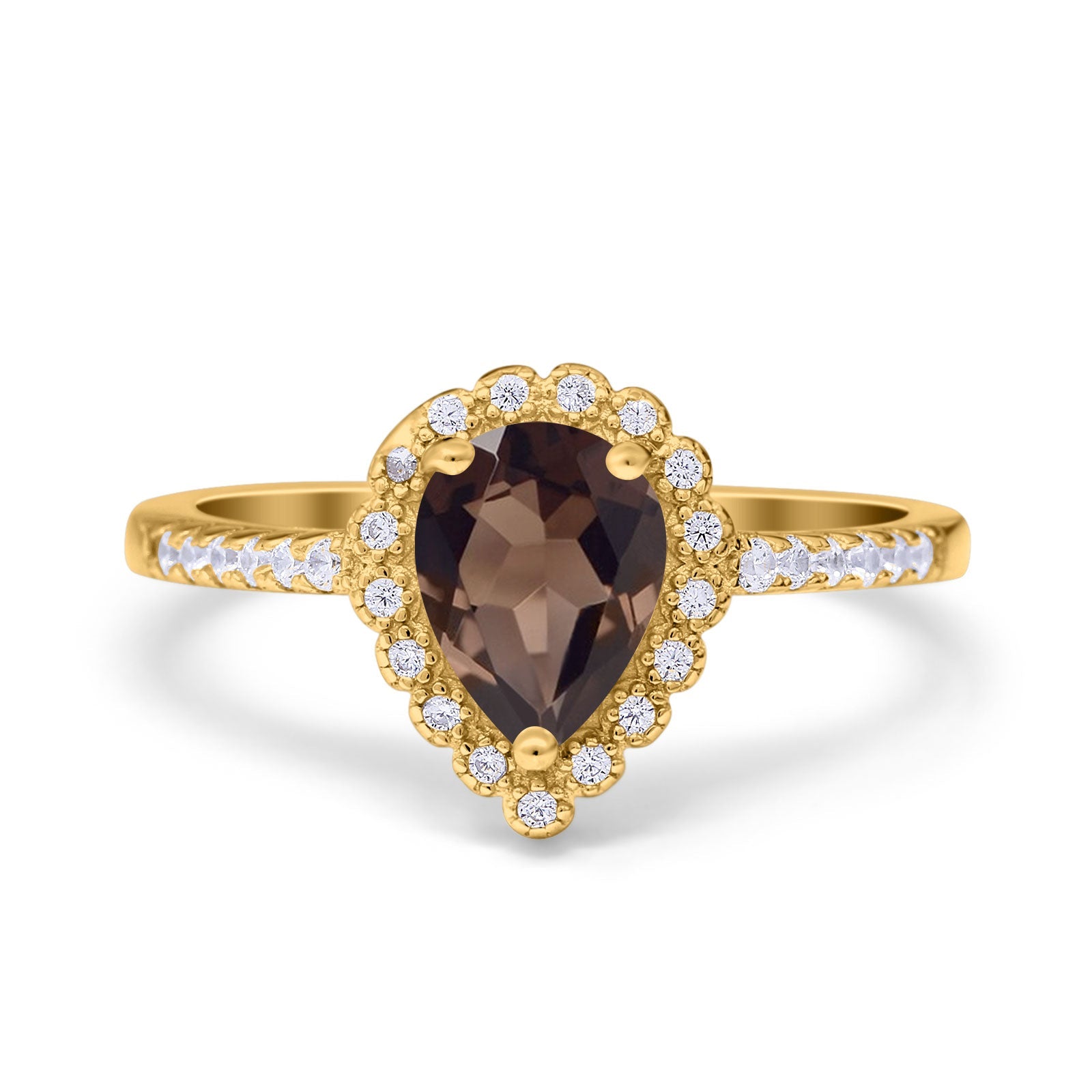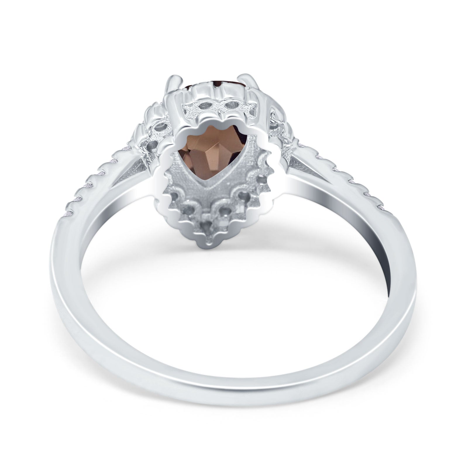 Art Deco Pear Natural Chocolate Smoky Quartz Halo Engagement Ring 925 Sterling Silver