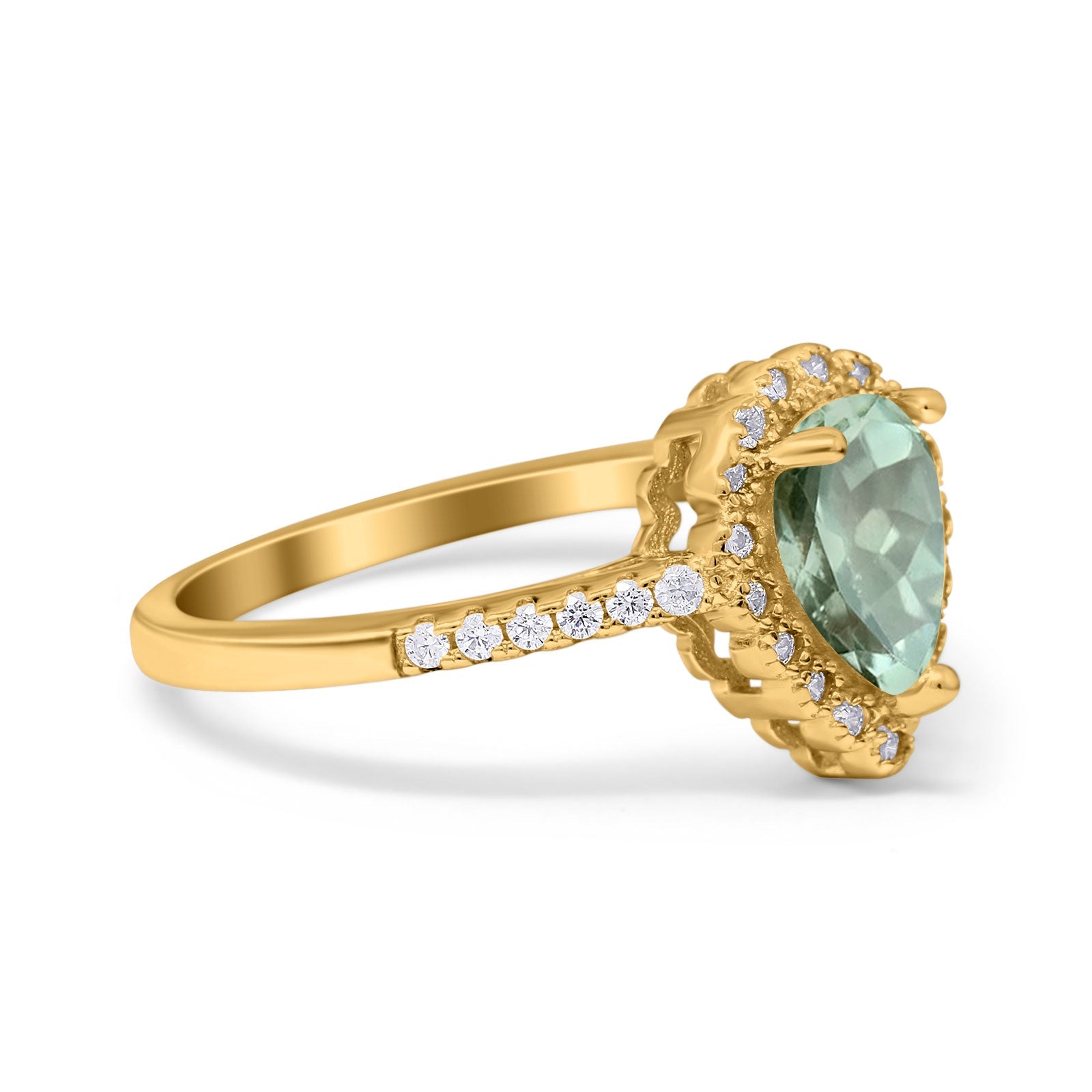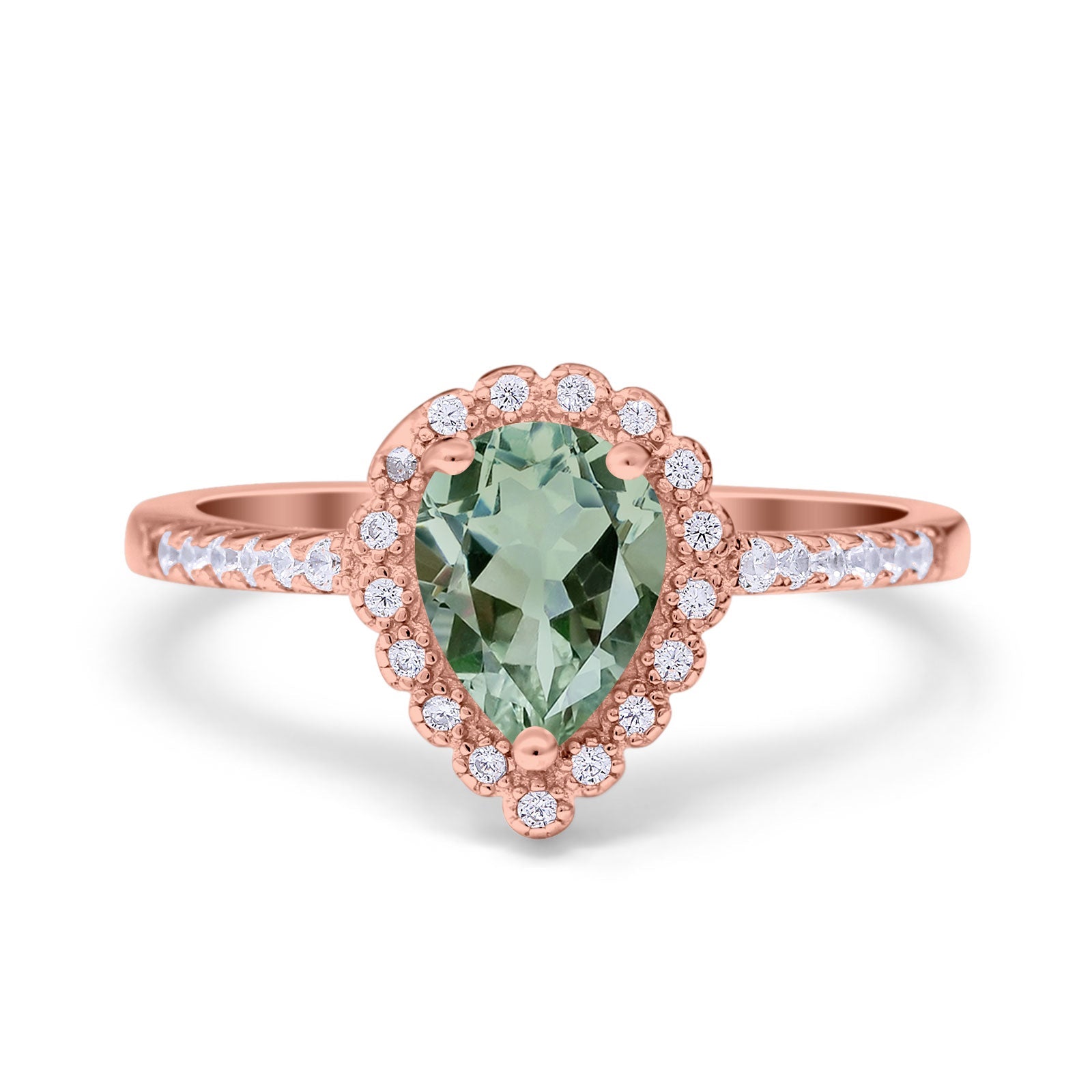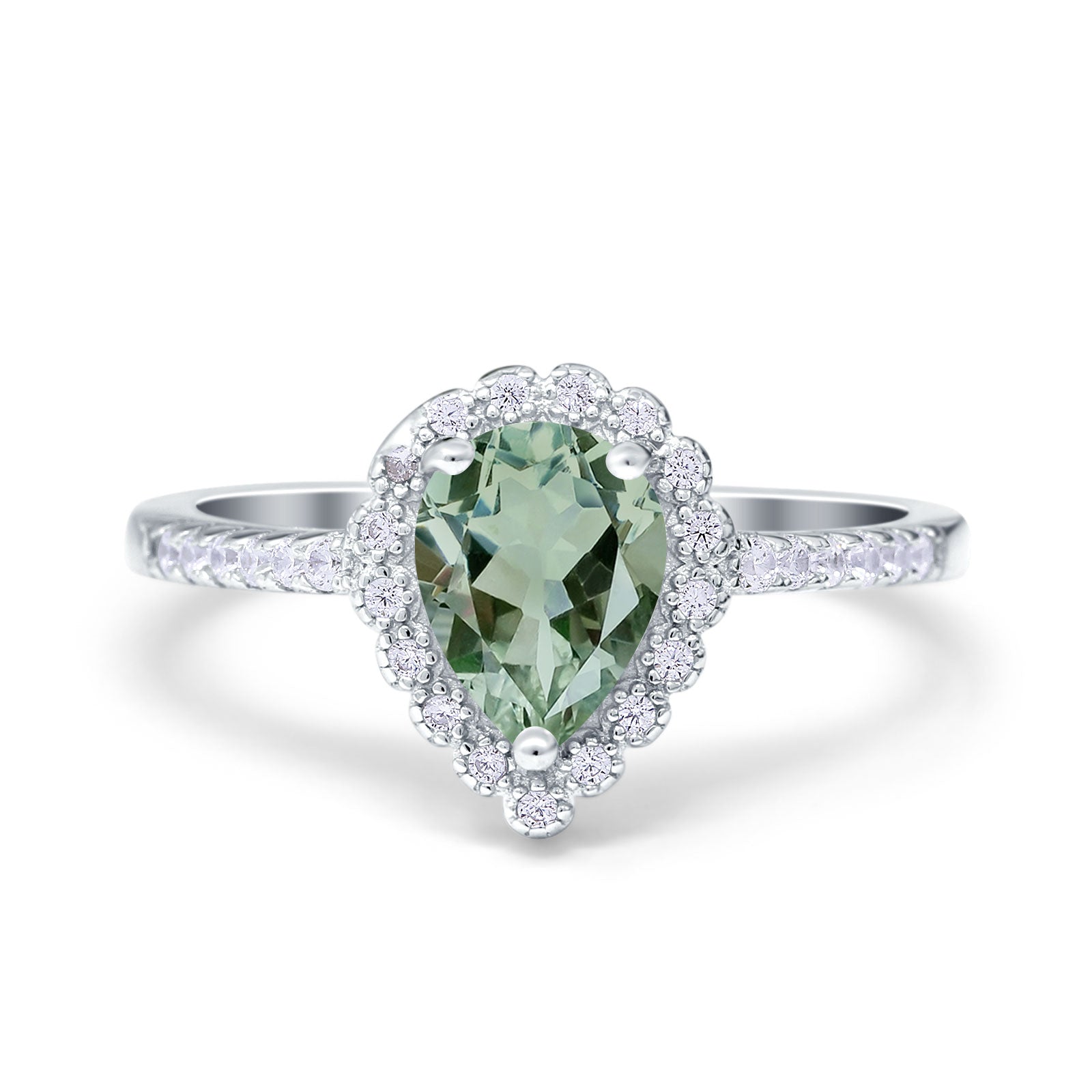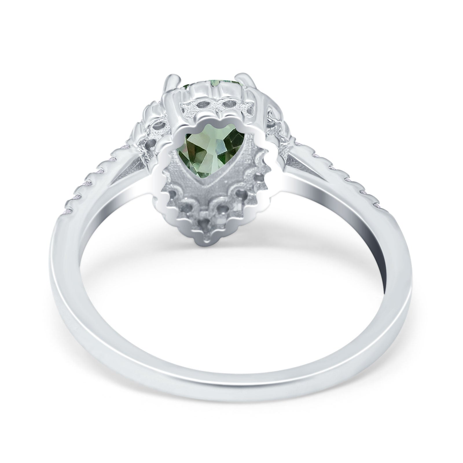 Art Deco Pear Natural Green Amethyst Prasiolite Halo Engagement Ring 925 Sterling Silver