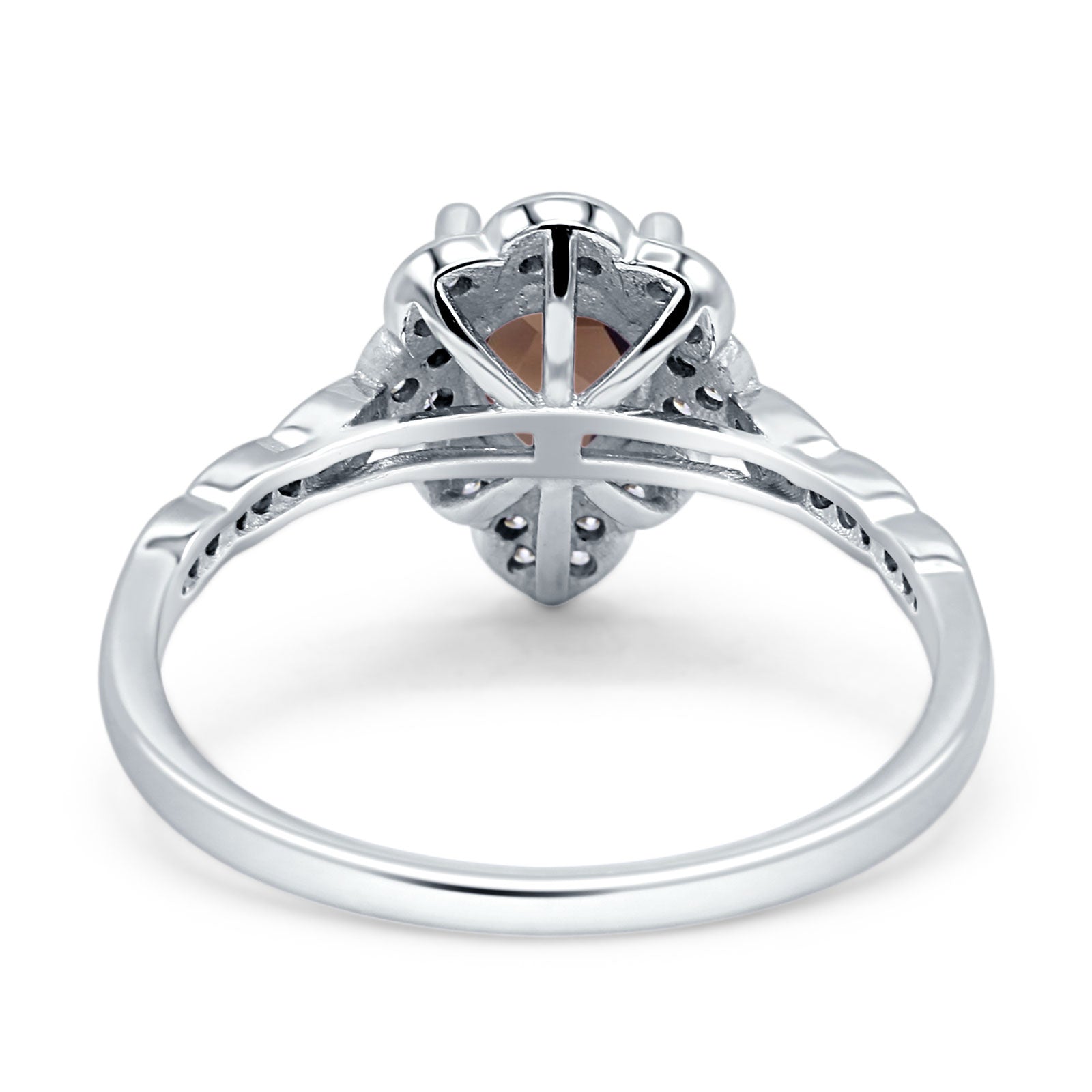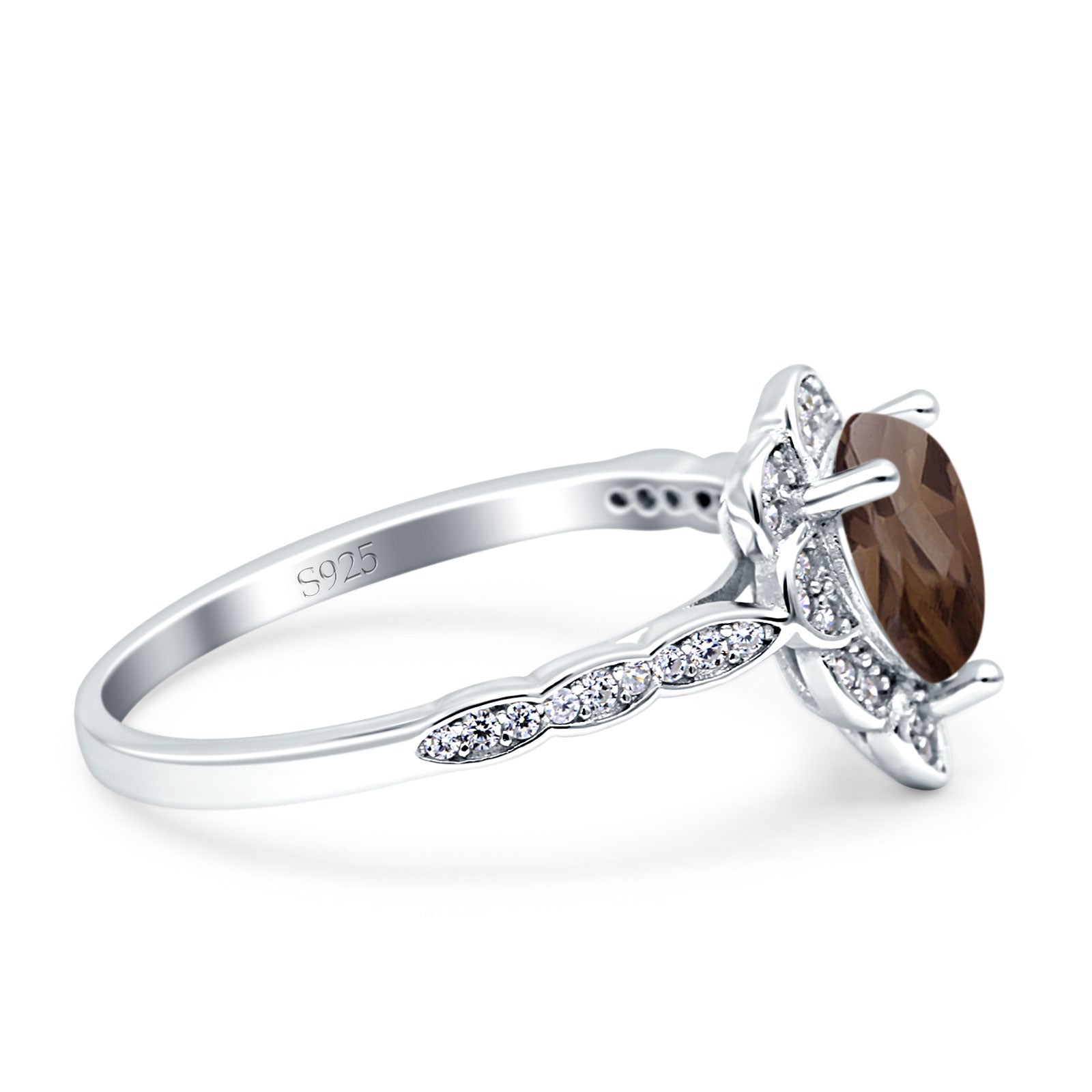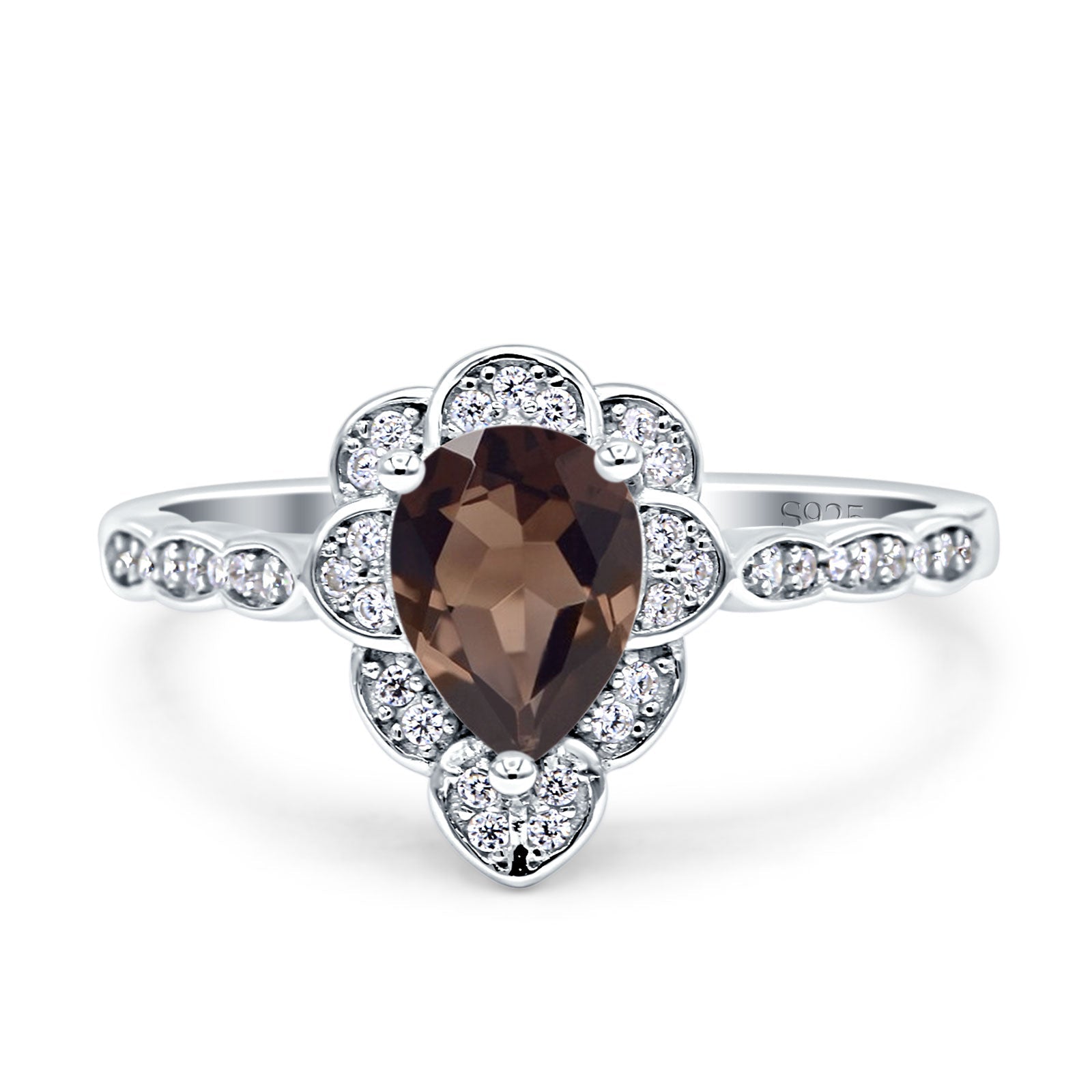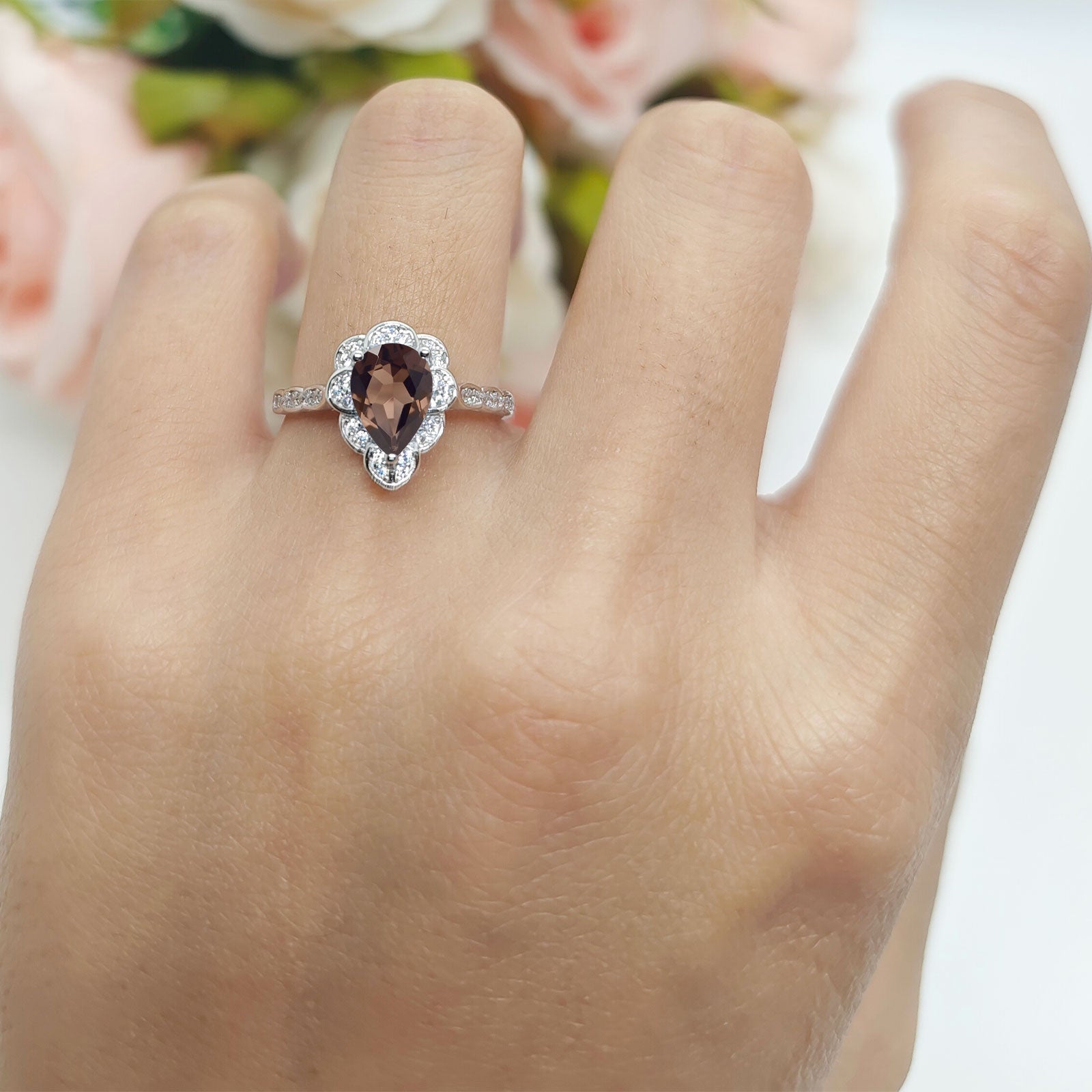 Art Deco Pear Teardrop Natural Chocolate Smoky Quartz Halo Ring 925 Sterling Silver