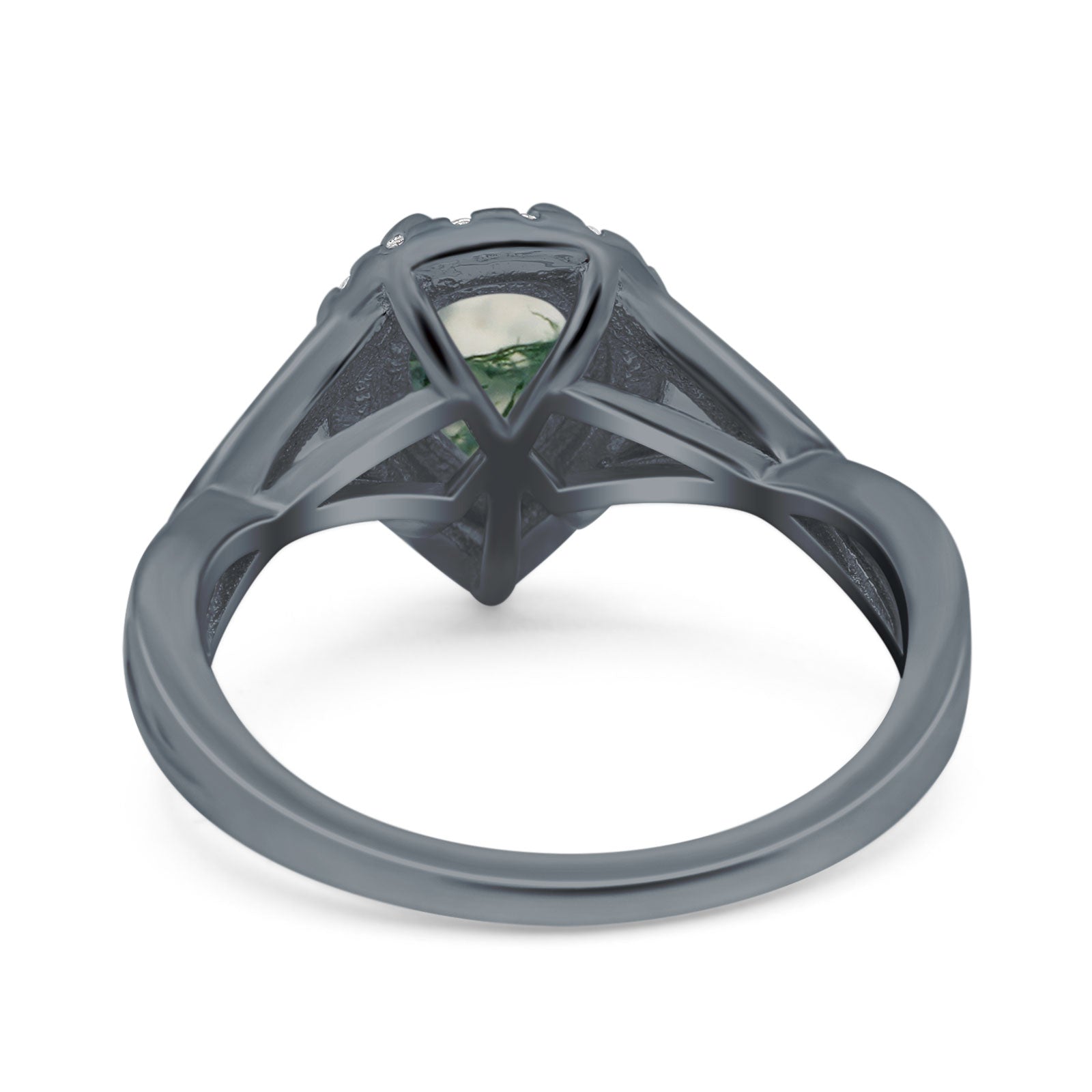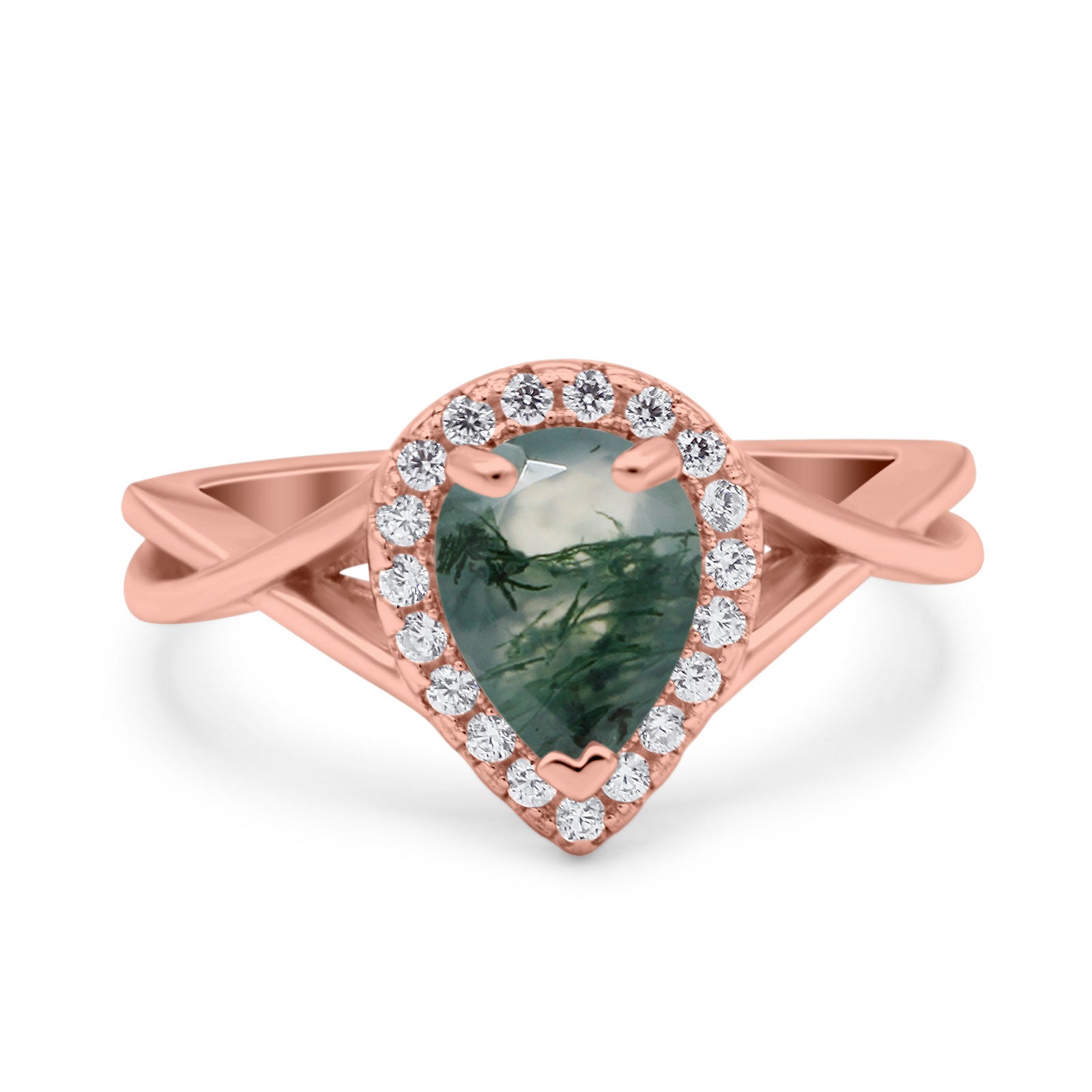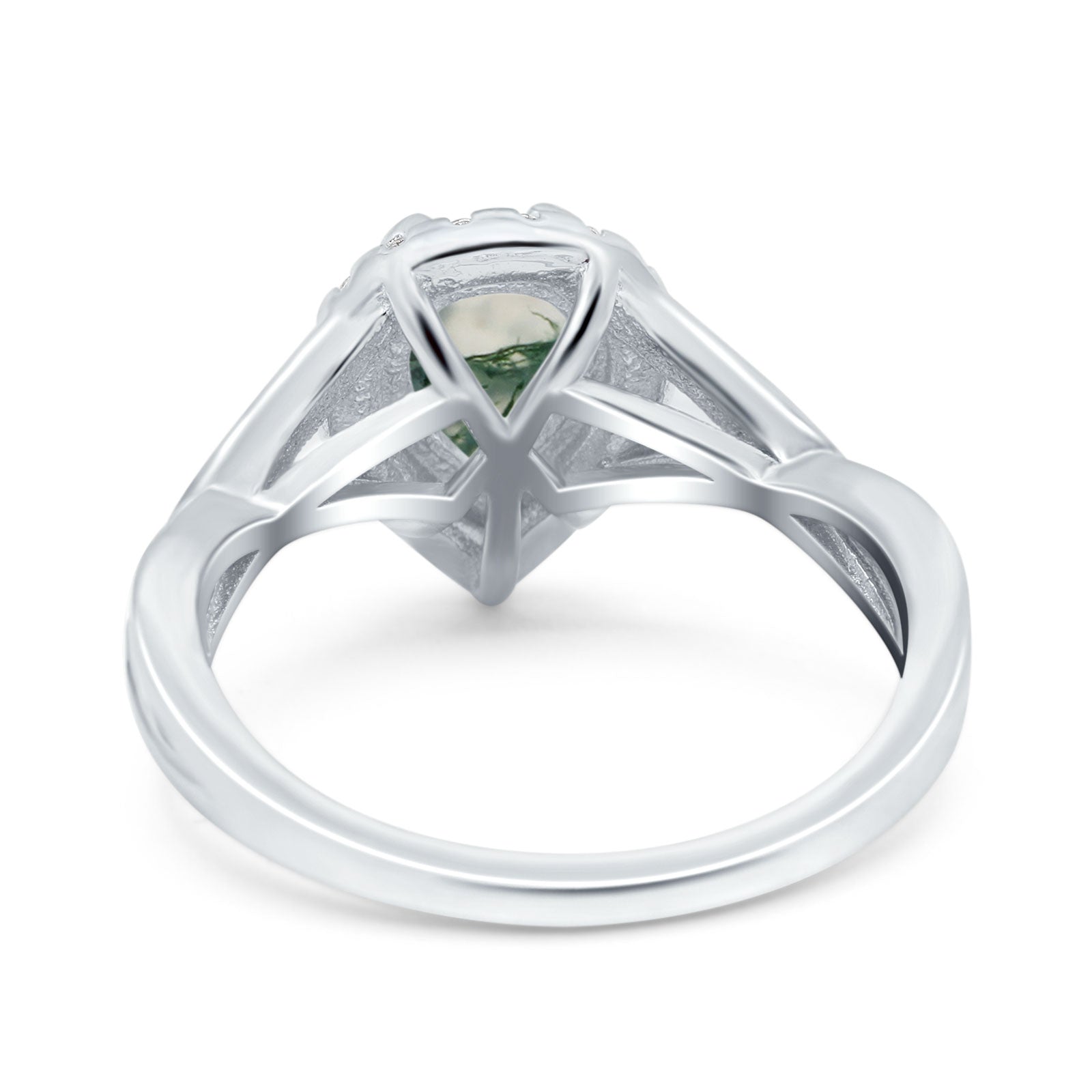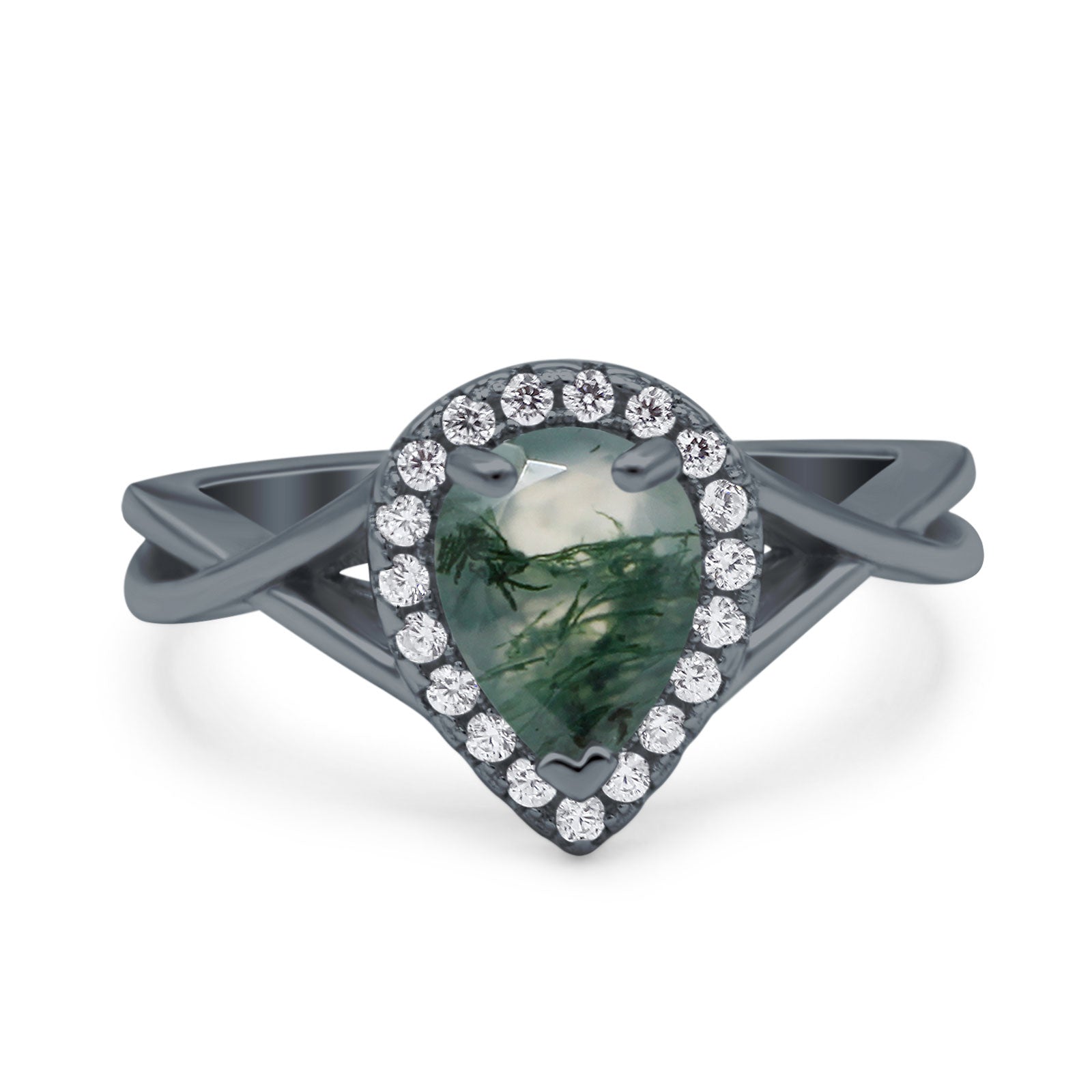 Art Deco Pear Teardrop Natural Green Moss Agate Halo Twisted Ring 925 Sterling Silver