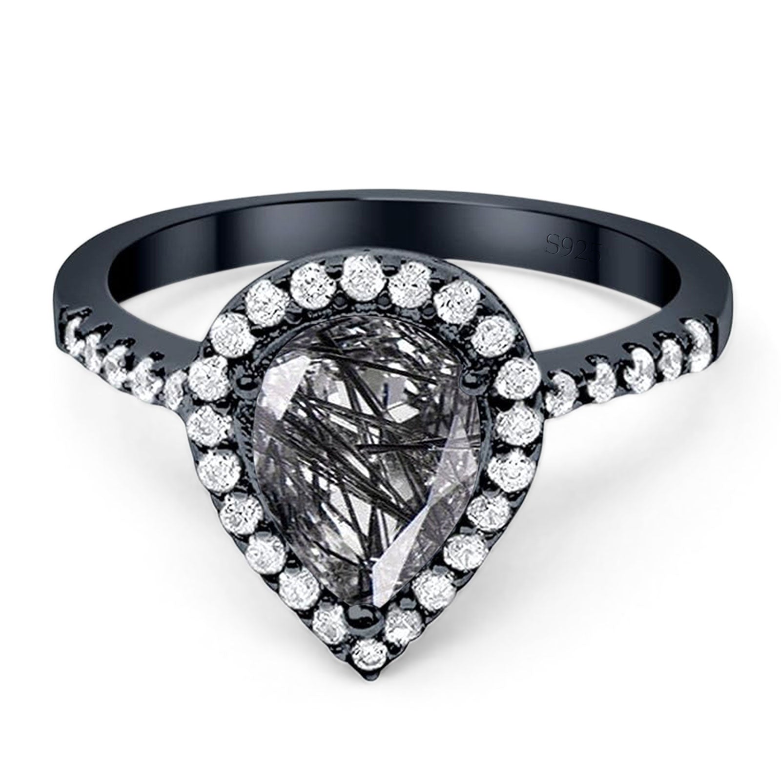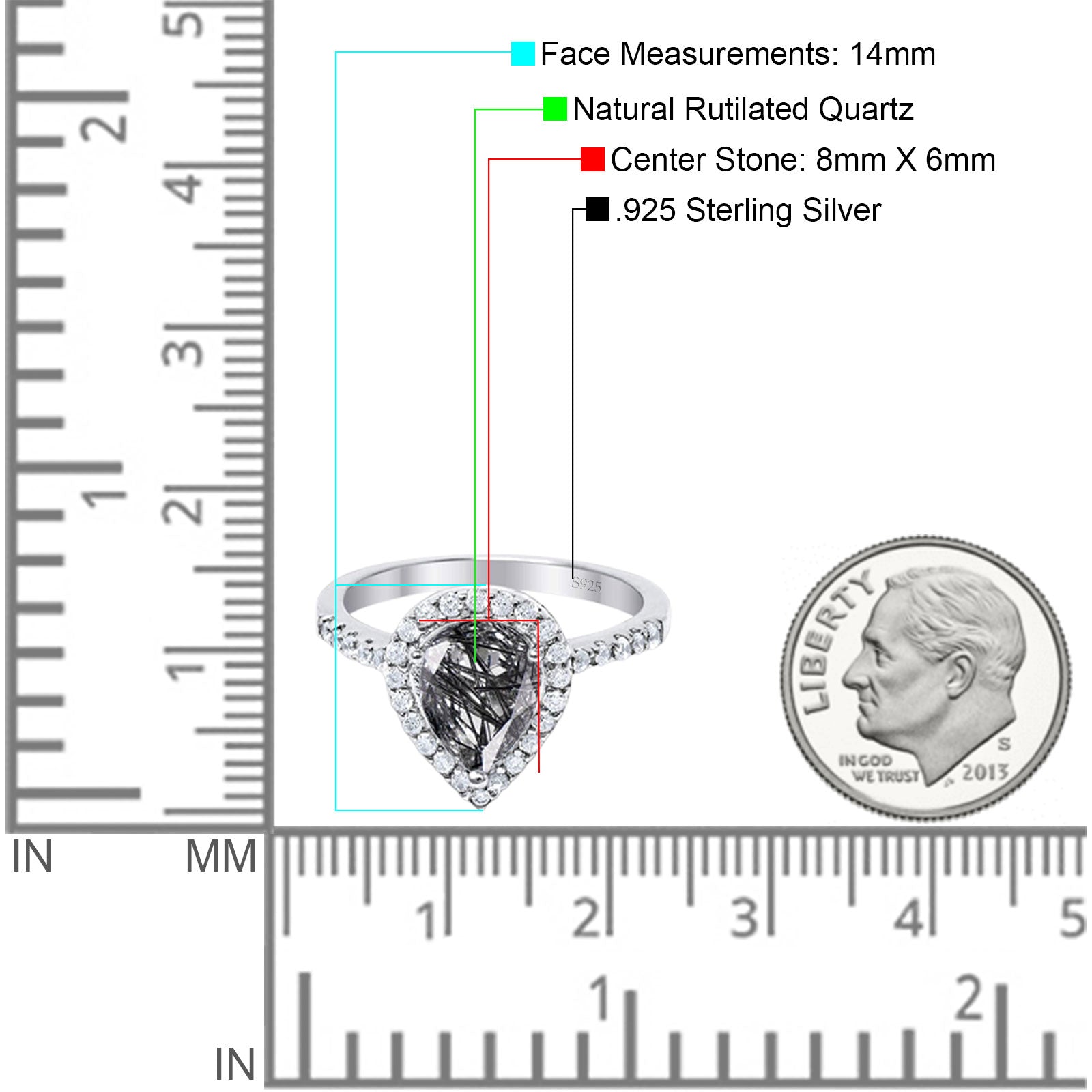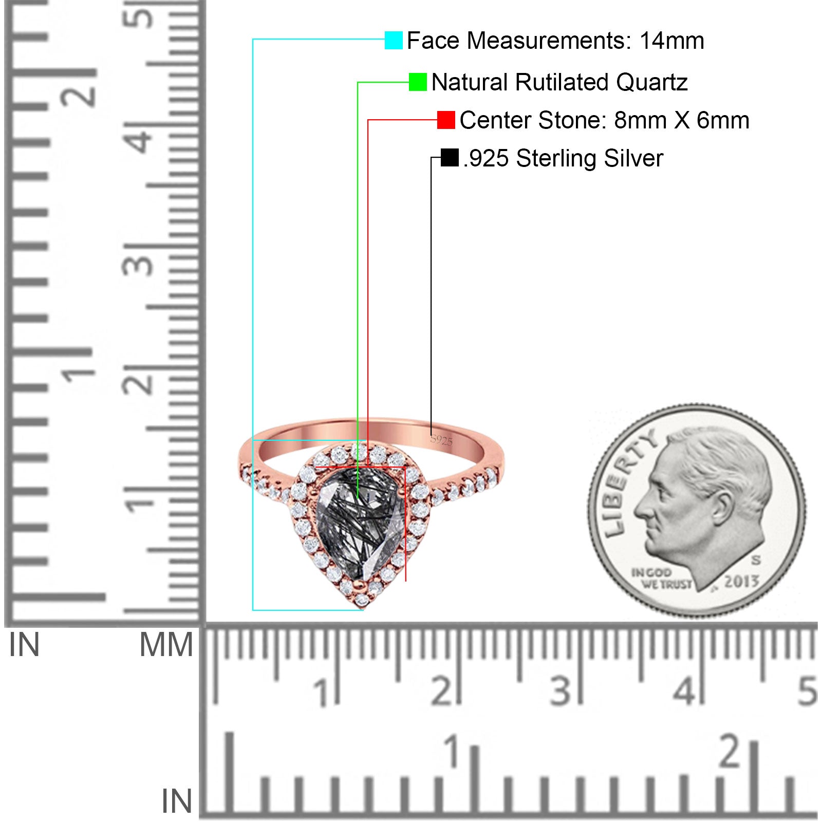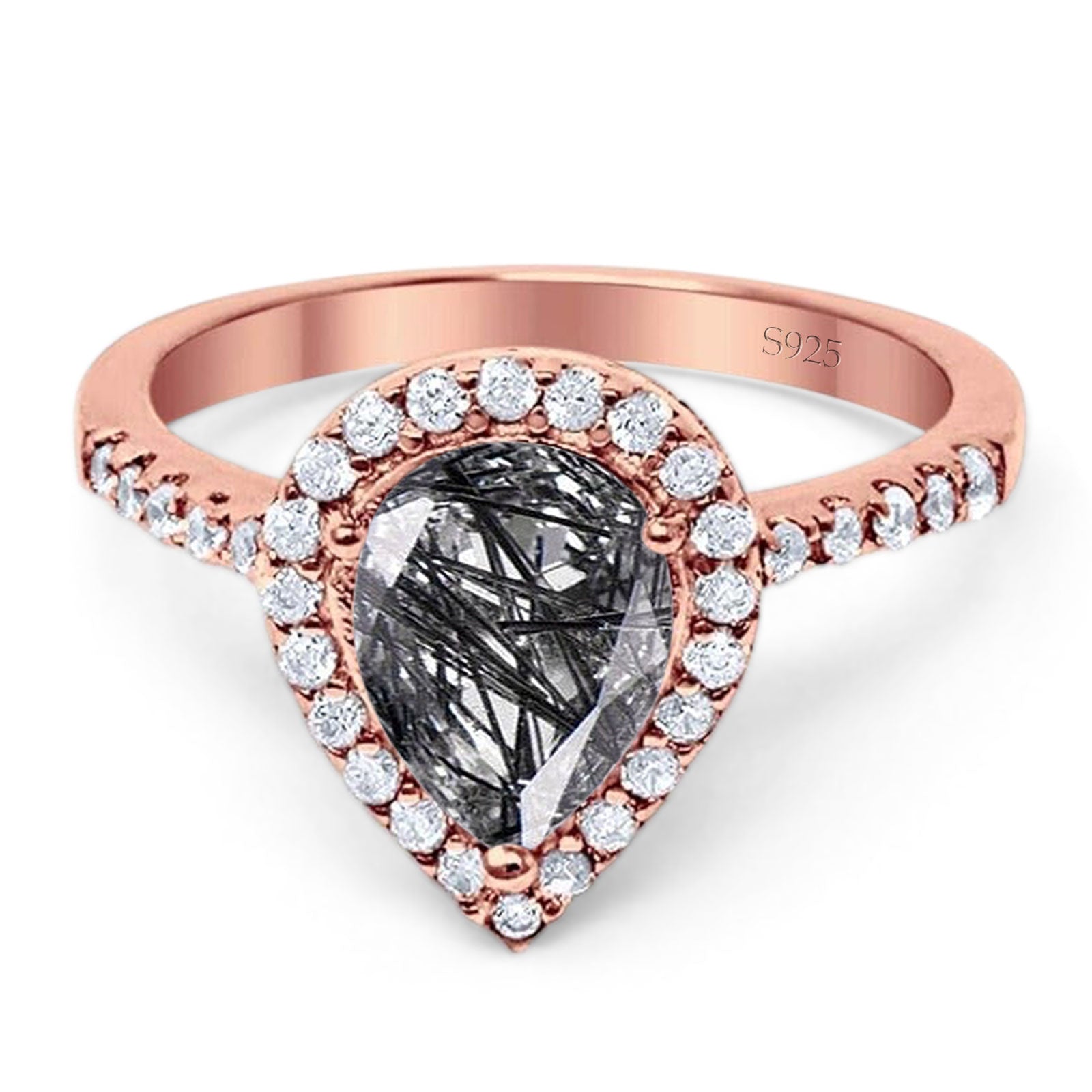 Art Deco Pear Teardrop Natural Rutilated Quartz Halo Wedding Ring 925 Sterling Silver