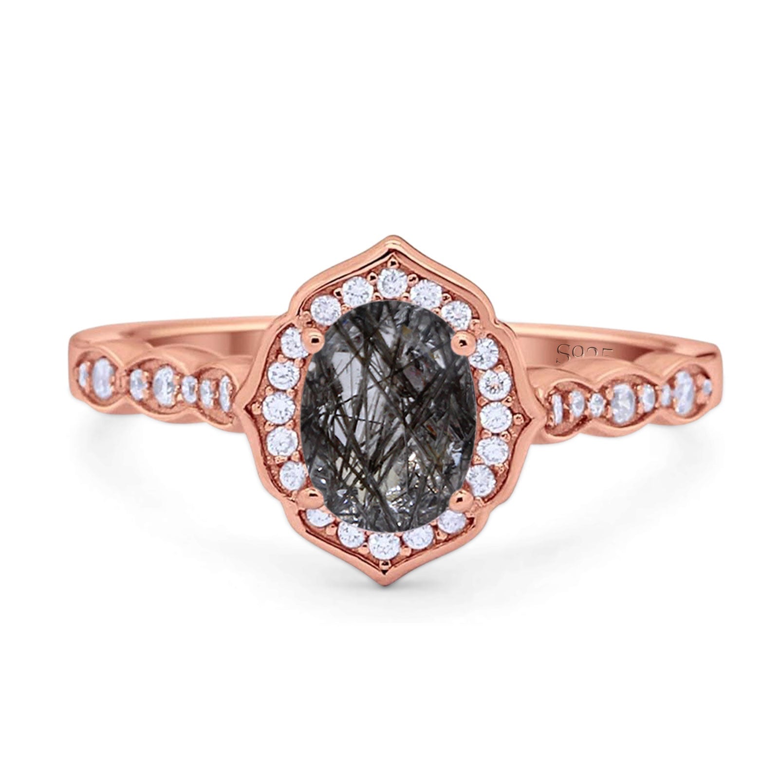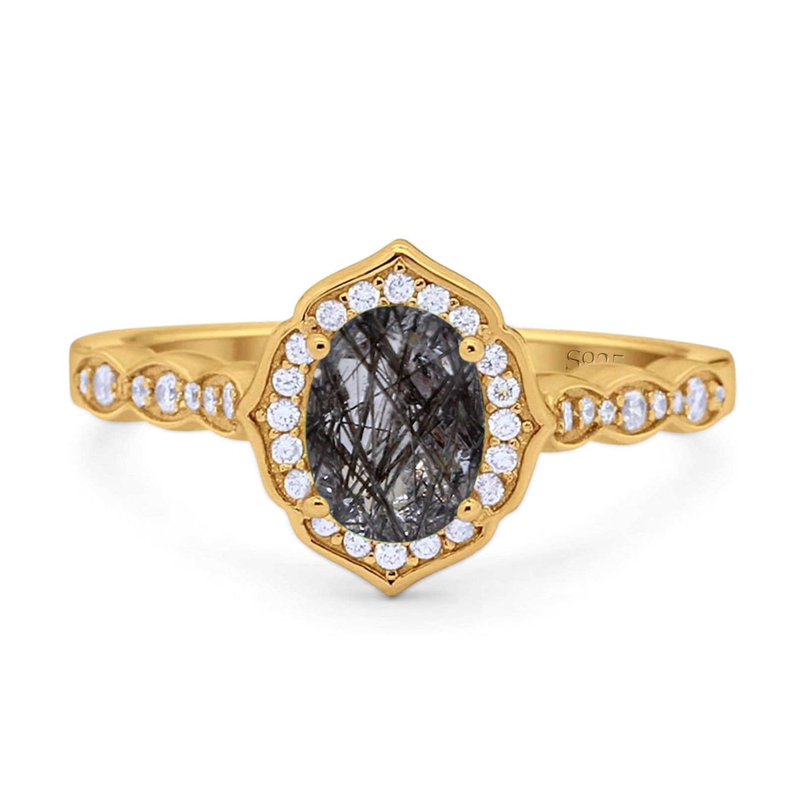 Art Deco Ring Oval Natural Rutilated Quartz Floral Ring 925 Sterling Silver