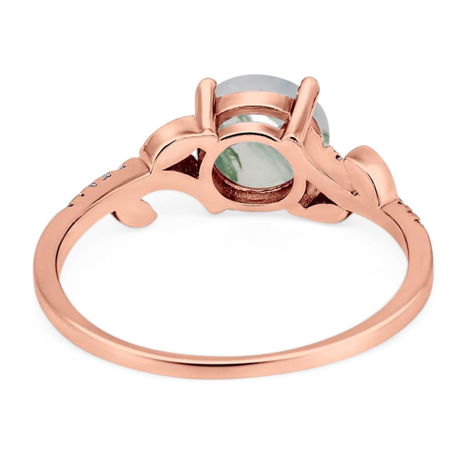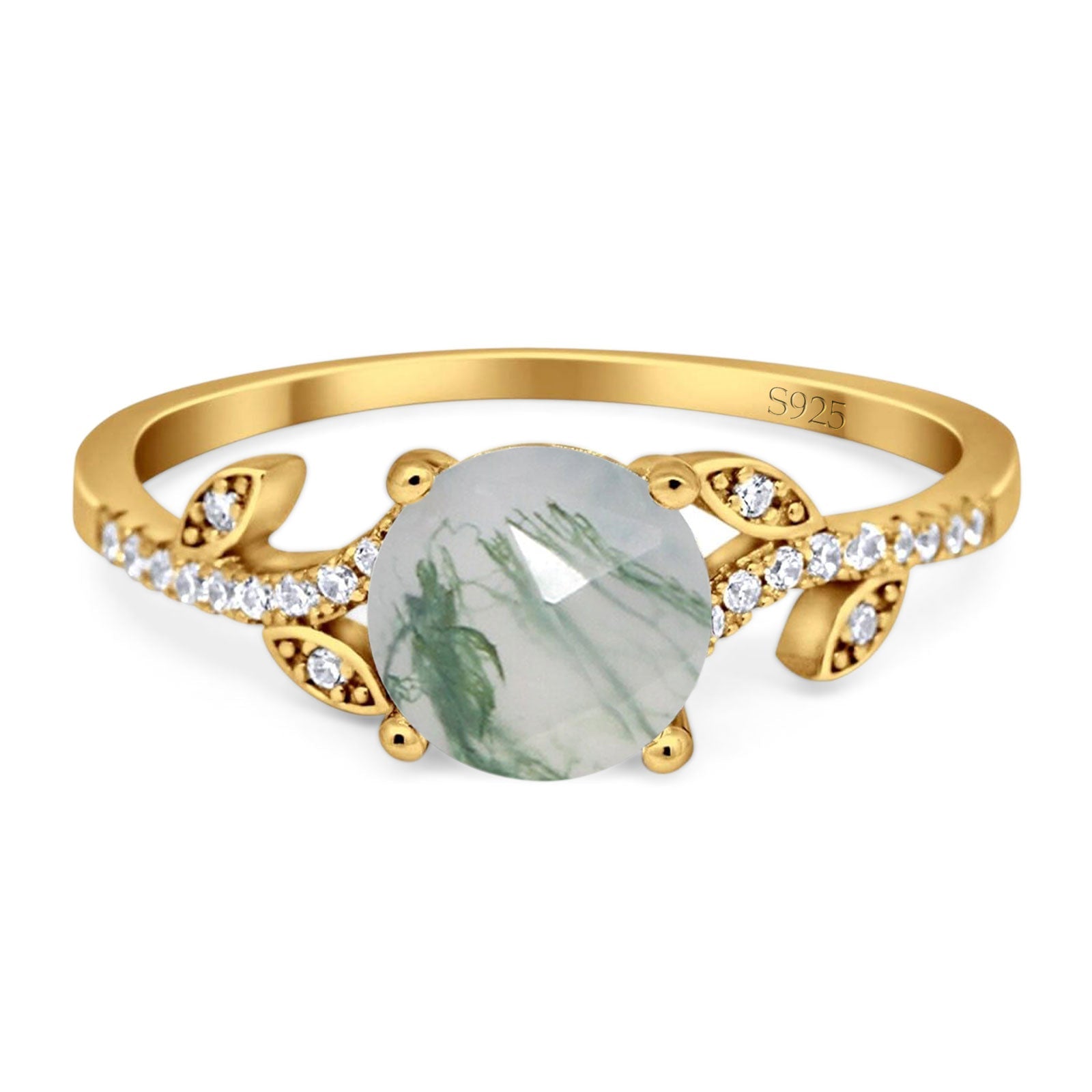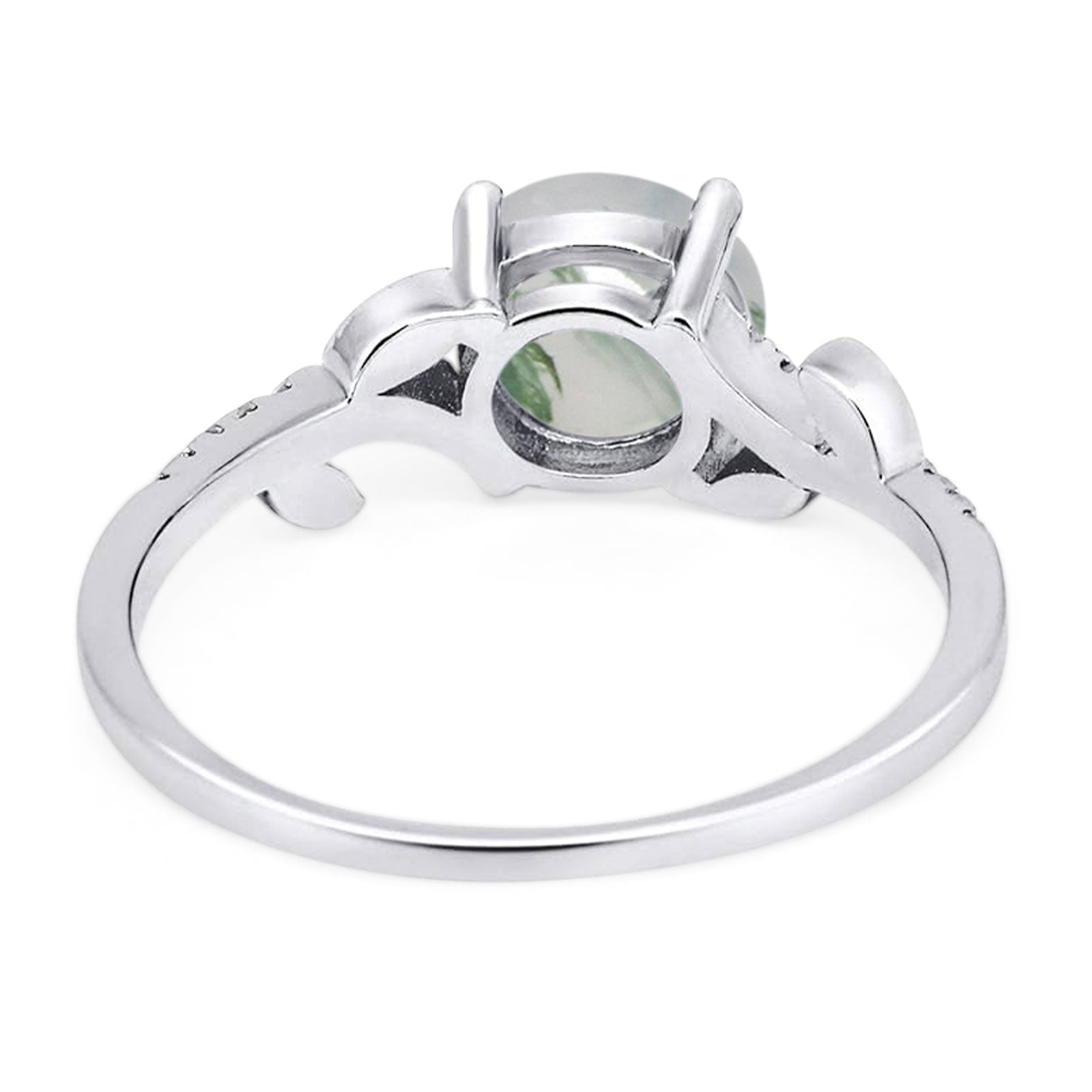Art Deco Ring Round Natural Green Moss Agate Leaf Style Ring 925 Sterling Silver