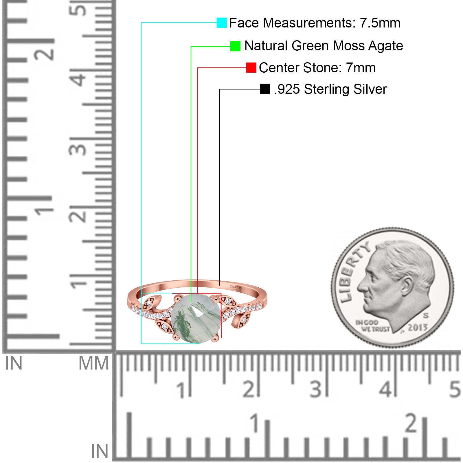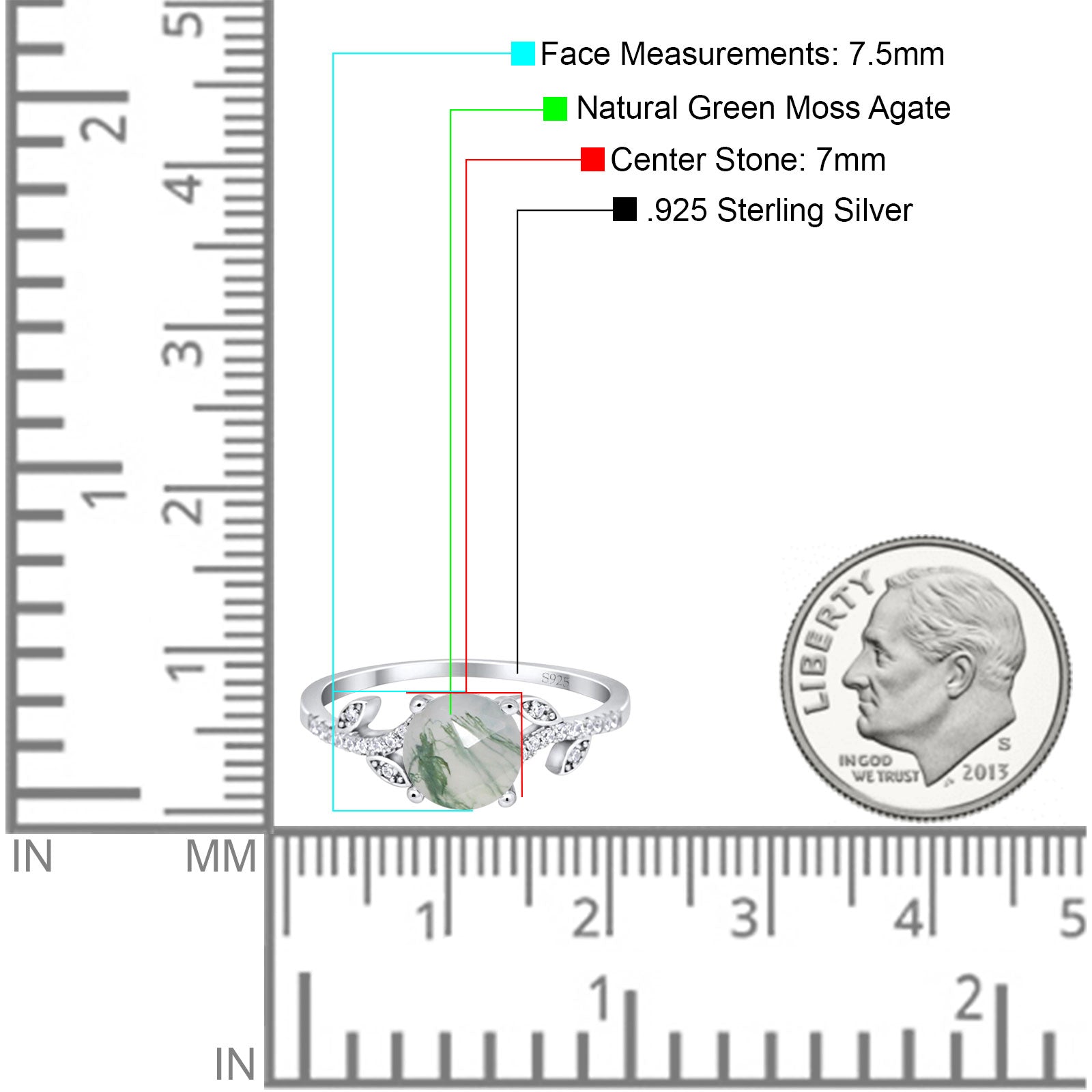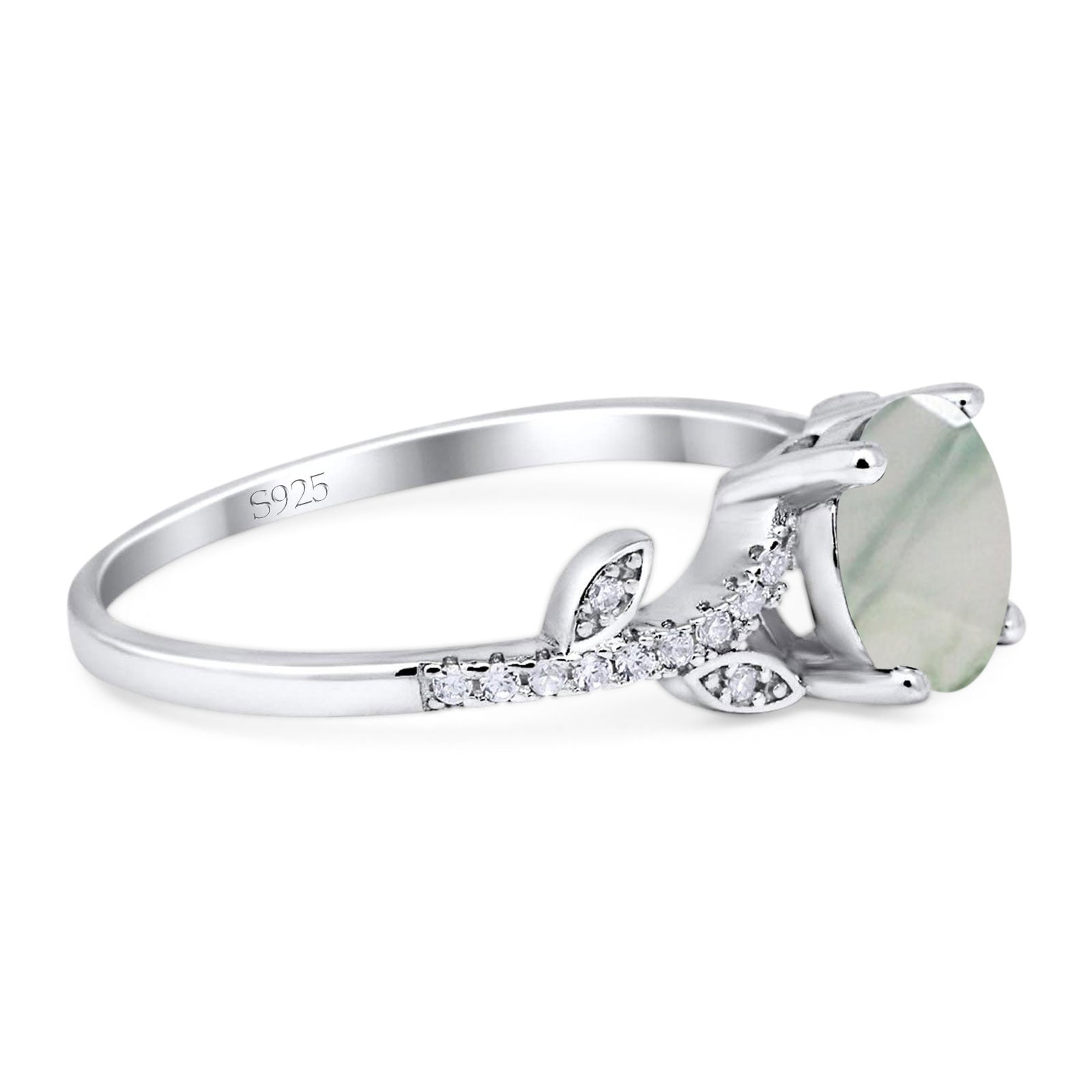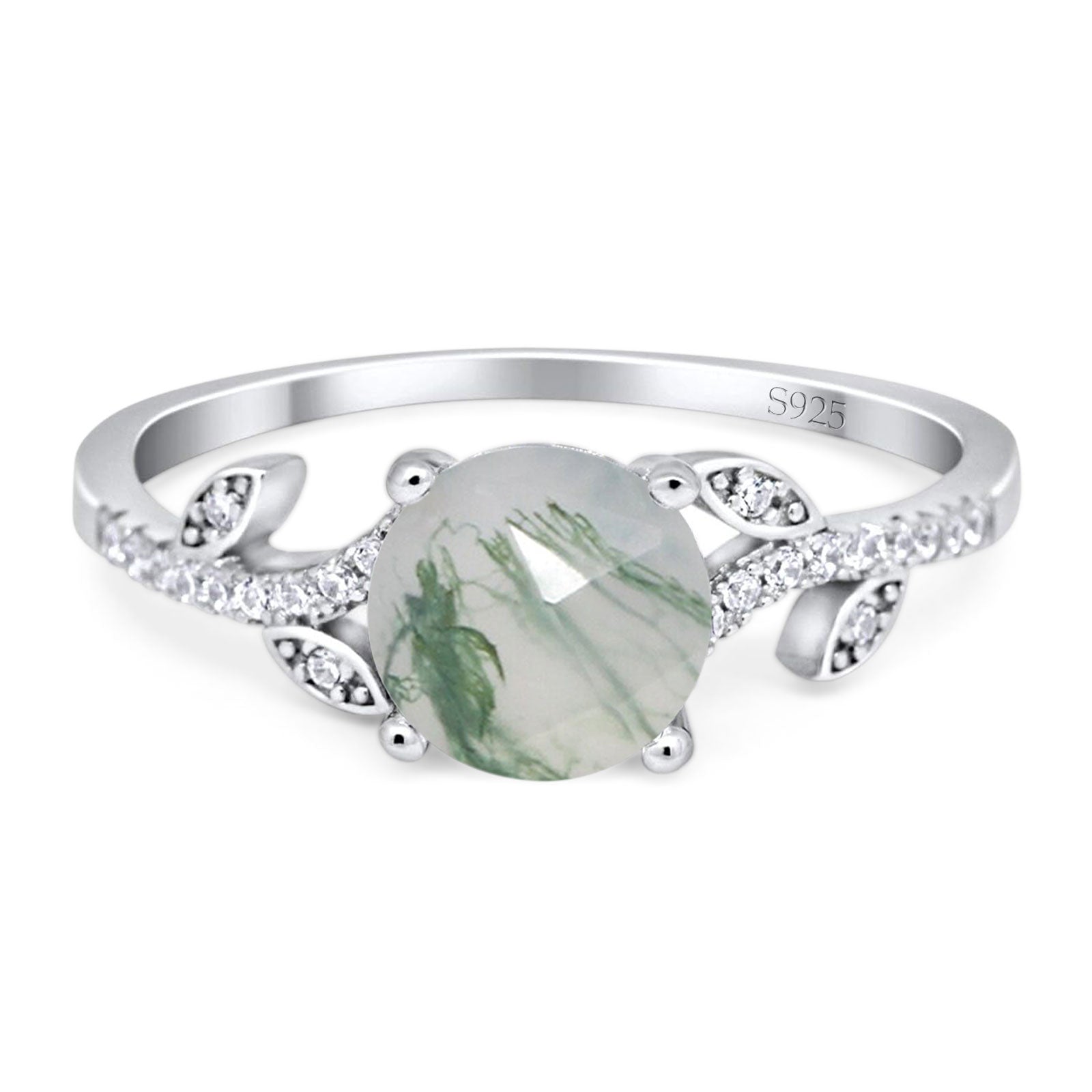 Art Deco Ring Round Natural Green Moss Agate Leaf Style Ring 925 Sterling Silver