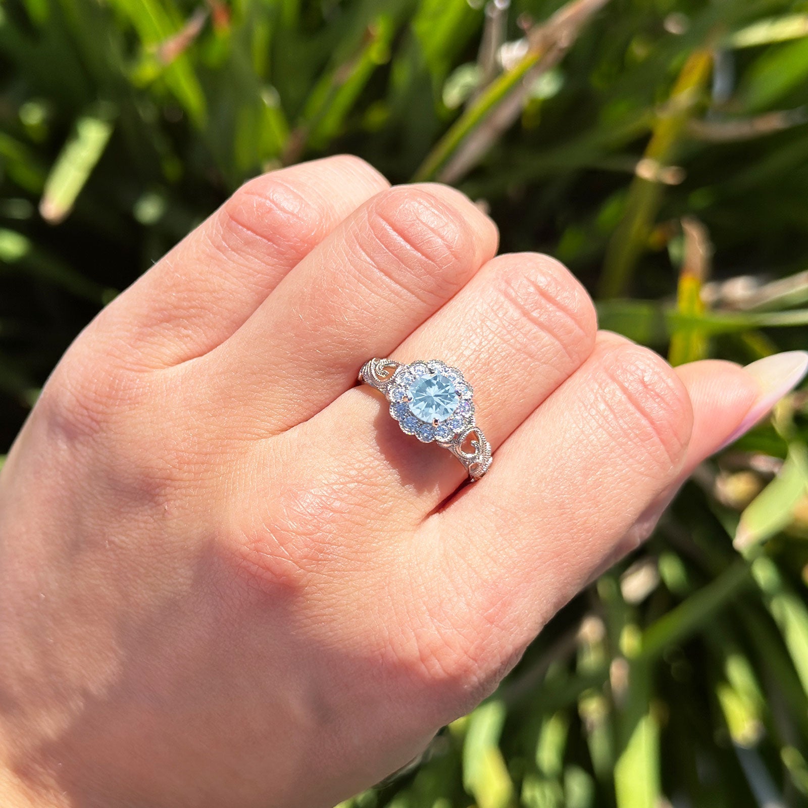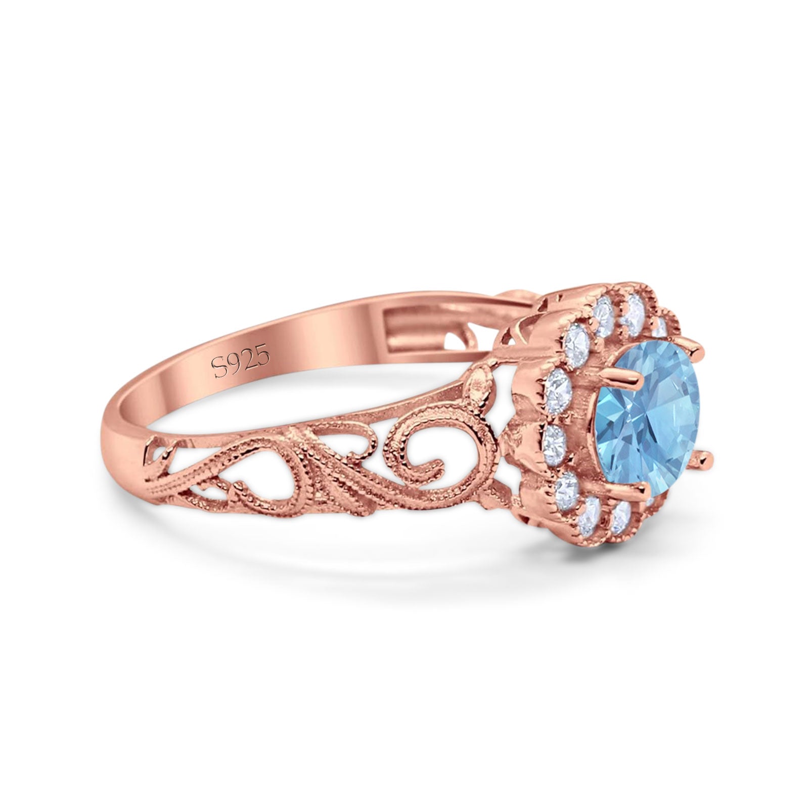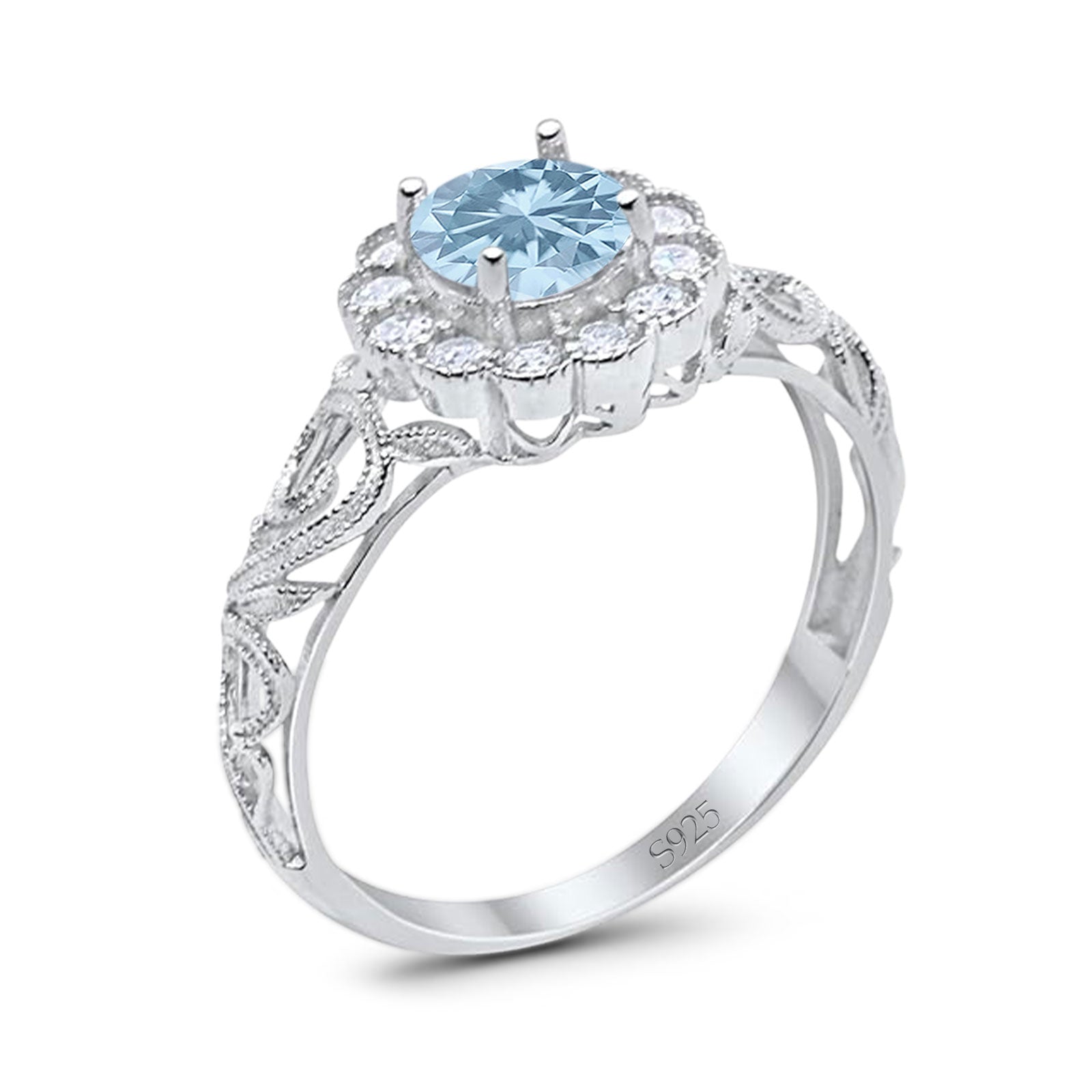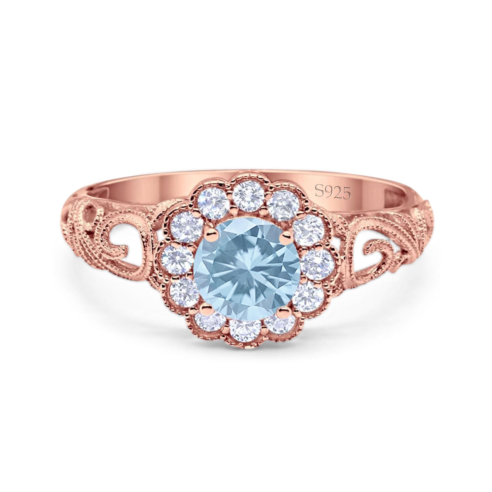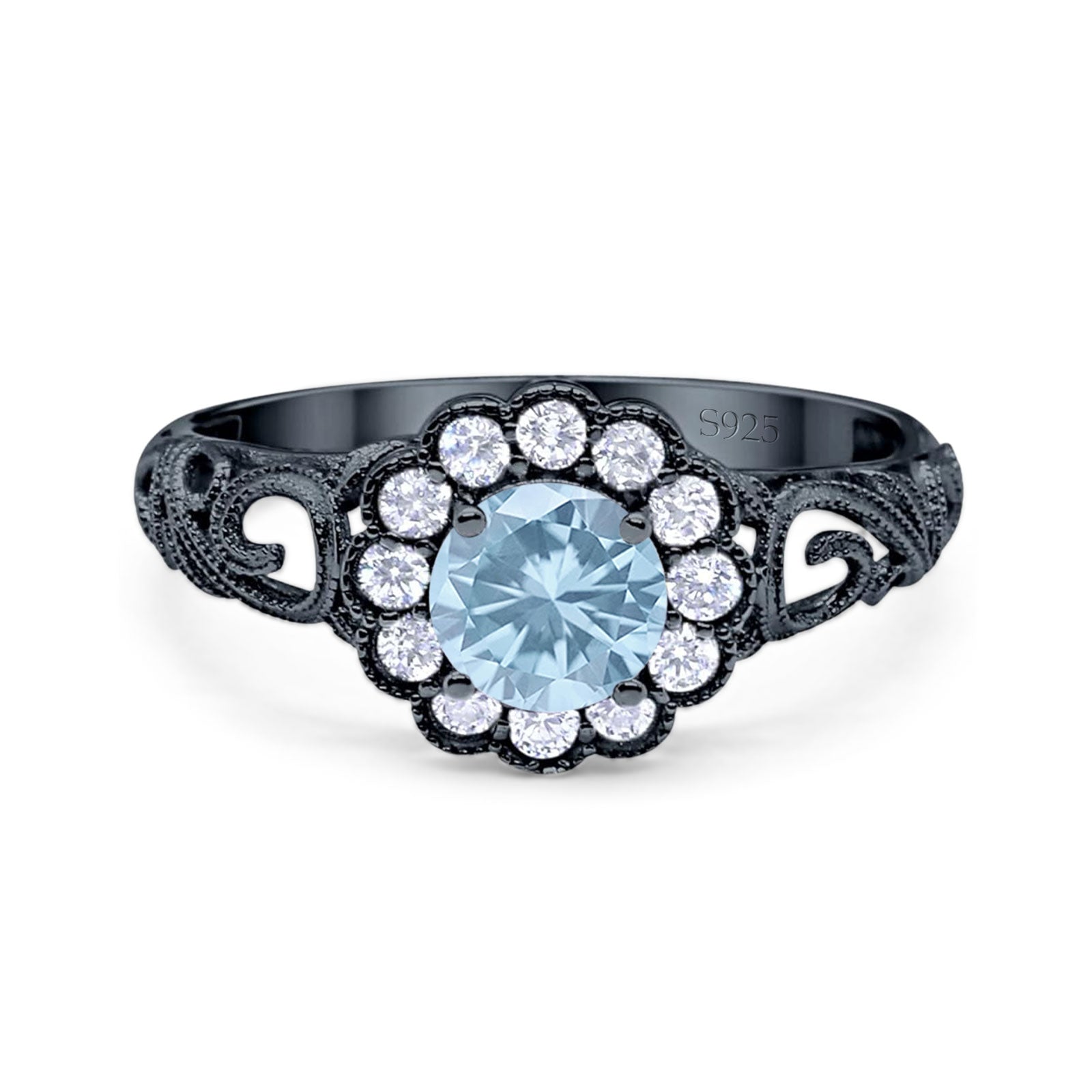 Art Deco Round Natural Aquamarine Flower Ring 925 Sterling Silver