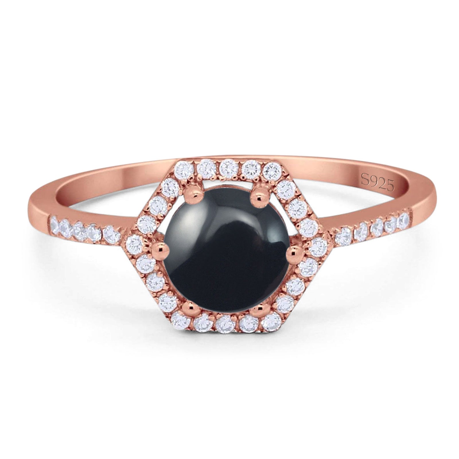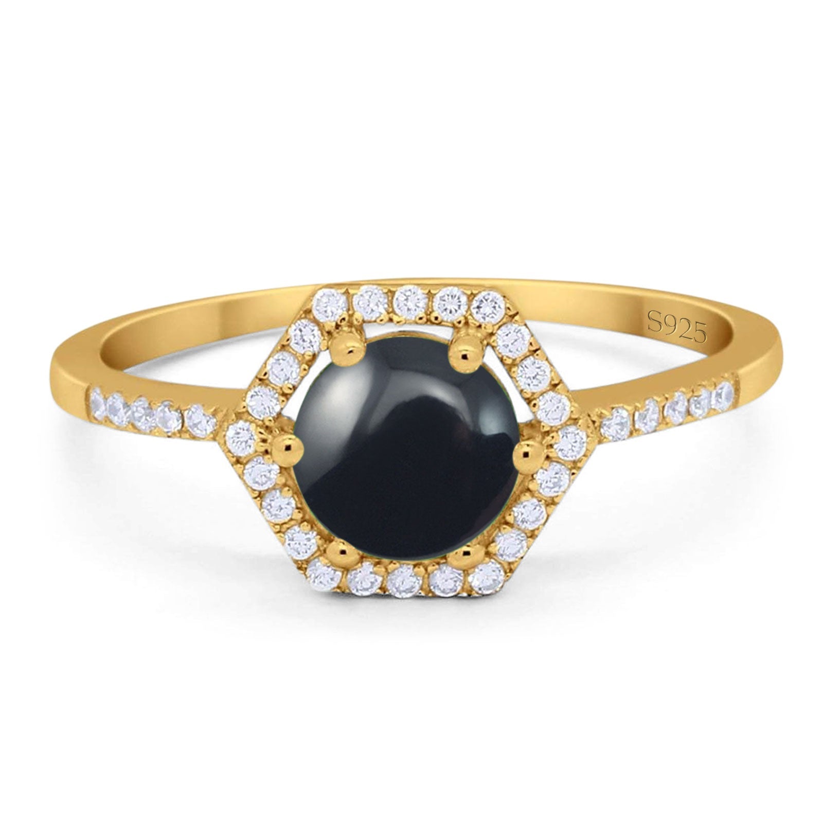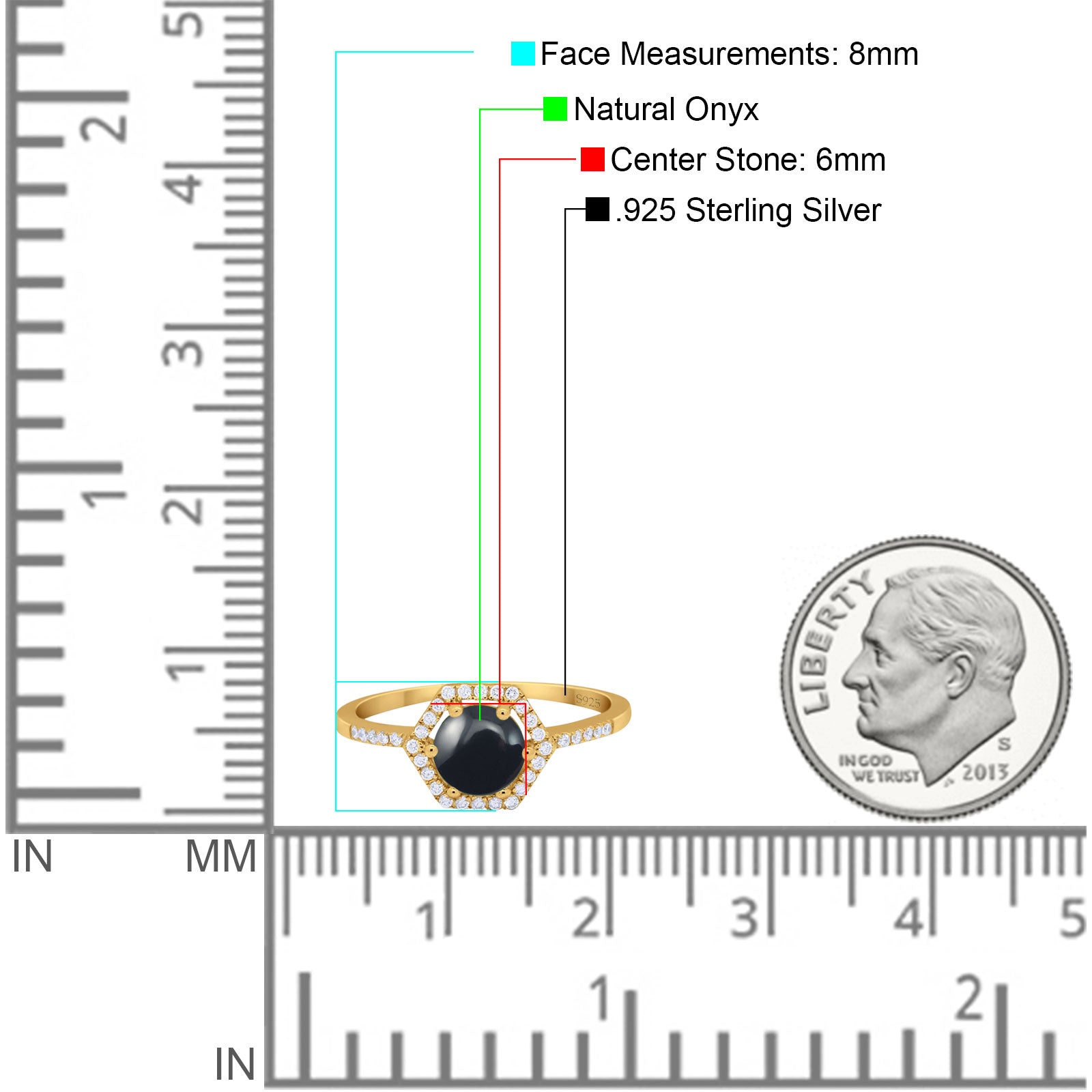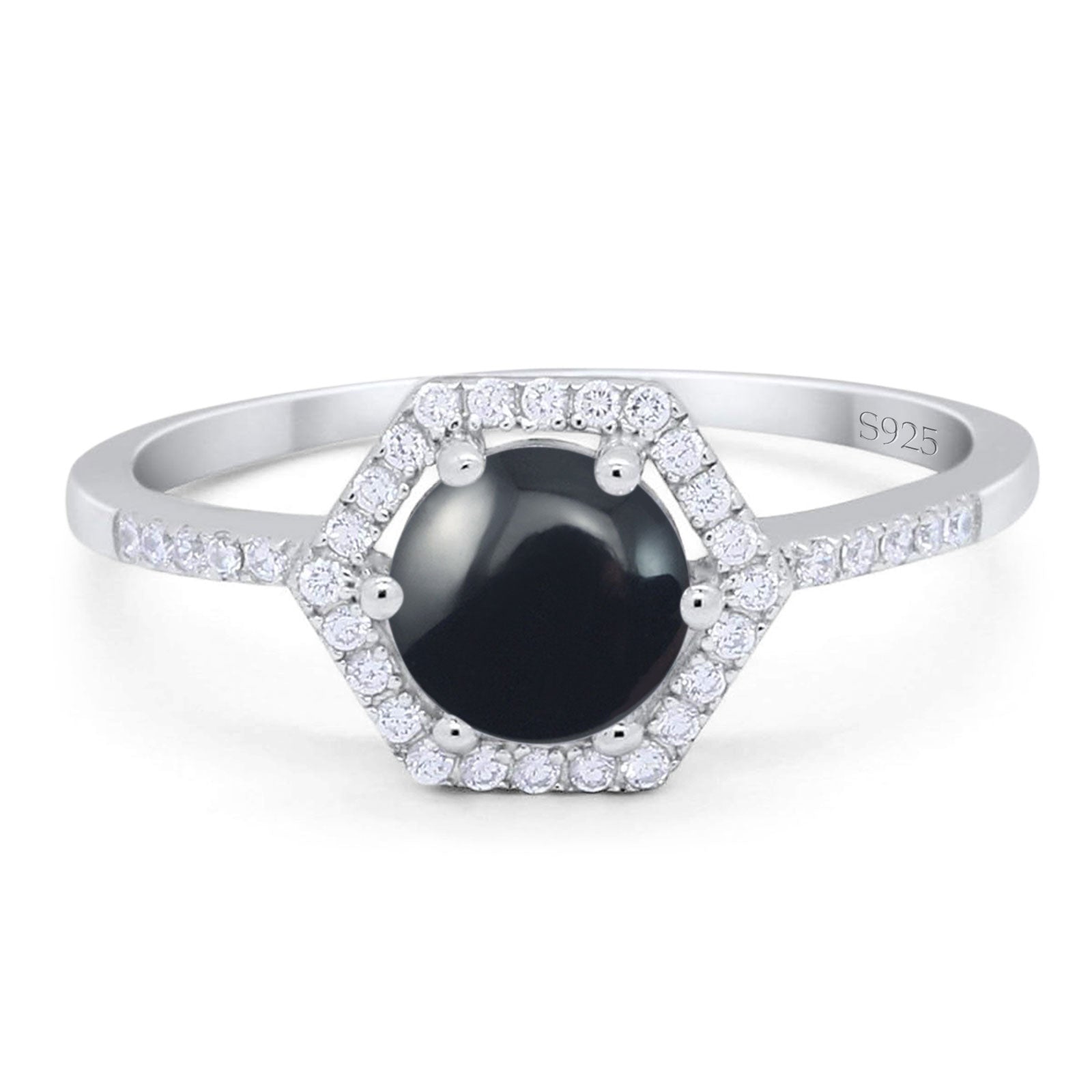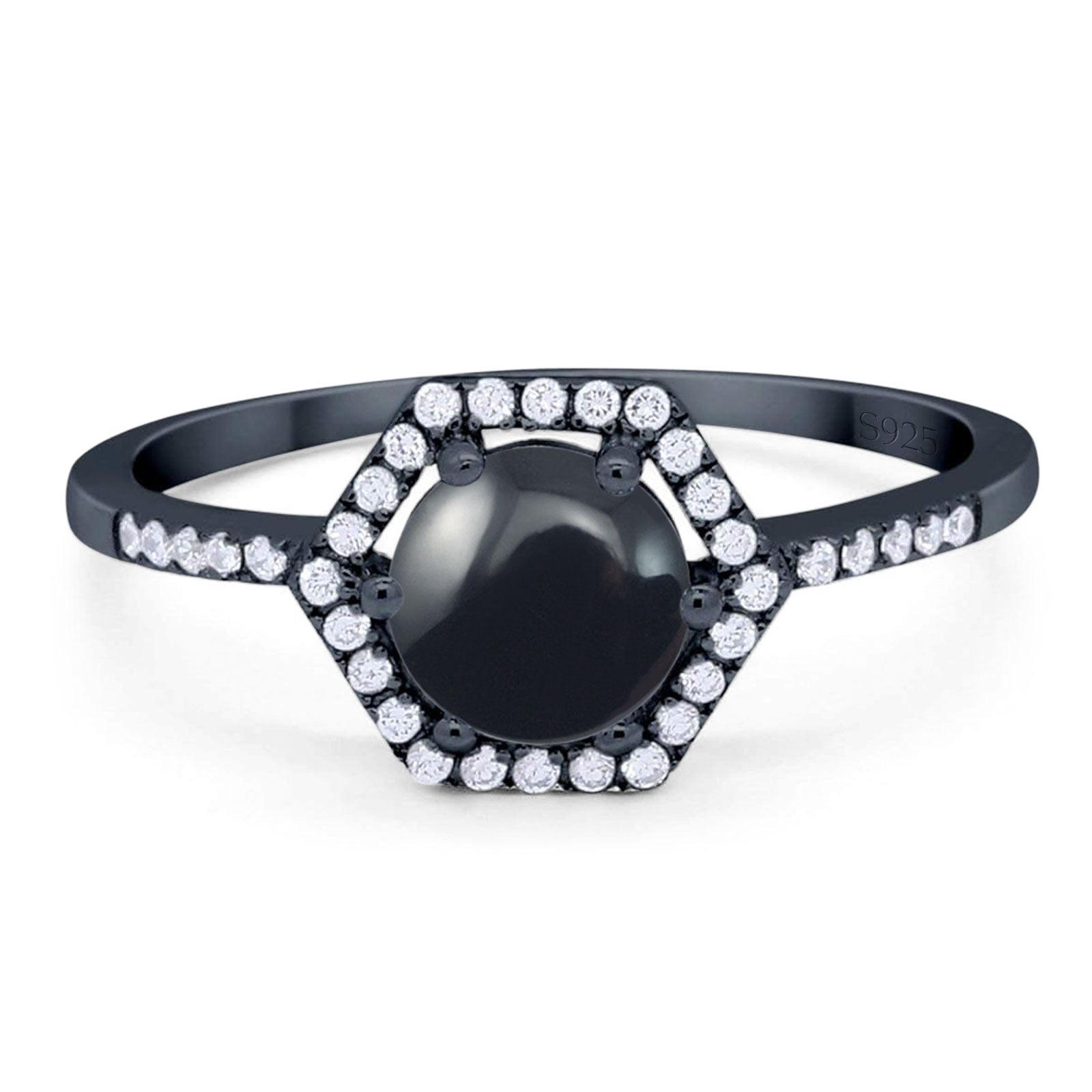Art Deco Round Natural Black Onyx Hexagonal Ring 925 Sterling Silver