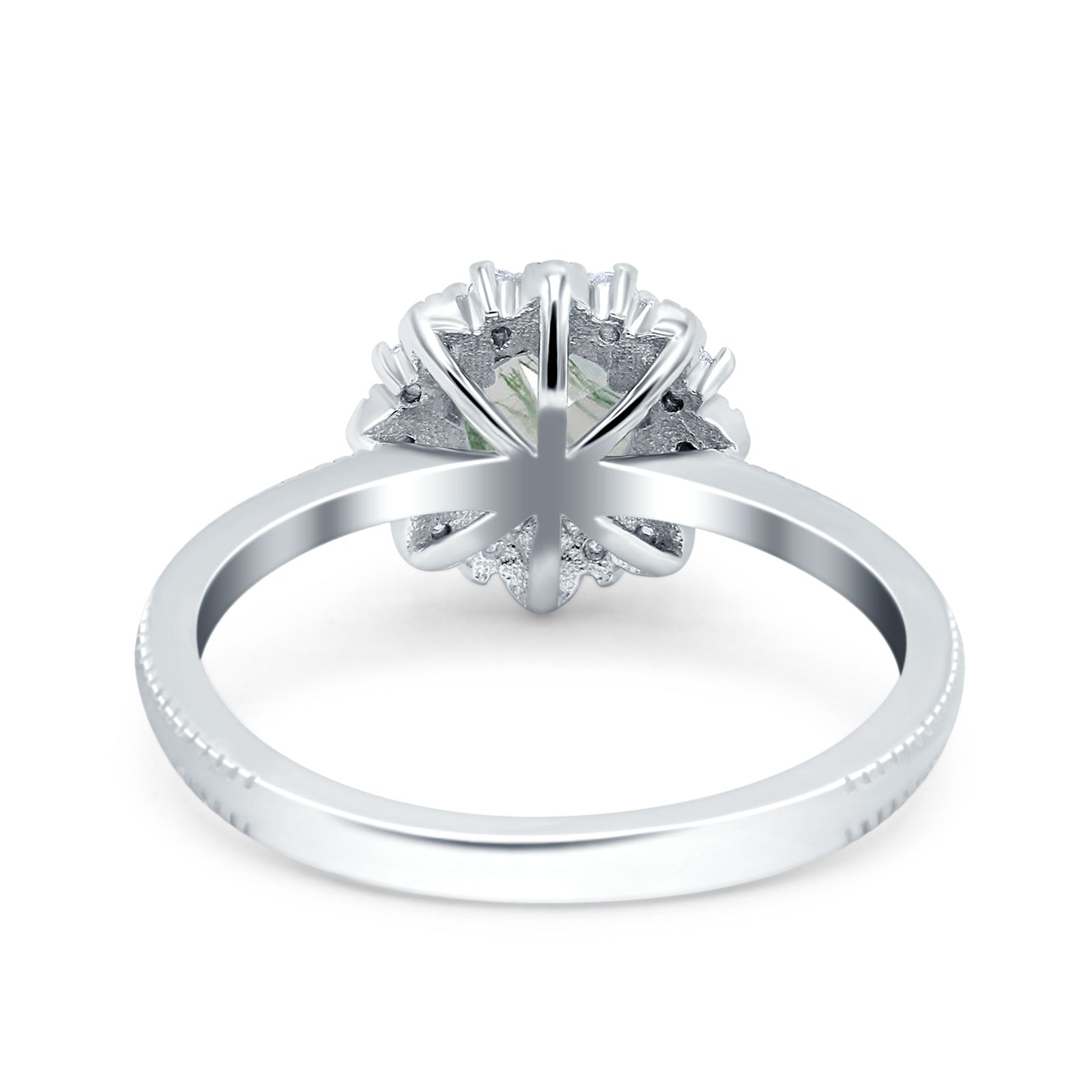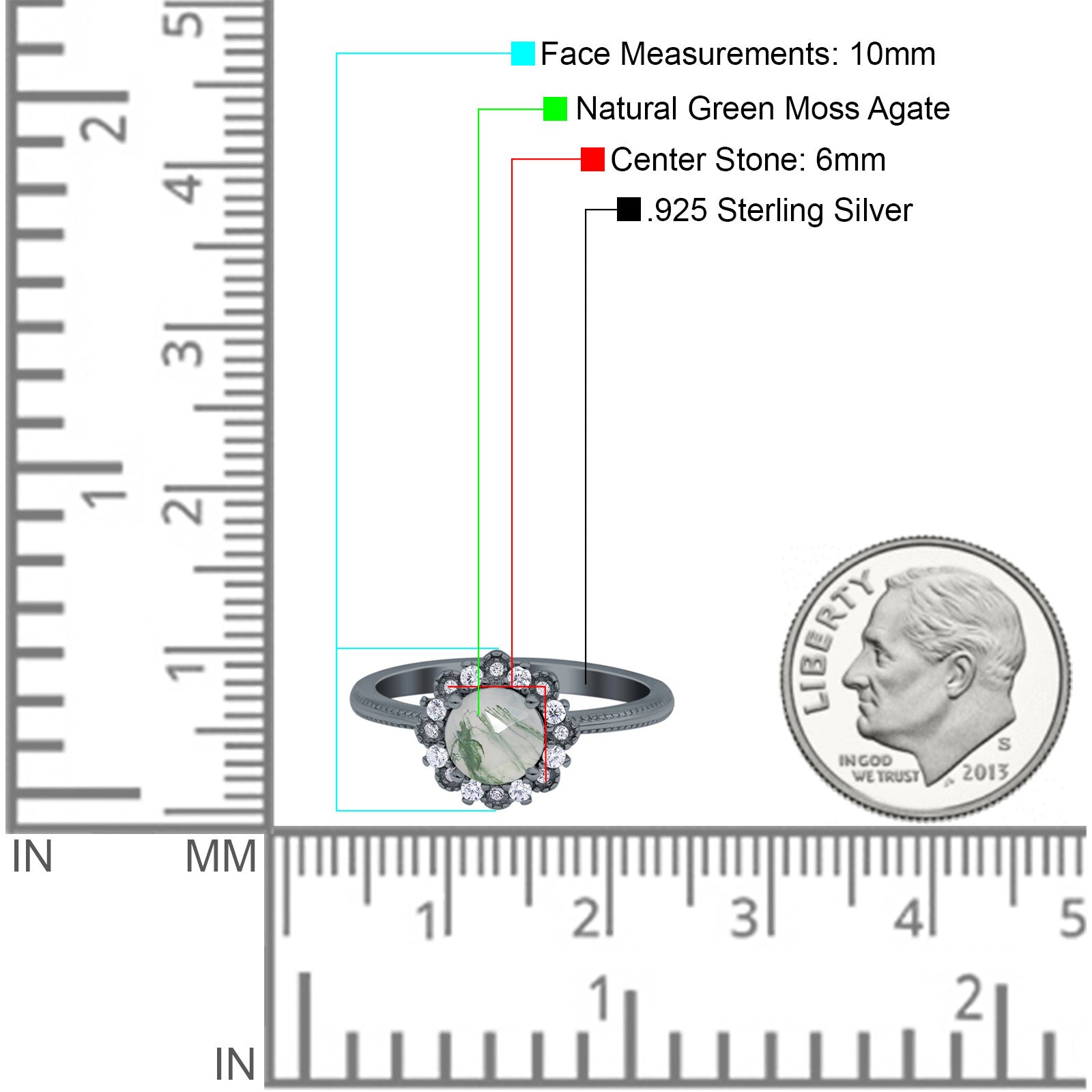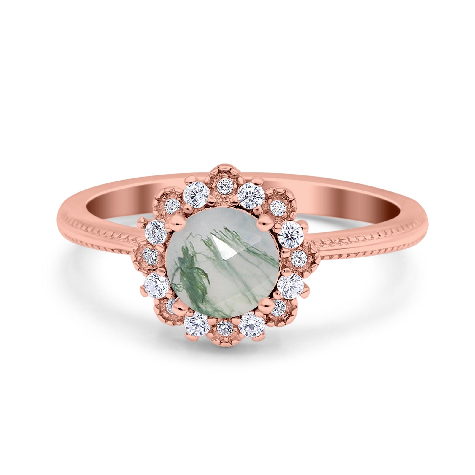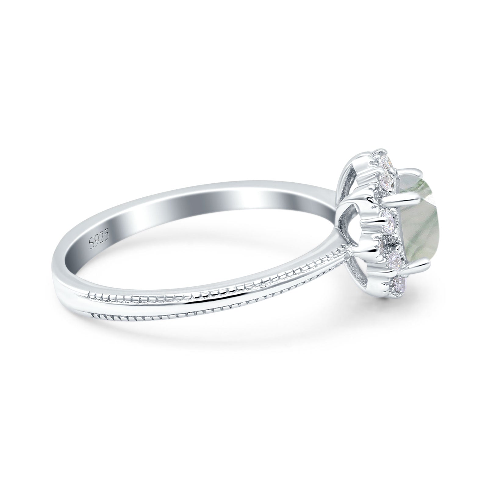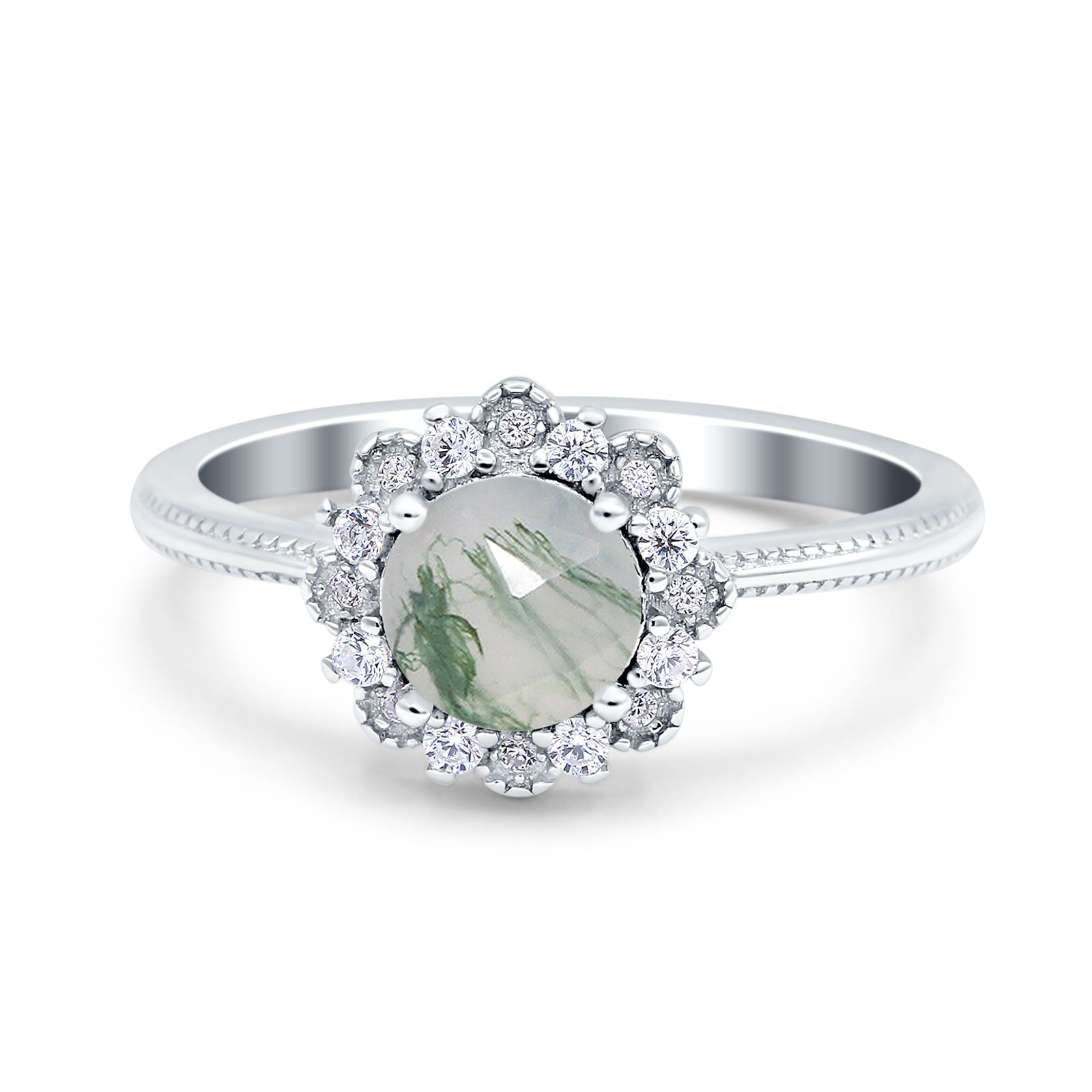 Art Deco Round Natural Green Moss Agate Floral Ring 925 Sterling Silver