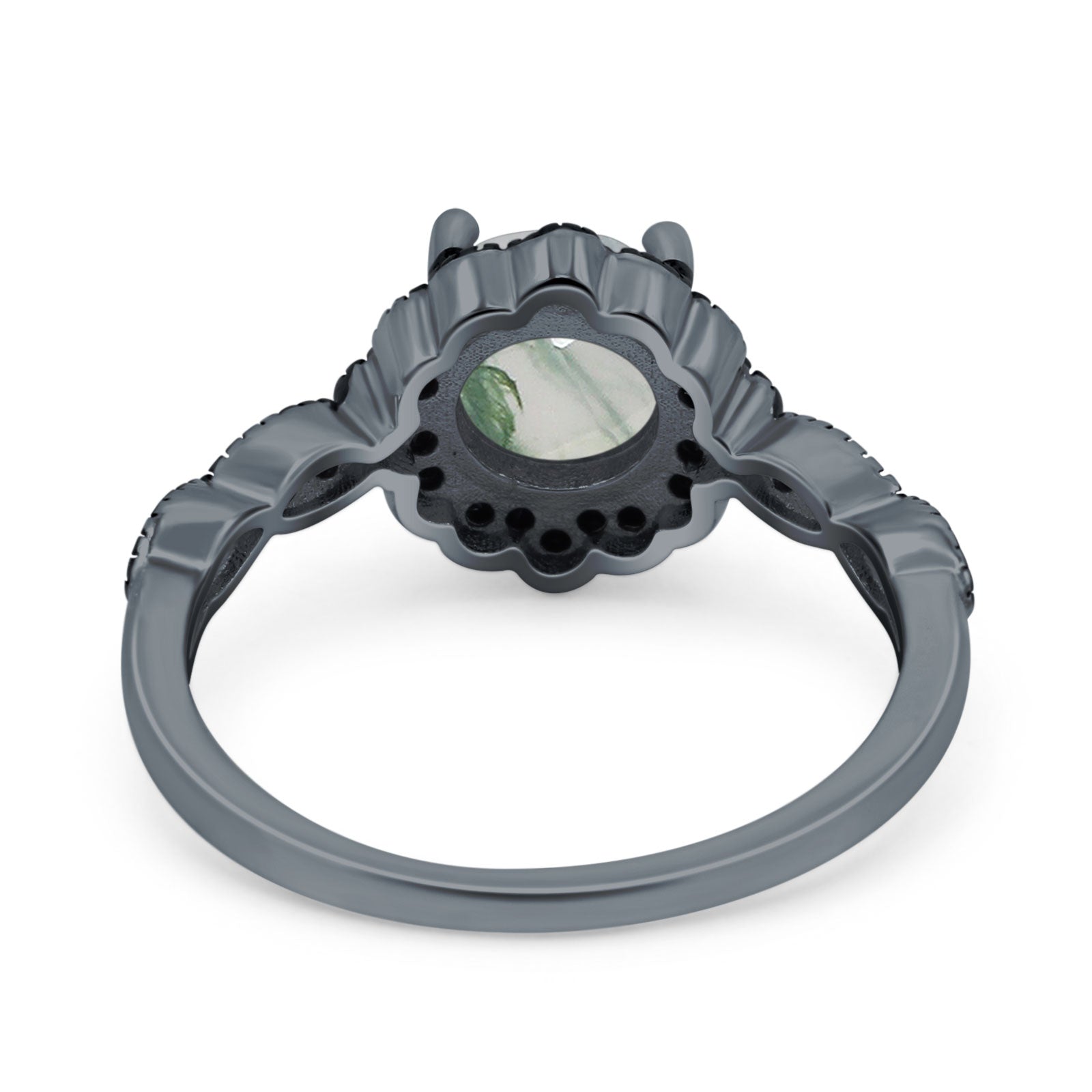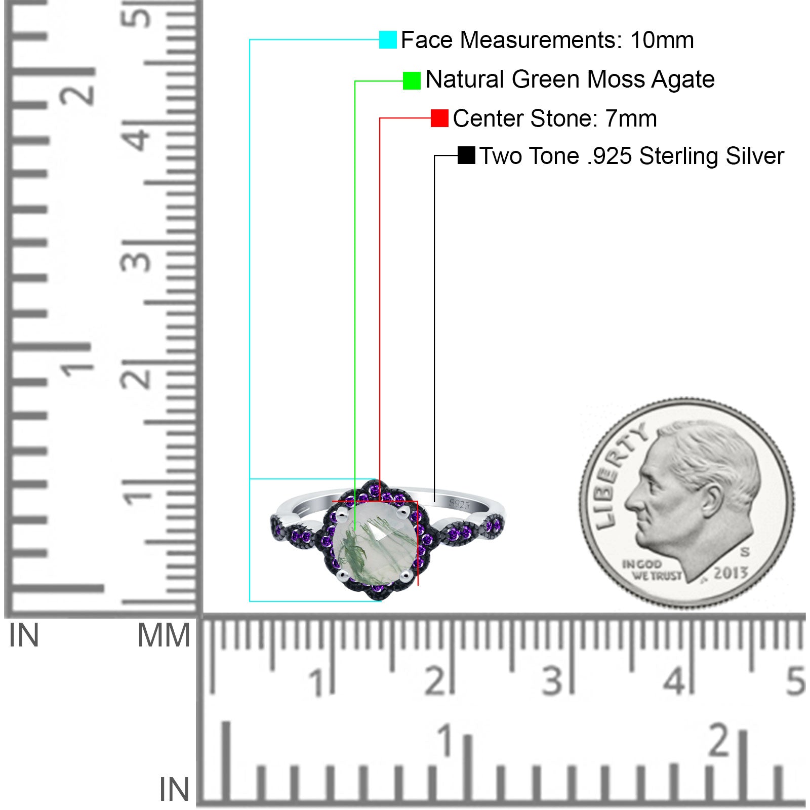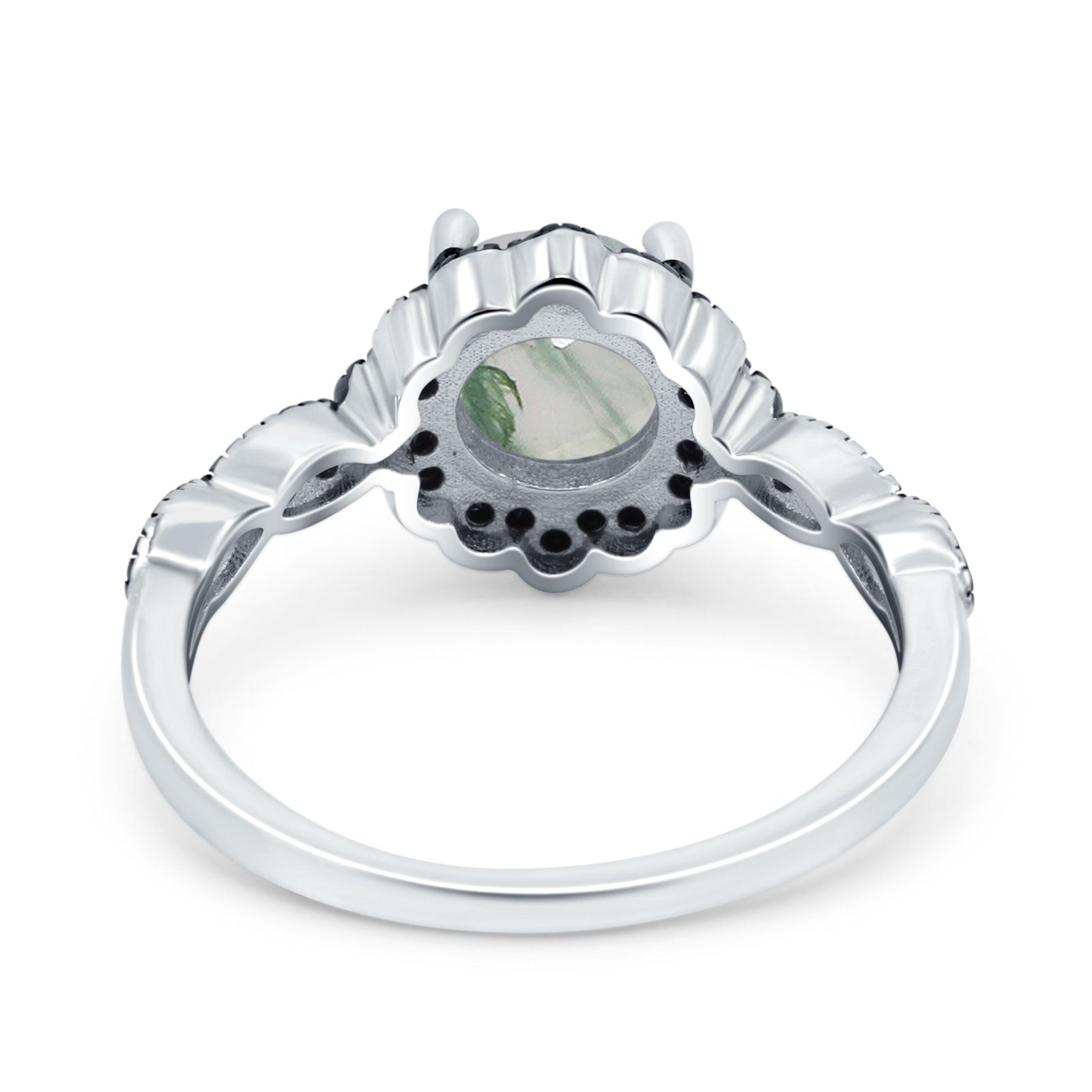 Art Deco Round Natural Green Moss Agate Flower Ring 925 Sterling Silver