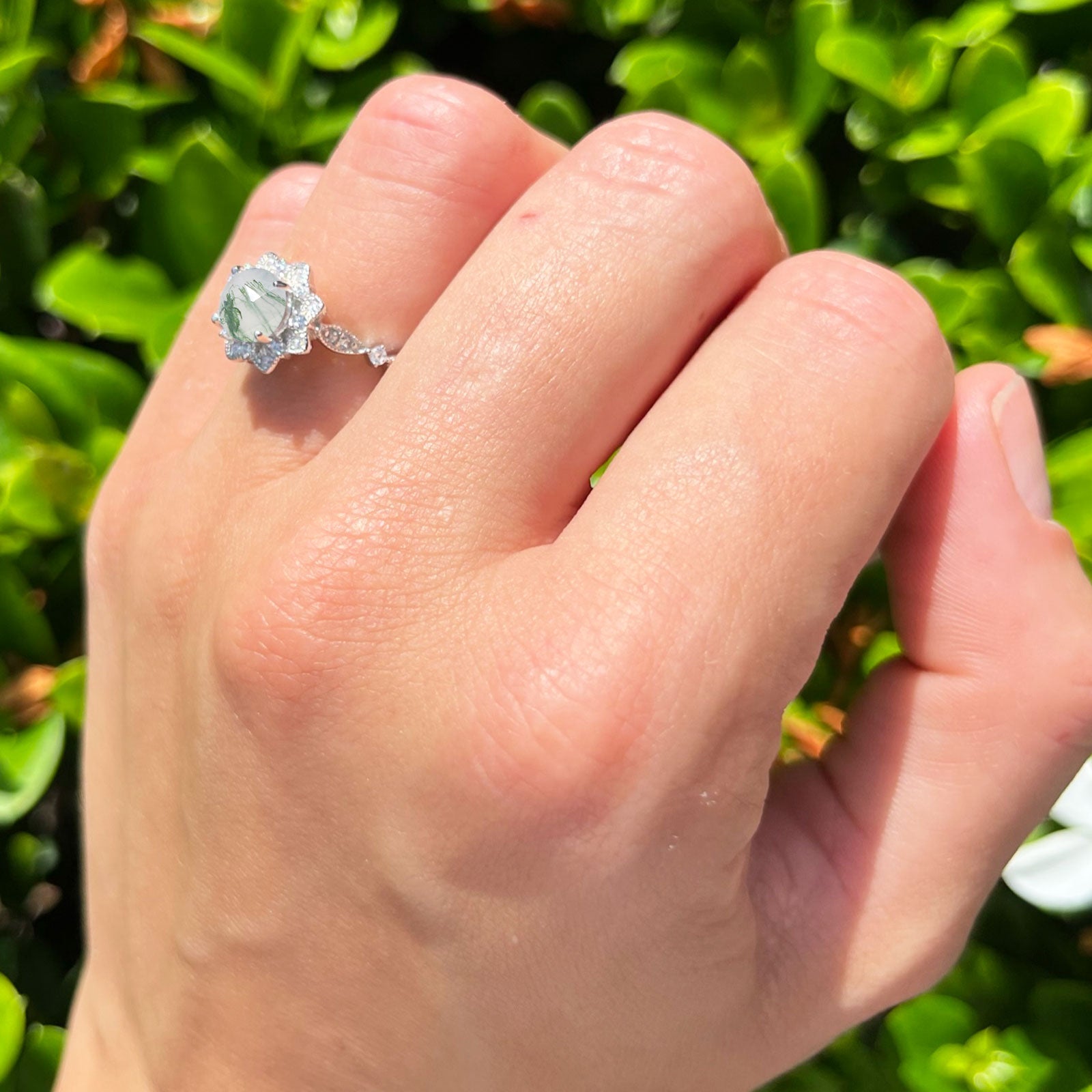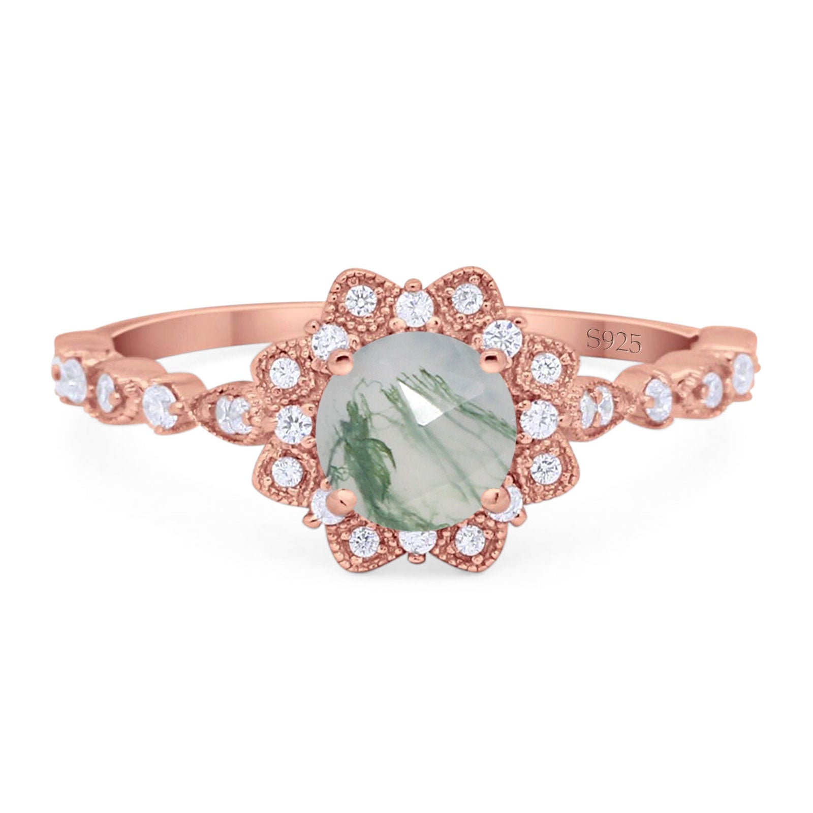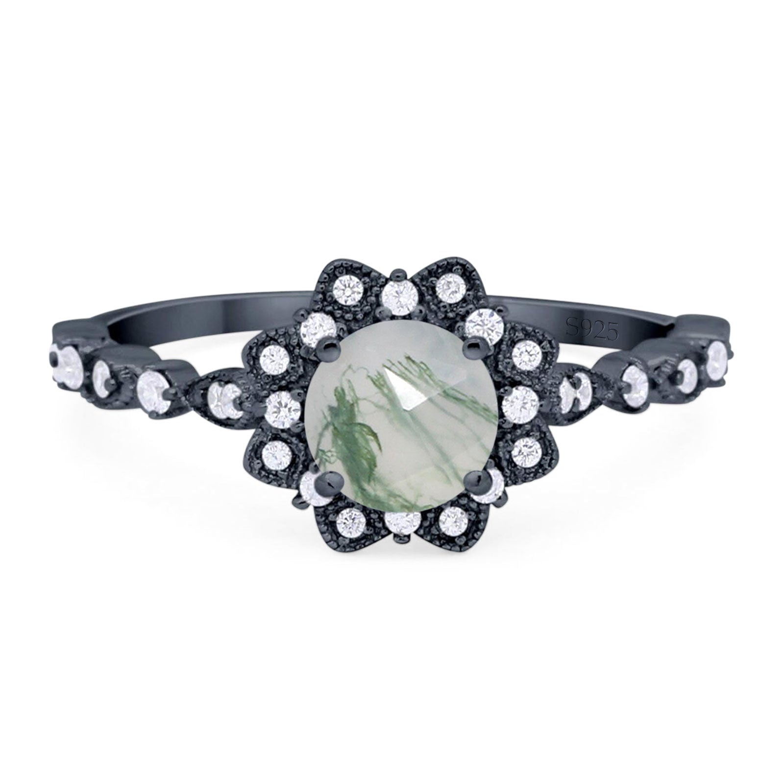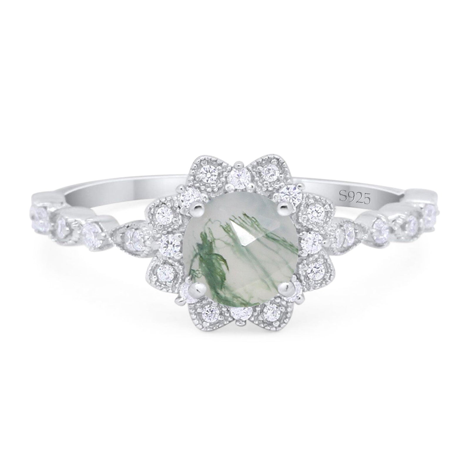 Art Deco Round Natural Green Moss Agate Flower Ring 925 Sterling Silver