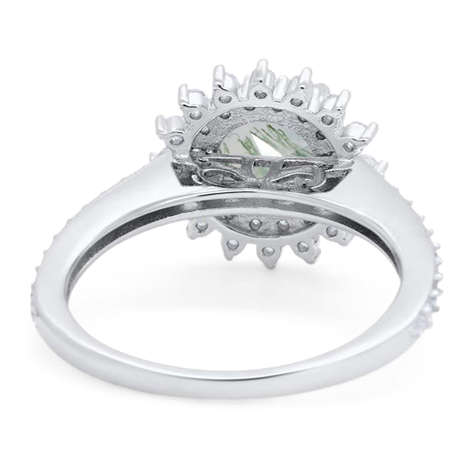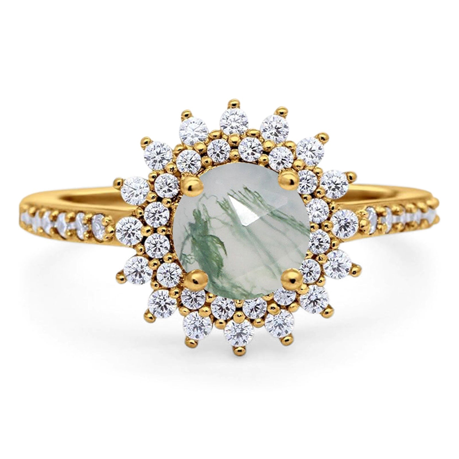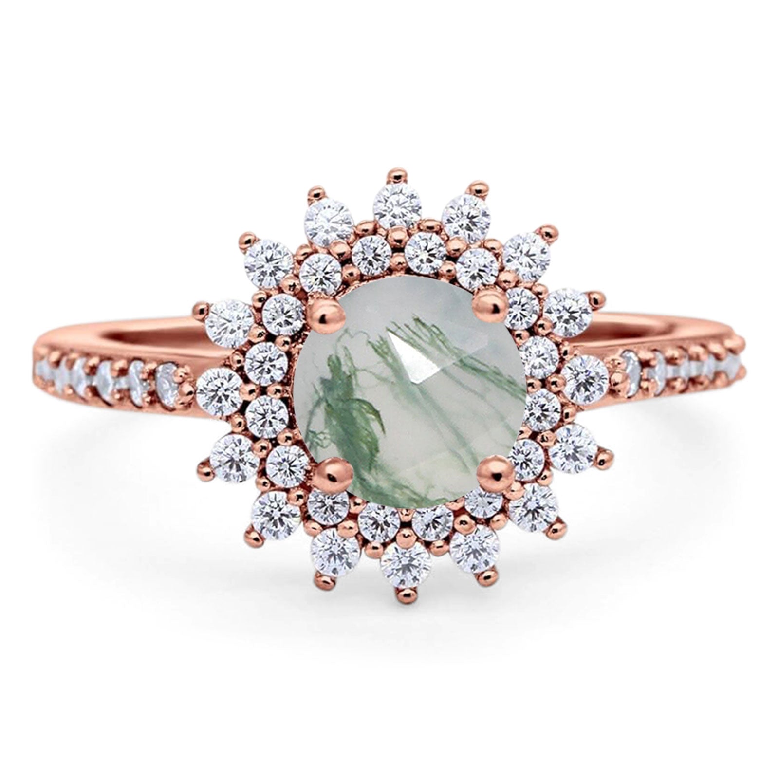 Art Deco Round Natural Green Moss Agate Halo Wedding Flower Ring 925 Sterling Silver