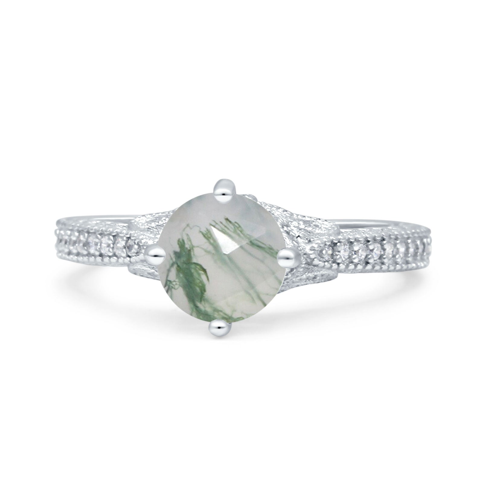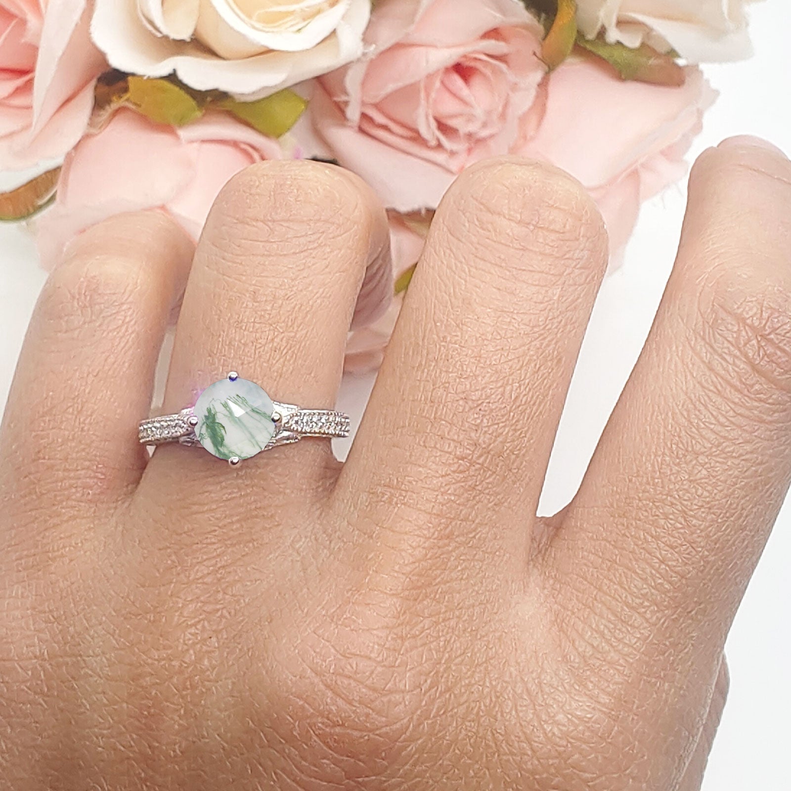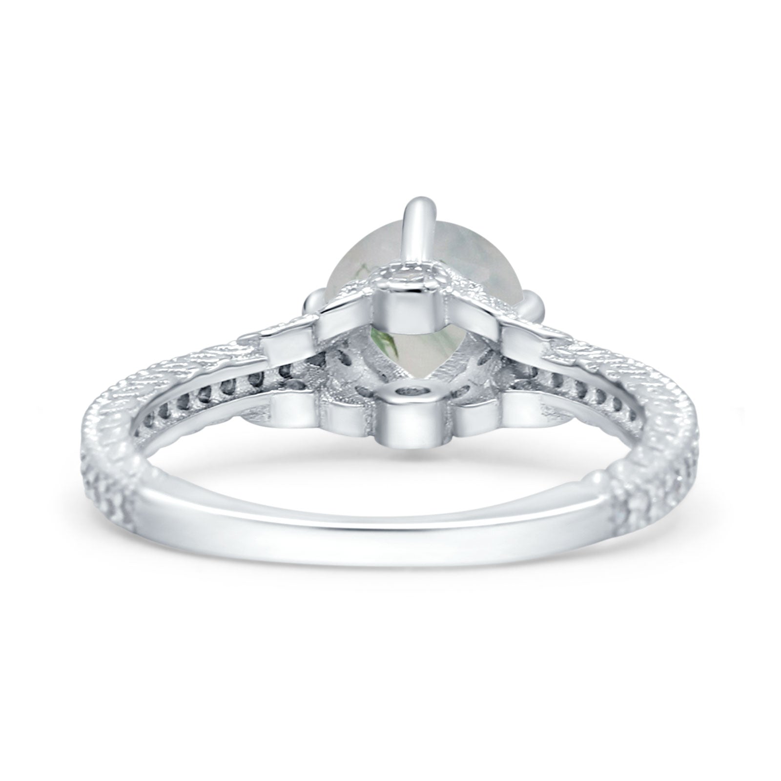 Art Deco Round Natural Green Moss Agate Vinatge Style Cluster Cubic Zirconia 925 Sterling Silver