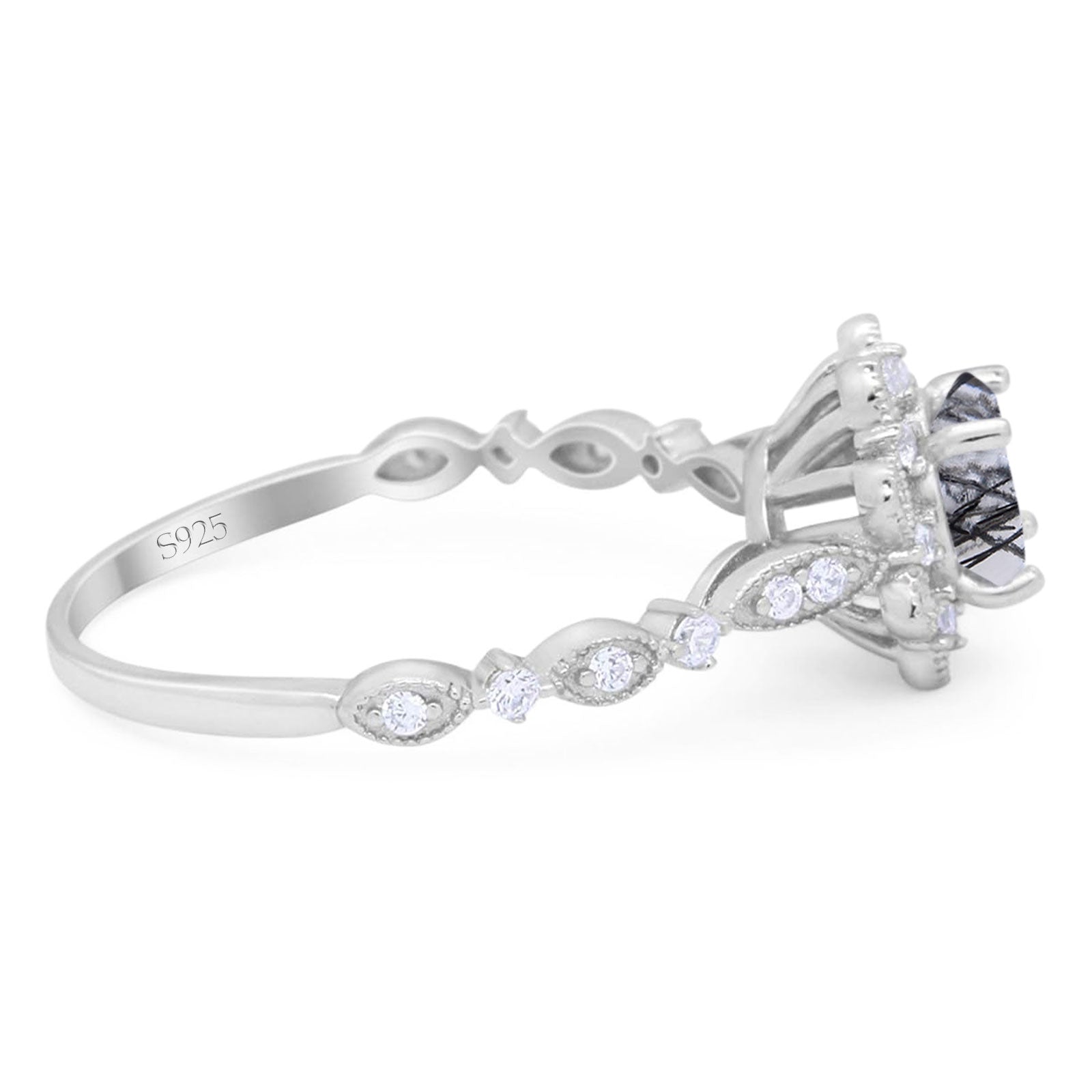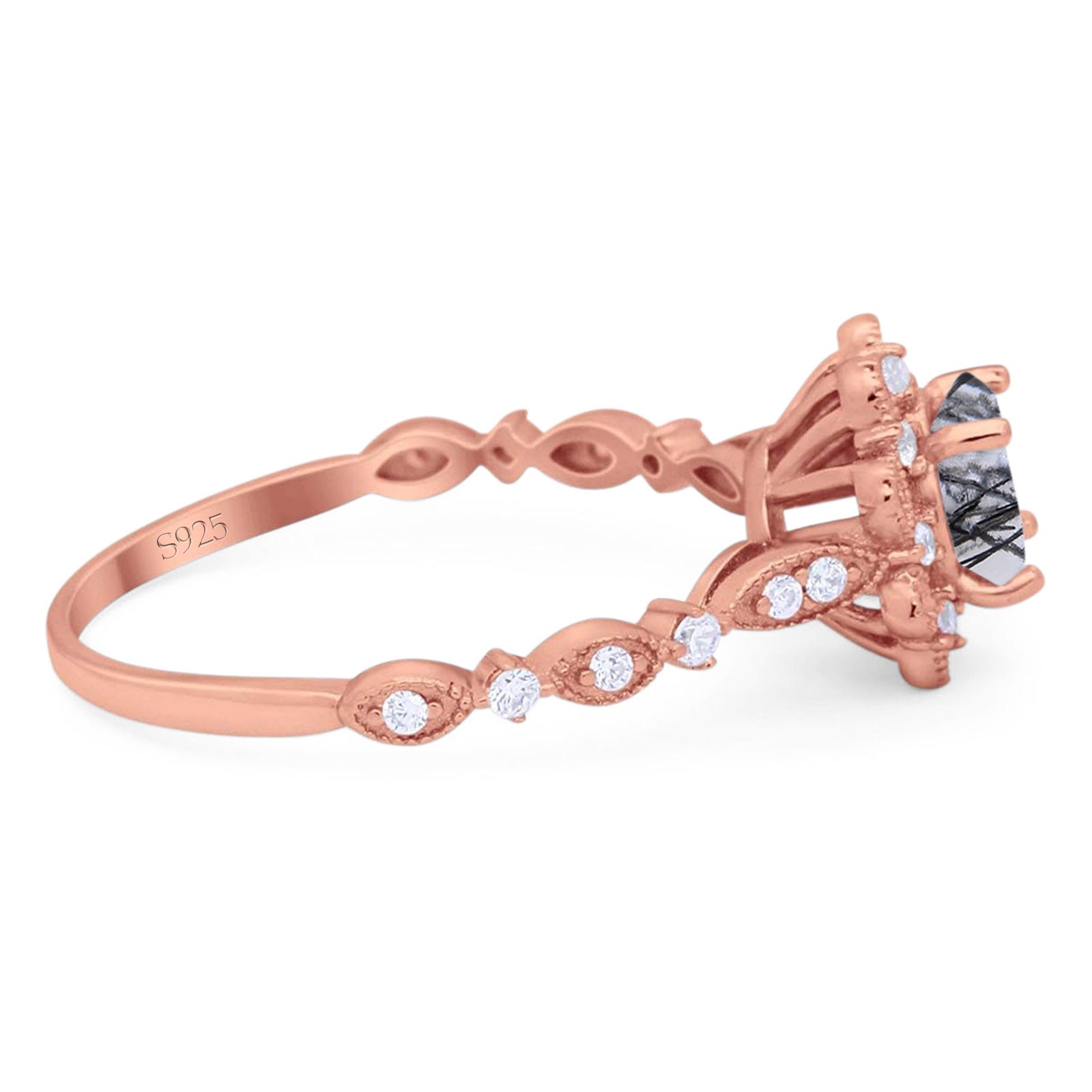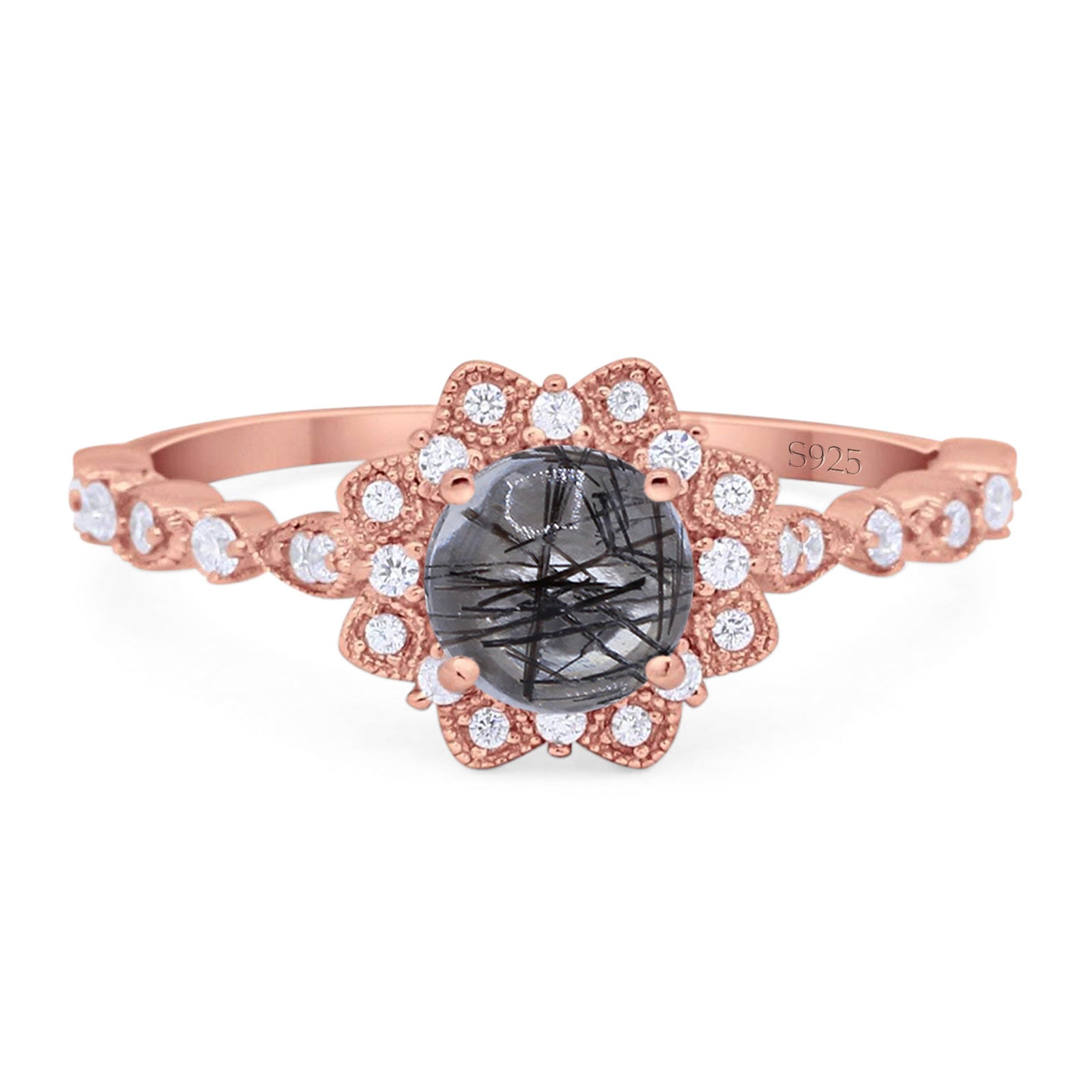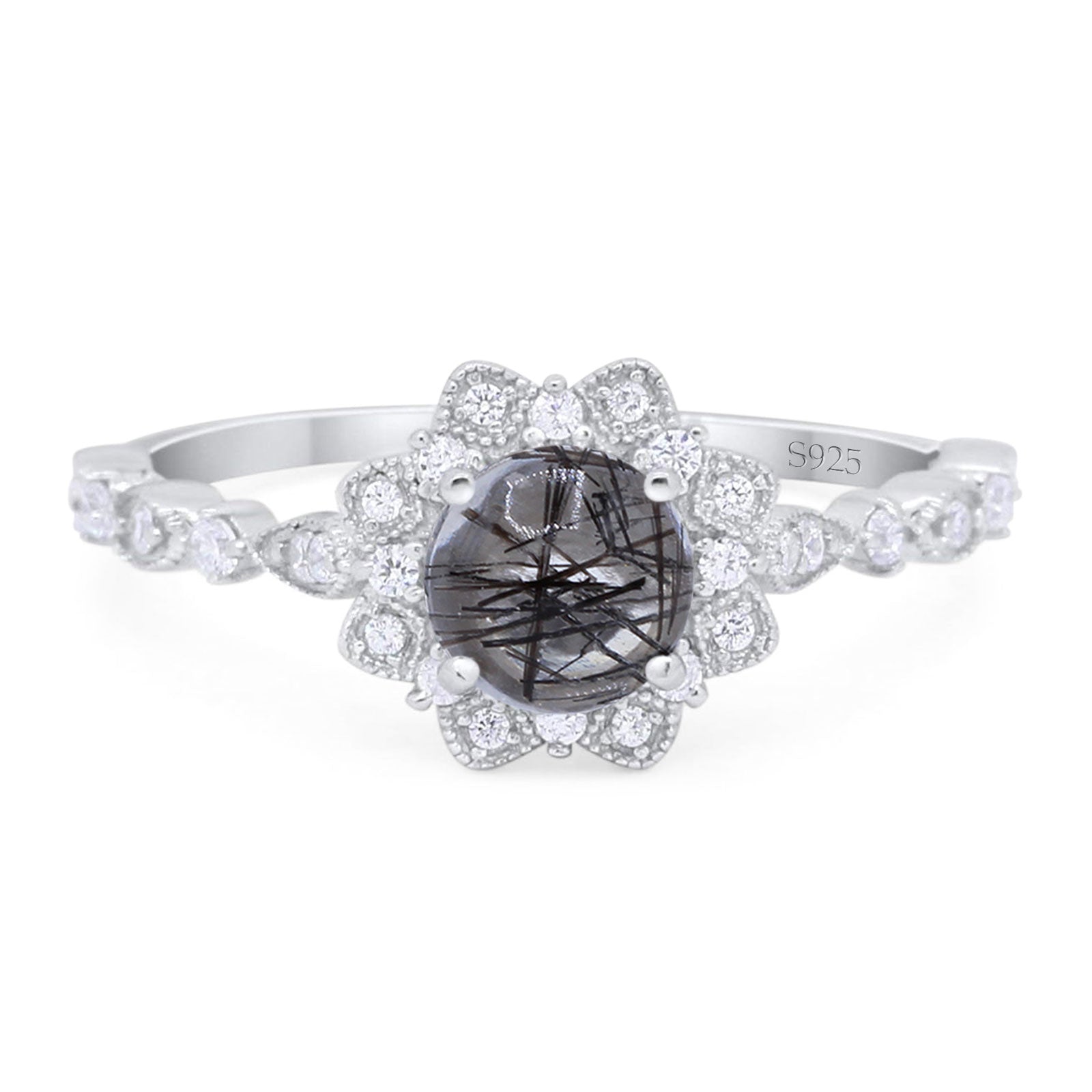 Art Deco Round Natural Rutilated Quartz Flower Ring 925 Sterling Silver